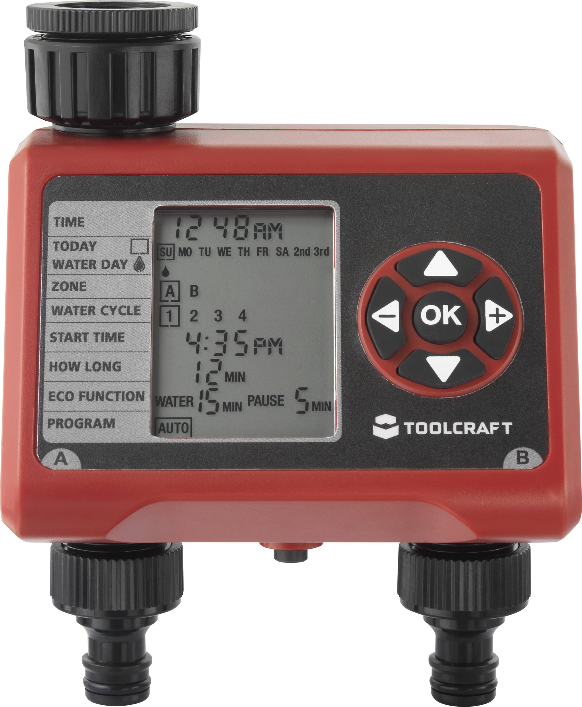 Programmateur Arrosage Duo Gardena 01893-34 Commande Arrosage Avec Deux Sorties Arrosage Automatique Jardin Fréquence Réglable Programme Arrosage Automatique Programmateur D'arrosage BWC-200 Avec 2 Raccords Pour Tuyau Gardena Arrosage Programmateur d'arrosage TOOLCRAFT Duo TO-7153944 Programmateur d'arrosage Duo Commande simple de 2 zones d'arrosage différentes avec deux vannesProgramme... La durée de l'arrosage peut aller d'une minute à un peu moins de quatre heures, le démarrage de la séquence pouvant être défini individuellement. Il est toujours possible d'arroser manuellement à tout moment et de suspendre le programme pendant une période de douze heures à sept jours, en cas de pluie par exemple. Particulièrement pratique : l'appareil émet un signal sonore en cas de batterie faible et est protégé contre les projections d'eau (IPX4). Votre jardin arrosé automatiquement Imaginez la scène : vous vous détendez dans le jardin avec un café ou une bonne glace, pendant que votre programmateur d'arrosage arrose les fleurs, les arbustes et la pelouse. Commande simple de 2 zones d'arrosage différentes avec deux vannesProgramme d'arrosage différent pour chaque zoneRappel de la prochaine période d'arrosage La fréquence d'arrosage est réglable de 1 fois par heure à toutes les 12 heures - tous les jours ou avec un intervalle jusqu'à 7 jours Il est toujours possible d'arroser manuellement à tout moment et de suspendre le programme pendant une période de douze heures à sept jours, en cas de pluie par exemple Le programmateur d'arrosage Duo permet de commander deux zones d'arrosage séparément, avec des horaires différents. Descriptif technique