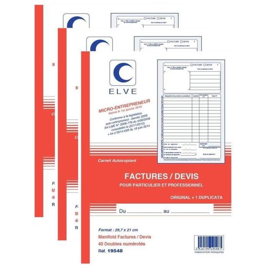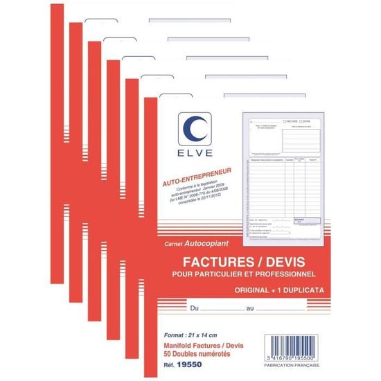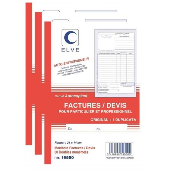 ELVE Manifold Entrepreneur Autocopiant Factures / Devis Format 210x140mm 50 Feuillets Dupli 3416790195500 Lebon Vernay - 2119-10 Lot 10 Blocs Facturation ELVE Manifold 'Devis - Offre De Prix', 297 X 210 Mm, Dupli - Achat Lot 10 Carnets Facturation Exacompta - Réf. 3278AE - 1 Manifold FACTURES - avec mention TVA - 50 feuillets numérotés et autocopiants - duplicatas (1 original 1 copie) - format 210 x 148 mm - fabriqué en France Ce produit présente des caractéristiques de développement... ELVE Manifold FACTURES Collé en tête 210 x 140 50 feuillets Dupli. 5,12 €. (4.27€ HT). Elve - MANIFOLD DUPLI-FACTURES ENCOL. EN TETE 210X140 50/2. Type de...