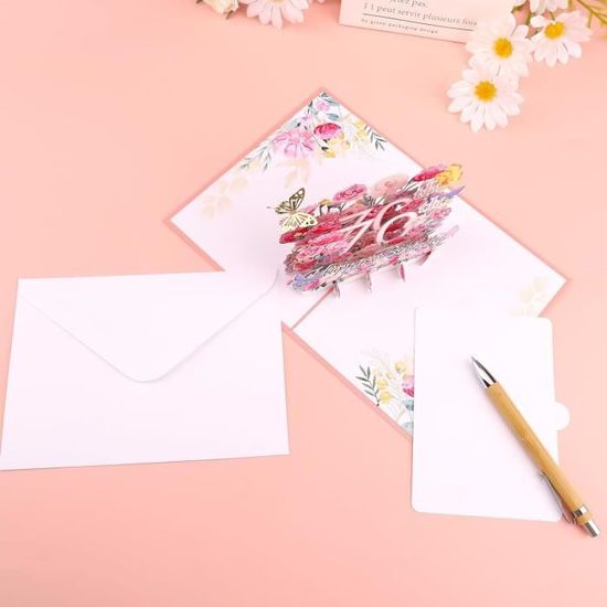 Carte Créative Avec Enveloppe 23x23cm Sinbana Carte D'anniversaire Pop-up 3D Avec Enveloppe, Rose, Boîte Cadeau Anniversaire Grand-mère Carte Pop-up Maman 3d Pop Up Carte de vœux pour maman, carte d'anniversaire de mère Joyeux anniversaire grand-mère Remplissez la feuille d'exercices L... Contenu du produit : Vous recevrez un jeu de cartes pop-up joyeux anniversaire grand-mère, comprenant une carte pop-up, une enveloppe et une carte supplémentaire. Matériel de qualité: fabriqué à partir de papier enduit, cette carte de voeux d'anniversaire est épaissie pour la durabilité, garantissant qu'elle est suffisamment robuste pour plusieurs utilisations. L'impression est claire et vibrante, avec des surfaces lisses, ce qui en fait un souvenir chéri. En raison de la différence entre les différents moniteurs, il peut exister une légère différence de couleur. Le design 3D apparaît lorsqu'il est ouvert, créant une délicieuse surprise pour grand-mère. Application large: idéal comme cadeau d'anniversaire pour grand-mère. Il se marie également bien avec d'autres décorations et fonctionne très bien comme un accessoire photo pour capturer des moments mémorables pendant sa célébration. Maman 3d Pop Up Carte de vœux pour maman, carte d'anniversaire de mère...