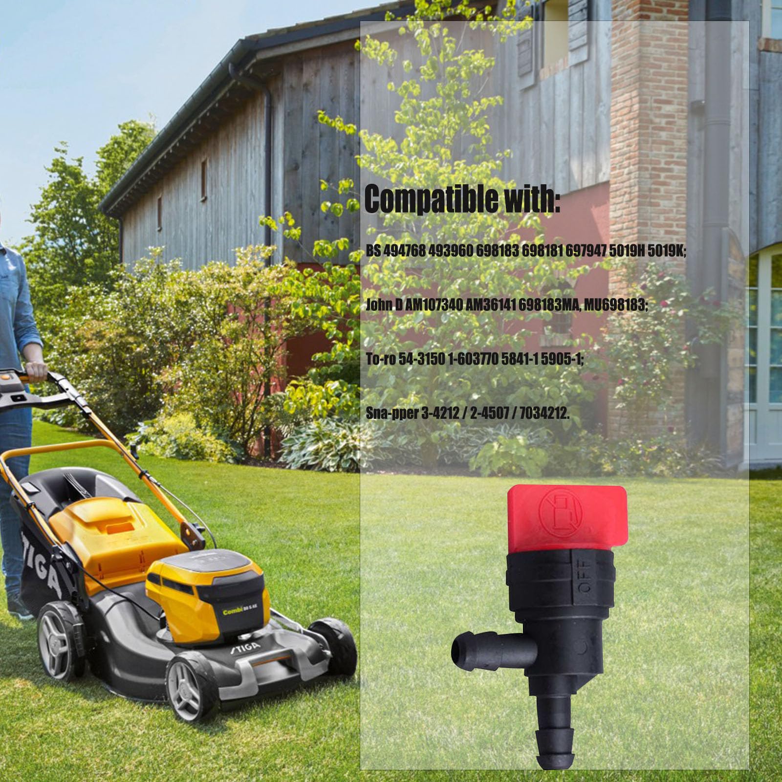 Cet article : HURI Vanne d'arrêt de Carburant avec Filtre à Essence et Tuyau Flexible pour Robinet d'arrêt E/A 6,35 mm 698183, 494768, 493960, souffleuse à Neige Tracteur. Ces articles sont vendus et expédiés par des vendeurs différents. HURI. 104 grammes. Noir. Métal. 104 Grammes. Information indisponible sur les pièces détachées Nous vendons de pièces de rechange de qualité supérieure. Il ne sont pas des pièces d'origine Vanne Arrêt Essence Promotion Vanne D'arrêt De Carburant Pour Robinet D'arrêt E/A 6,35mm 698183 494768 493960 Pièce Rechange B&S 698183 494768 Remplace les numéros d'article suivants : B & S 491860 B & S 493960 B & S 494768 B & S 698183 Ering B 494768 Sabo 17569 Snapper 1–6325 Snapper 7034212yp Snapper 7034212 Solo 494768 Toro 1–603770 Toro 104–3224 Toro 54-3150 Wolf 205 9063 Marque. HURI · Matériau. Métal · Couleur. Noir · Poids de l'article. 104 Grammes · Diamètre extérieur. 6,35 Millimètres · Fabricant. HURI Aussi utilisation universelle pour tondeuse autoportée et tracteur à pelouse. HURRISE Vanne d'arrêt du réservoir de carburant 4 pièces vanne d'arrêt