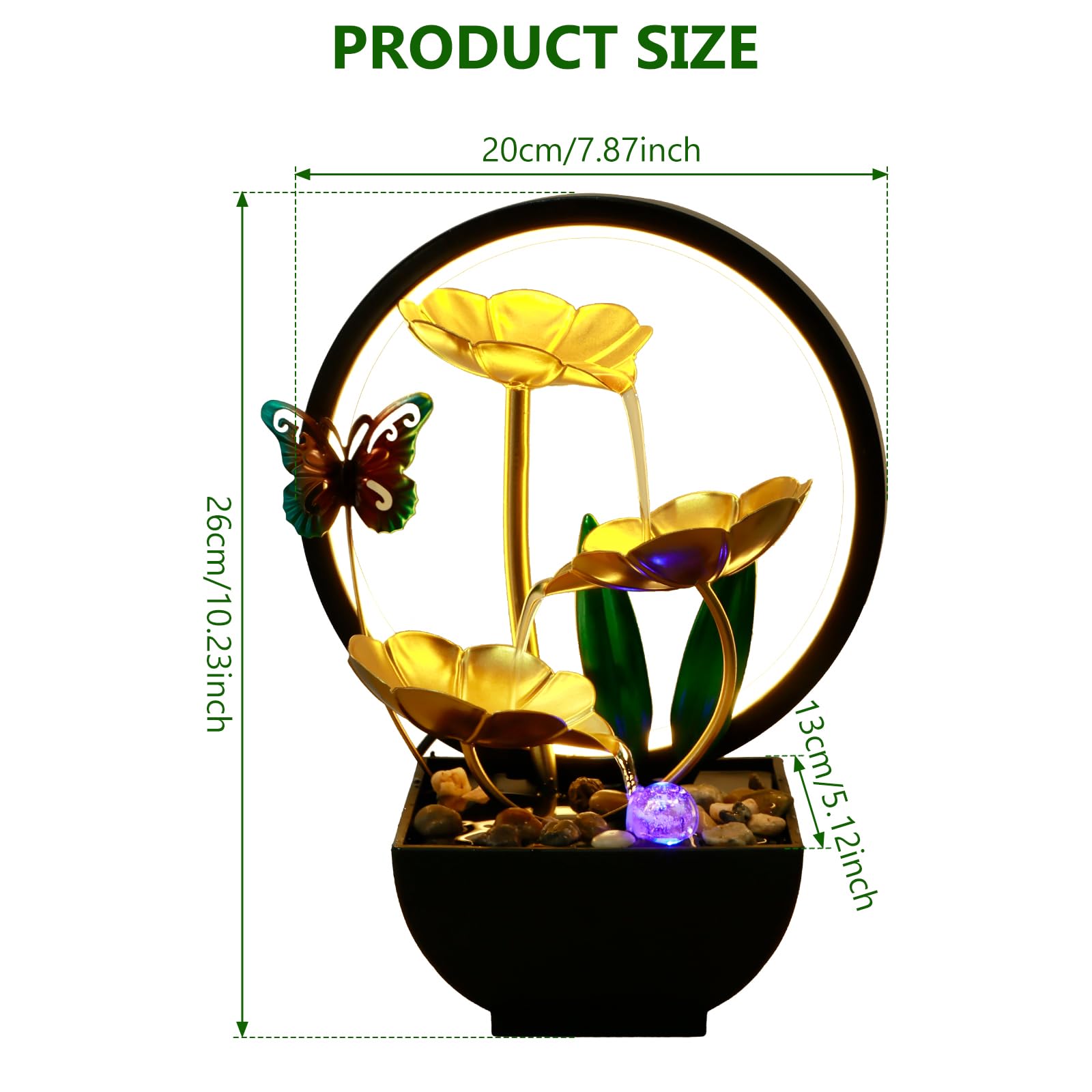 La structure à différence haute-basse émet le son de l'eau qui coule, ce qui peut calmer et détendre les nerfs, fournir un espace de relaxation approprié. Décoration de bureau : cette fontaine cascade de table peut être utilisée dans les maisons et les bureaux. Diamètre de l'anneau de lampe : 20 cm. Petite fontaine cascade de table : la petite fontaine de table est spécialement conçue pour les petits rythmes. La fontaine à eau de bureau peut être placée sur la table, le bureau ou la chambre sans prendre trop de place. 1 sac de pierres (quantité aléatoire). Dimensions totales : 27 x 15 x 13 cm (sans anneau de lampe). 1 manuel (français non garanti). 1 sac de pierres (quantité aléatoire)., 2 accessoires d'installation. Description : La fontaine de relaxation et de méditation peut fonctionner comme un excellent compagnon, vous pouvez profiter du son apaisant de l'eau et de l'ambiance d'éclairage chaleureuse lorsque vous utilisez cette fontaine à eau de table alimentée par USB. Facile à utiliser : la mini fontaine de bureau de relaxation peut être utilisée avec le câble USB inclus (Remarque : tête de l'adaptateur de charge non incluse), ce qui est plus pratique. Fontaine à Eau Intelligente pour Chat, Distributeur existent, USB Matériau du produit : métal + plastique. La fontaine a un débit d'eau qui peut augmenter l'humidité de l'air intérieur. La fontaine de table est idéale pour une utilisation dans les salles de bains, salles à manger, centres de table zen, etc. Fontaine de table avec fonction d'humidification : la petite fontaine est associée à la lumière, et la lumière douce est réfléchie par les ondulations de l'eau, créant une atmosphère romantique pour la maison, le bureau, la chambre, la ferme ou la cuisine (Remarque : veuillez vérifier l'espace avant d'acheter) Vous pouvez également la mettre dans la chambre de bébé et laisser votre bébé profiter du son de l'eau qui coule et de la lumière douce. Style (en option) : libellule, papillon, colibri, lotus (sans anneau de lampe)., Remarque : 1., Il peut y avoir de légères différences entre l'image et la couleur réelle du produit. Fontaine Bureau Zen Avec Lumière Fontaine D'intérieur Avec Brume Et Boule Roulante, Fontaine De Table Fontaine Humidification Intérieur eau coule doucement comme une petite cascade… c'est juste relaxant. Parfaite pour créer une ambiance zen à la maison ou au bureau. Si vous... Caractéristiques : Nom du produit : fontaine à fleurs de table. C'est un bon cadeau décoratif pour vos parents ou amis. Cette fontaine est facile à utiliser, il suffit de brancher le câble USB et ensuite vous pouvez en profiter. Nous ferons de notre mieux pour vous montrer la couleur exacte. Caractéristiques principales : Une mini fontaine de relaxation pour la relaxation : cette fontaine LED de table a une lumière douce et un son naturel. Alimentation : câble USB (Remarque : tête de l'adaptateur de charge non incluse). C'est un bon compagnon pour vous détendre et vous reposer.