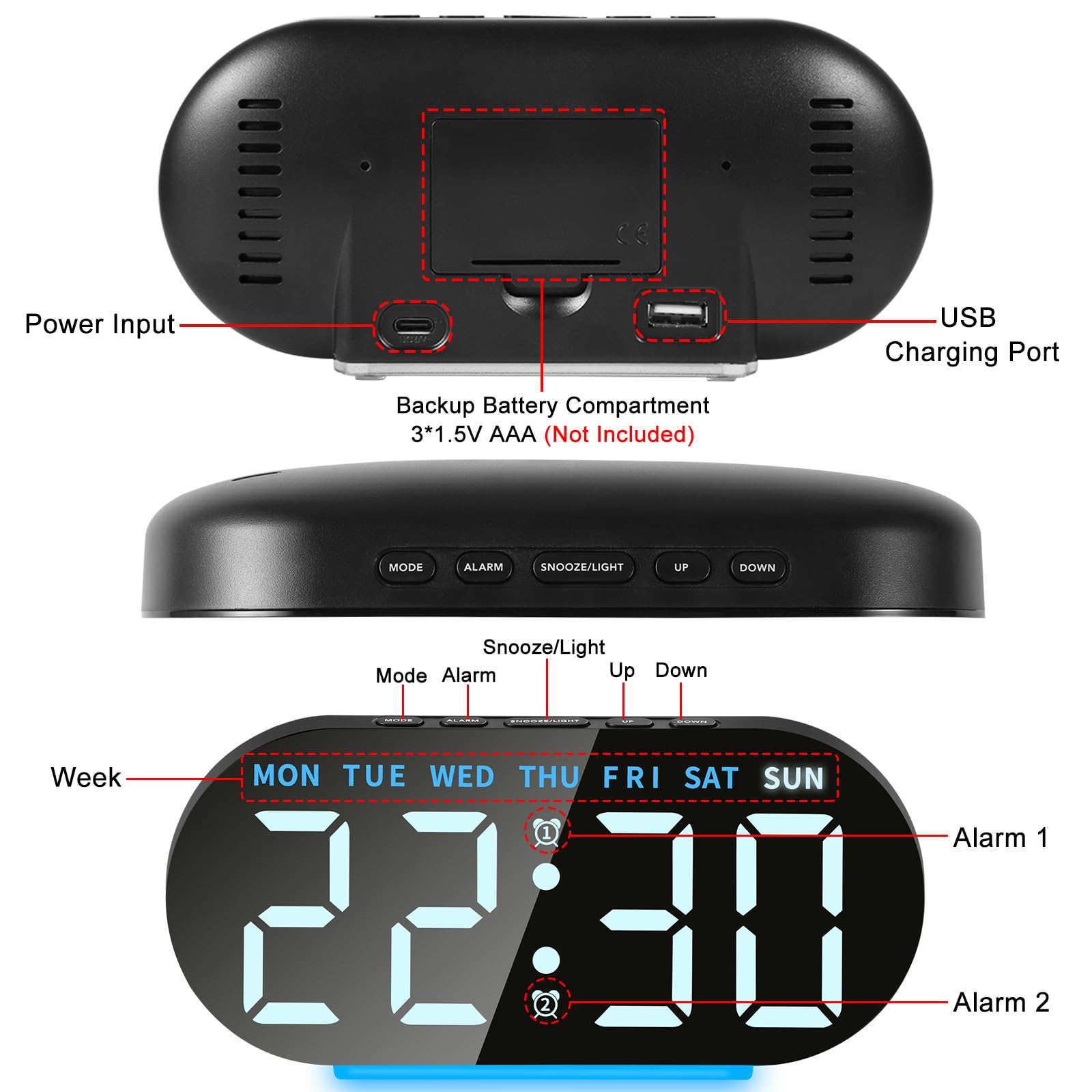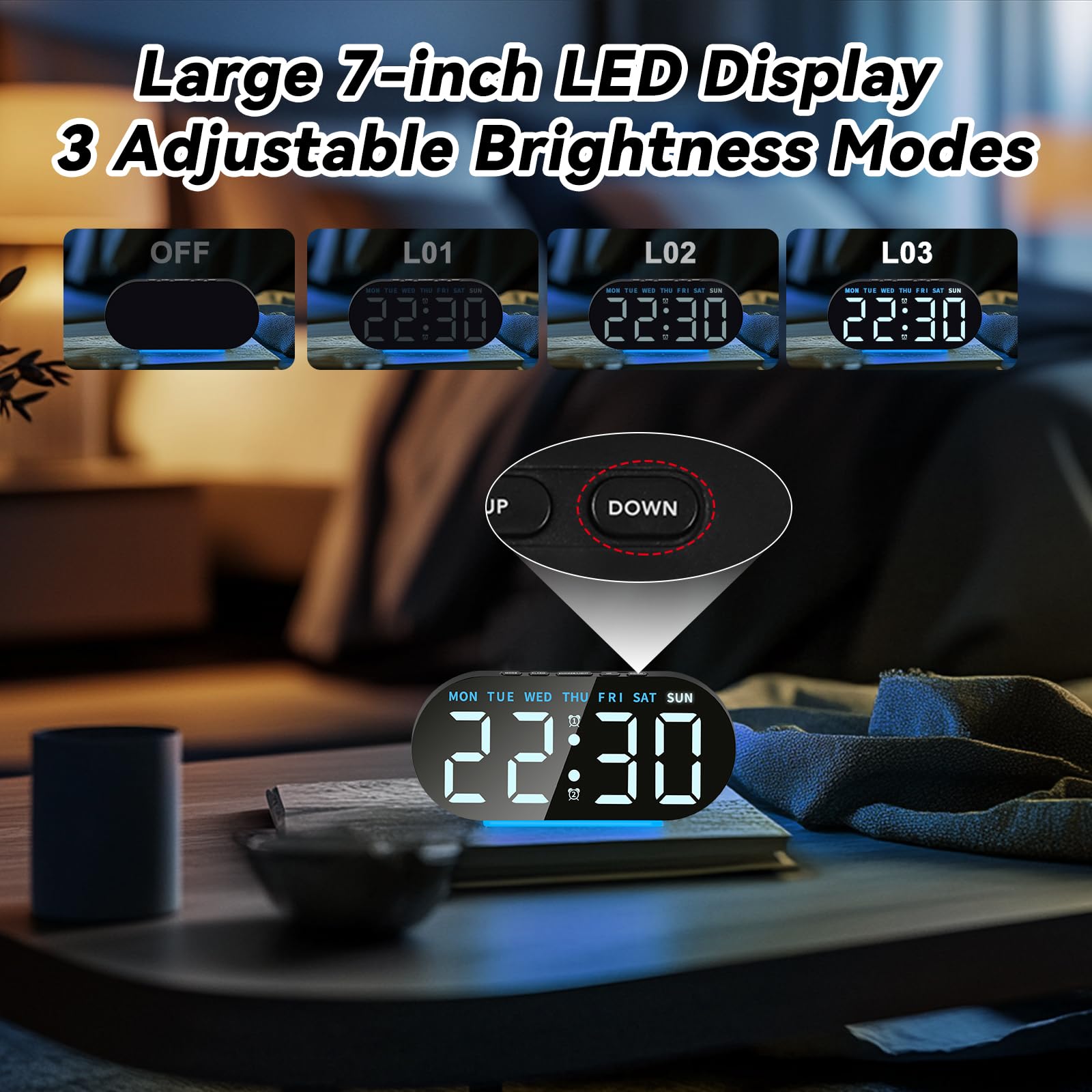 Le cadeau parfait pour toutes les occasions. Un cadeau qui fait plaisir tous les jours ! Plus de lumière vive gênante. Veilleuse Intégrée : À la base de l'horloge se trouve une veilleuse à 3 niveaux de luminosité, créant une ambiance chaleureuse et apaisante dans l'obscurité, facilitant votre endormissement C'est un cadeau parfait pour vos proches, adapté à diverses occasions festives Charge USB et Sauvegarde par Batterie : Une fois connectée par câble, l'horloge électronique assure non seulement une haute qualité d'affichage mais recharge aussi d'autres appareils. La batterie de secours automatique sauvegarde les paramètres de l'heure et de l'alarme en cas de coupure de courant - vous ne manquerez plus jamais un rendez-vous important. La fonction snooze pratique de 5 minutes permet un remuage en douceur. Miroir d'horloge de Table avec 2 Ports de chargeur USB, fonction Snooze... Choix de Cadeau Idéal : Cette horloge silencieuse peut afficher l'heure, la température, la date et le jour de la semaine, est conçue de manière moderne et facile à utiliser. Affichage optimal à toute distance sans éblouissement nocturne La luminosité réglable sur 3 niveaux (avec option d'arrêt) garantit une visibilité optimale la journée et un affichage sans éblouissement la nuit. Réveil numérique Netzu pour chambre à coucher avec veilleuse 8 couleurs Design moderne et facile à utiliser. Parfaite comme lumière d'orientation dans l'obscurité ou pour se détendre avant de s'endormir sans perturber le rythme du sommeil. Faites fonctionner le réveil au choix via un câble USB (bloc d'alimentation inclus). Programmation hebdomadaire (Lun-Dim/Lun-Ven/Lun-Sam) et fonction snooze 5 minutes Particulièrement pratique : aucun tic-tac fort ne perturbe votre sommeil nocturne ! Lntyq Réveil numérique pour enfants et adolescents avec veilleuse 7... Réveil Double Alarme Veilleuse Réglable Ayybboo Réveil Numérique 7,09" Avec Écran LED Géant,Veilleuse Mosuo Reveil Matin Numerique Enfant Les touches intuitives permettent de régler toutes les fonctions en quelques secondes sans instructions compliquées. Des piles AAA (non fournies) sont utilisées pour conserver l'heure et les paramètres d'alarme en cas de coupure de courant Veilleuse apaisante : lumière douce pour éteindre La barre LED intégrée à 3 niveaux à intensité variable sur la partie inférieure crée une ambiance chaleureuse et atmosphérique.