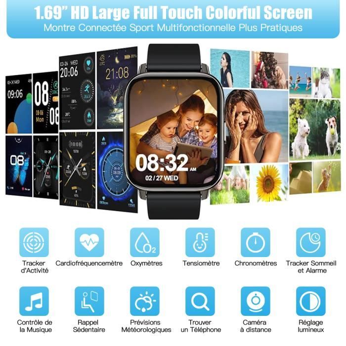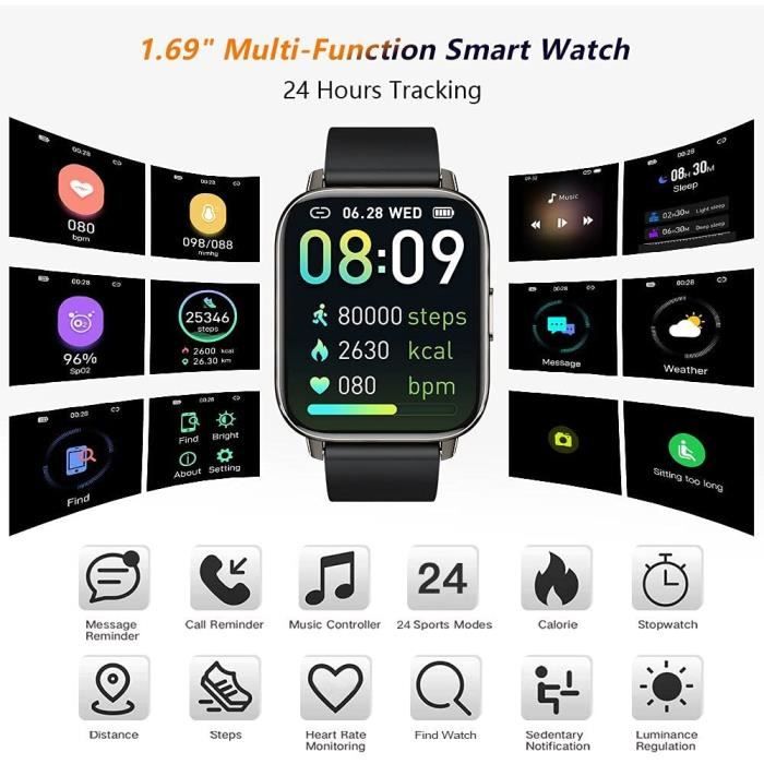 Prévisions Météo Définissez la ville résidente dans l'application, connectez votre montre intelligente pour vérifier les conditions météorologiques d'aujourd'hui et de demain sur la montre Cette montre connecter vous permet de comprendre votre santé de manière plus intuitive en affichant vos données sportives. N'oubliez pas de rester actif et de vous aider à réduire le stress, définissez le temps dont vous avez besoin pour vous détendre. Secouez pour Photographier Activer la fonction Camera Remote Control sur l'application, vous pouvez sur le smartwatch contrôler la prise de vue à distance. Moniteur de Fréquence Cardiaque et de Sommeil: Grâce aux capteurs optiques, la montre connectee surveille votre rythme cardiaque en temps réel. Vous pouvez également personnaliser le cadran. Smartwatch 24 Modes Sport Montre Connectée Femme Homme Smartwatch - 1.69" Etanche Montre Intelligente De Montre Connecté Sport Podomètre Calories Cardiofrequencemetre Moniteur Sommeil Tracker D'Activité Pour Android IOS Montre Connectée Homme H10 Montre intelligente 1.69 pouce Smartwatch Montre Connectée Ecran Tactile TFT HD de 1., 69 '' (definition 240 x 280): Cette smartwatch est fabriquée avec un écran tactile couleur TFT 1,69 ''. Luminosité Réglable La fonction de réglage de la luminosité facilite la lecture des données, que ce soit dans l'ombre ou au soleil. Connectez la montre podometre au GPS de votre téléphone pour afficher l'allure, les caloies, la distance parcourue et la carte d'itinéraire pendant vos marches, courses, randonnées et sorties à vélo. Elle offre une autonomie allant jusqu'à 10 jours avec une seule charge de 2 heures et offre de nombreuses fonctions telles que les prévisions météorologiques et les réveils, le chronomètre, la minuterie, le contrôleur de musique, le contrôleur de caméra, etc., pour vous offrir un maximum de confort Activez la fonction Contrôle de la musique sur APP, vous pouvez contrôler les chansons en pause, en lecture, précédentes et suivantes sur Smartwatch. Bracelet de 260mm, boucle ardillon, facile à ajuster à la taille. 24 Modes Sport, GPS Partagé: Cette montre sport dispose de 24 modes sportifs (course, marche, natation, escalade, aérobic, yoga, danse, badminton, tennis., ., ., ) Elle peut aussi suivre vos activités comme les pas, les calories, la distance, vous permettant de vous entraîner de manière plus scientifique. IDEALROYAL Montre Connectée Pour Homme Et Femme Avec Fonction Téléphone, écran Tactile 1,85, Montre De Fitness Avec Mesure De La Pression Artérielle... Etanche IP68 et Batterie Durable: Étanche jusqu'à 5m, vous pouvez porter unmontre sport lorsque vous vous lavez les mains, la natation, sur la plage peu profonde ou la piscine, et la natation eau froide. La montre natation est compatible avec iOS 9., 0 / Android OS 5., 0 ou supérieur. Contrôle de la Musique Après vous être connecté avec succès au téléphone mobile, vous pouvez utiliser la montre intelligente pour contrôler la musique.