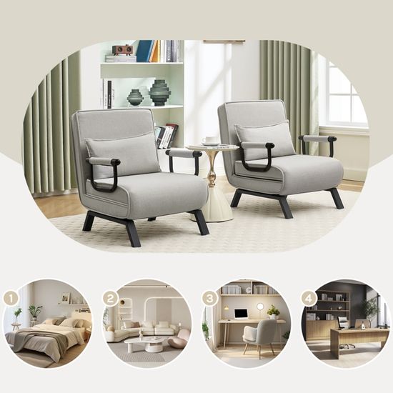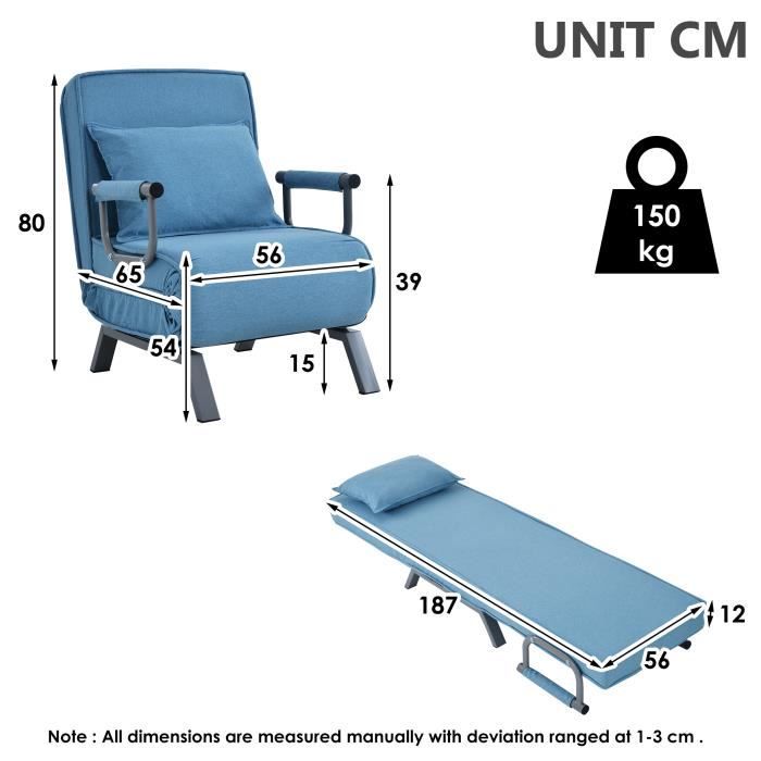 WOLTU Fauteuil Lit 1 Place Convertible, Canapé Lit Convertible 3 DOSSIER RÉGLABLE EN 5 POSITIONS : Le dossier du fauteuil pliant peut être incliné à 105°, 125°, 145°, 160°, 180° pour un soutien adapté lorsqu'il est utilisé comme fauteuil de lecture, fauteuil de salon ou canapé-lit pliable. Canapé Lit Pliable Studio Appartement WOLTU Fauteuil Convertible 3 En 1, Avec Fonction Lit, Fauteuil Pliable Canape Convertible Il peut être allongé jusqu'à 235 cm pour les personnes de différentes tailles. Le canapé-lit 3 en 1 WOLTU est un meuble polyvalent qui se transforme facilement en chaise de canapé, chaise longue ou lit simple. Son design pliable et élégant s'adapte à divers environnements tels que le salon, la chambre à coucher, le bureau ou même un dortoir Fauteul convertble Fauteul-lt 3 en 1 - couchage d'ntéreur chase... Les pieds de qualité ne rayent pas les sols lorsque vous déplacez la chaise convertible Les réglages ergonomiques soulagent la pression sur la colonne vertébrale et favorisent la relaxation Aucune compétence technique n'est requise pour changer de mode Idéal pour les petits appartements, les studios ou les dortoirs, ce fauteuil canapé vous permet de vous détendre, d'offrir un lit temporaire pour vos amis. FAUTEUIL CONFORTABLE ET DURABLE : Rembourrée en serviette éponge respirant avec une mousse haute densité et soutenue par un cadre métallique robuste, la chaise de relaxation est confortable pour s'asseoir, s'incliner ou s'allonger avec une capacité de charge jusqu'à 150 kg. Couleur : Gris foncé Spécifications : Matériaux : Serviette éponge + Métal + Éponge Dimensions : 76,5x82,5x85 cm (forme fauteuil); 76,5x235x60,5 cm (forme lit) (Voir l'image des dimensions pour plus de détails) Poids net : environ 29,4 kg; Capacité de charge maximale : 150 kg Contenu de l'emballage : 1 x Fauteuil lit convertible, 1x Kit d'accessoires, 1x Manuel d'utilisation