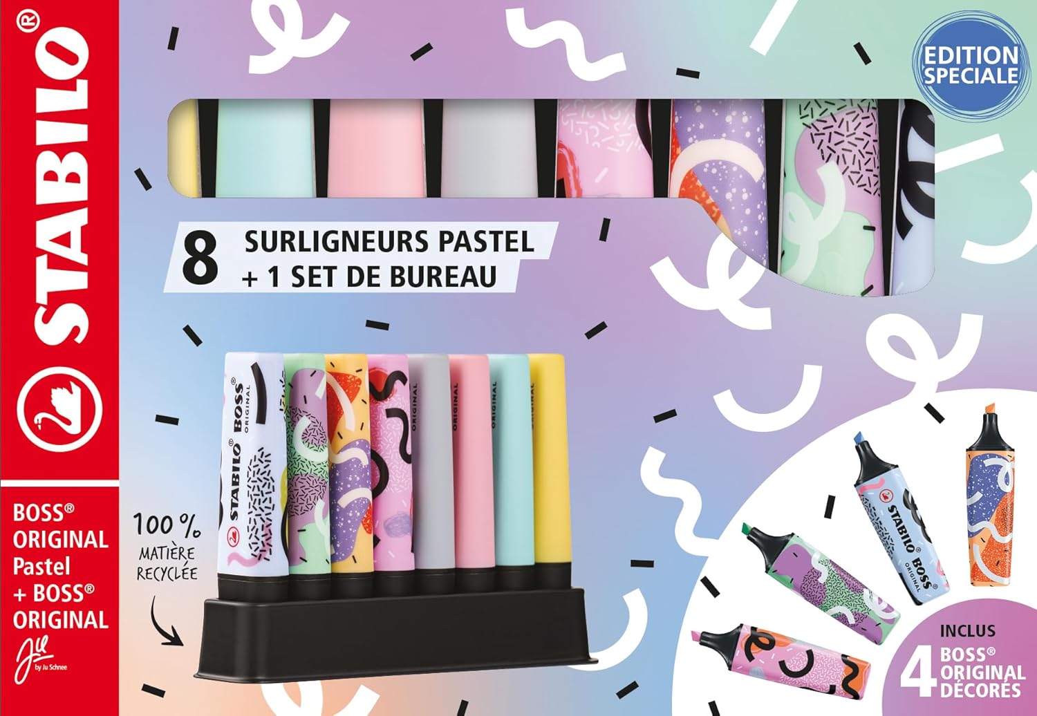 Set de bureau 23 Surligneurs Stabilo Boss Original Edition limitée by Sa pointe biseautée permet 2 largeurs de tracé : 2 mm pour le tracé fin pour et 5 mm pour le tracé plus épais. Stabilo Pastel Achat Set De Bureau X 10 BOSS ORIGINAL NatureCOLORS Wildflower Edition 6446619 Set Bureau Couleurs Nature Il offre une capacité de 375 m de surlignage et son encre universelle à base d'eau diffuse une couleur uniforme tout au long de son utilisation. Rouge bordeaux, bleu navy, rose pivoine ou encore mauve glycine : 4 nuances qui vous accompagnent au quotidien à l'école, au bureau et dans tous vos projets créatifs ! Grâce à sa technologie anti-dessèchement, le surligneur STABILO BOSS ORIGINAL peut rester ouvert jusqu'à 4h sans sécher Quand le surligneur incontournable depuis 1971 STABILO BOSS ORIGINAL s'inspire de la nature pour ofir 4 teintes florales en édition limitée. Rouge dahlia, mauve glycine, bleu chardon et rose pivoine : 4 coloris printaniers et harmonieux pour apporter tendance et modernité à vos textes ou vos créations artistiques... Il offre une capacité de 375 m de surlignage. Son encre transparente saura également vous accompagner dans vos projets créatifs tels que le lettering ou le bullet journal. Le set de rangement vous permet de garder vos 10 surligneurs à portée de main sur votre bureau Il contient 6 couleurs inspirées de la nature et 4 nuances florales en édition limitée pour souligner, encadrer, annoter des textes, créer., ., ., Quand le surligneur incontournable depuis 1971 STABILO BOSS ORIGINAL s'inspire de la nature pour offrir 4 teintes florales en édition limitée. Avec STABILO BOSS ORIGINAL NatureCOLORS Wildflower Edition vous pouvez surligner, souligner, encadrer, entourer, ombrer, décorer., ., ., Edition WildeFlowers : le surligneur STABILO BOSS propose des tons harmonieux trouvant leur origine dans les nuances de couleurs des fleurs sauvage. Idéal à poser sur un bureau ce set fabriqué à partir de matières recyclée vous permettra d'avoir toujours vos 10 STABILO BOSS ORIGINAL NatureCOLORS à portée de main.