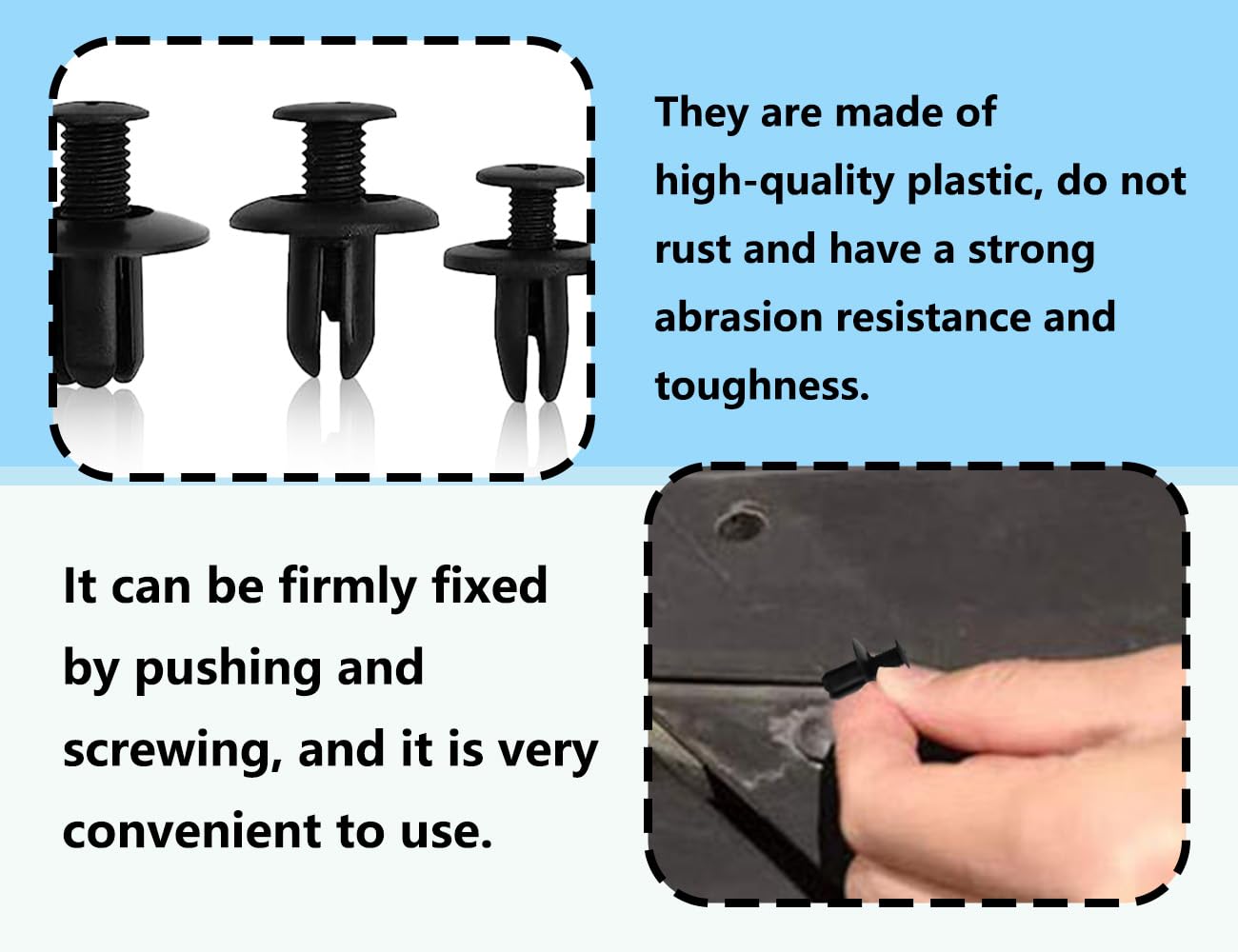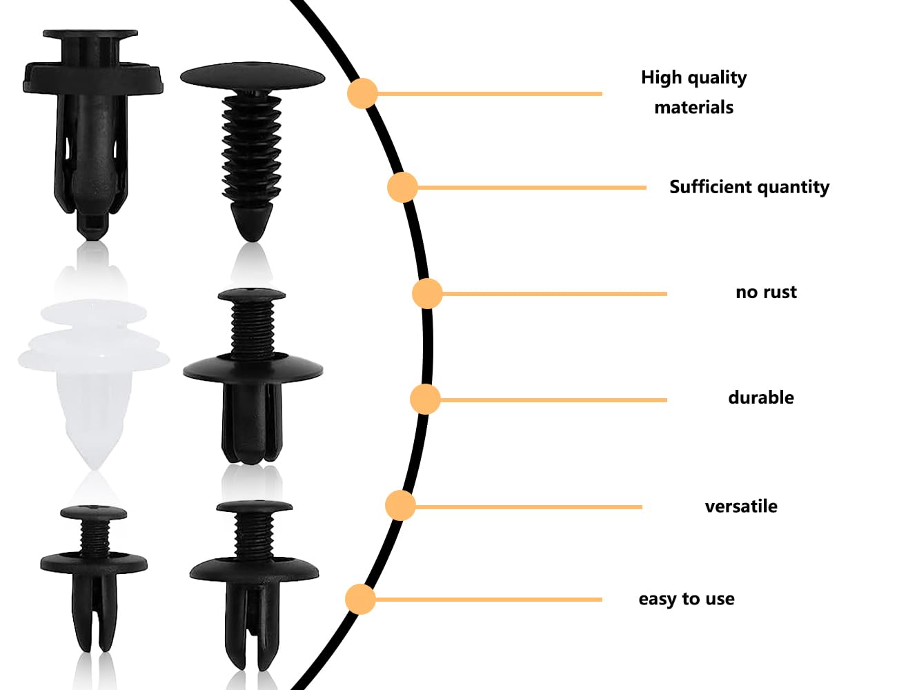 Fixations Pour électronique Maison Bureau Lot De 100 Clips De Fixation Pour Plaque De Porte De Voiture Clips Fixation Plaque Voiture Clips pour pare-chocs | Rivets en plastique | Clips de Contenu du produit : vous recevrez un jeu de clips de fixation de voiture, un total de 100 pièces. Ce kit est conçu pour la fixation de panneaux de portière... Ils résistent au poids et aux vibrations des panneaux de portière de voiture et garantissent que les panneaux de porte ne se desserrent pas ou ne tombent pas. Léger et facile à ranger : le kit est emballé dans une boîte en plastique qui permet d'organiser les différentes tailles de pinces en plastique pour un accès rapide. Apparence simple et belle, facile à transporter et à ranger. Contenu du produit : vous recevrez un jeu de clips de fixation de voiture, un total de 100 pièces. Cette conception permet à l'utilisateur de faire rapidement et facilement la tâche de fixer les panneaux de porte de voiture, ce qui permet d'économiser du temps et de l'énergie. Largement utilisé : le kit est non seulement adapté pour la fixation de portes de voiture, mais peut également être utilisé pour l'électronique, la maison, le bureau, etc. L'utilisation des pinces en plastique de cet ensemble est une solution pratique, rapide, pratique et efficace qui peut répondre aux besoins de différents utilisateurs et est abordable, ce qui en fait une solution de fixation recommandée. Ces clips couvrent une gamme de tailles de trous de 6 à 10 mm, garantissant que vous avez toujours la bonne taille pour le travail. Cette sélection complète rend le kit parfait pour les remplacements d'origine, s'adaptant à une grande variété de modèles et de types de véhicules