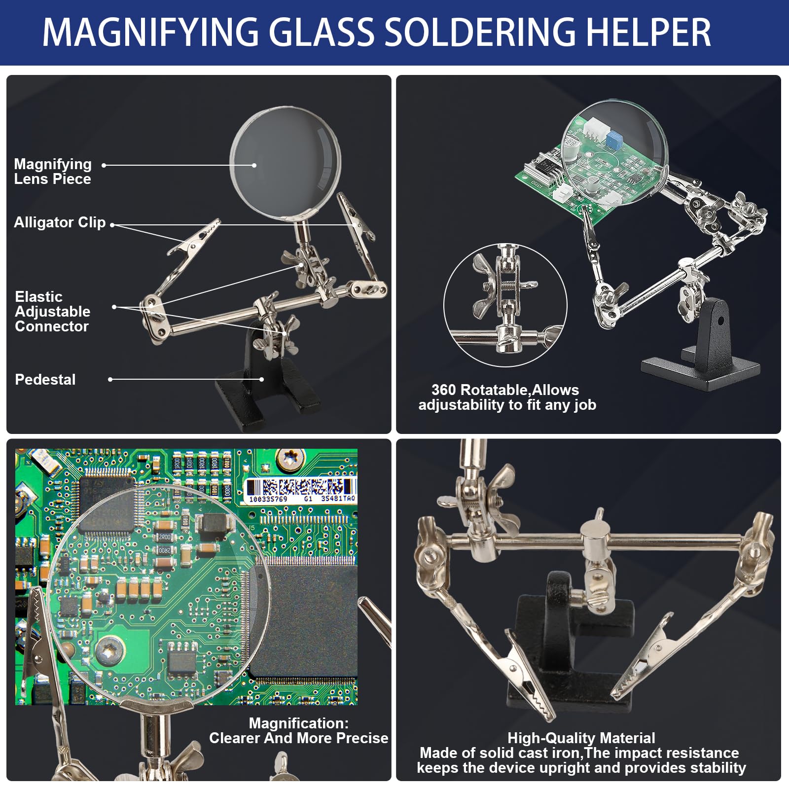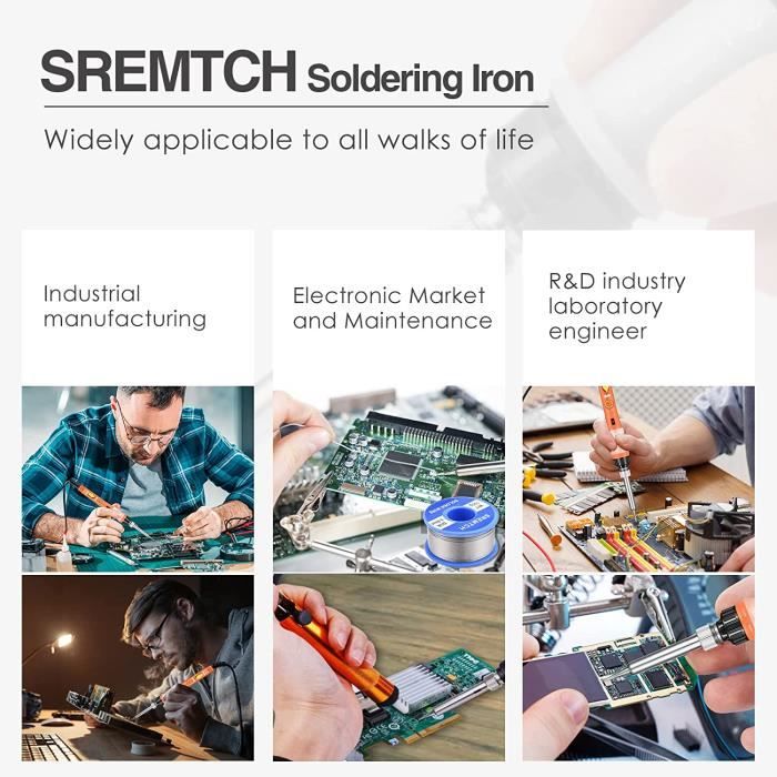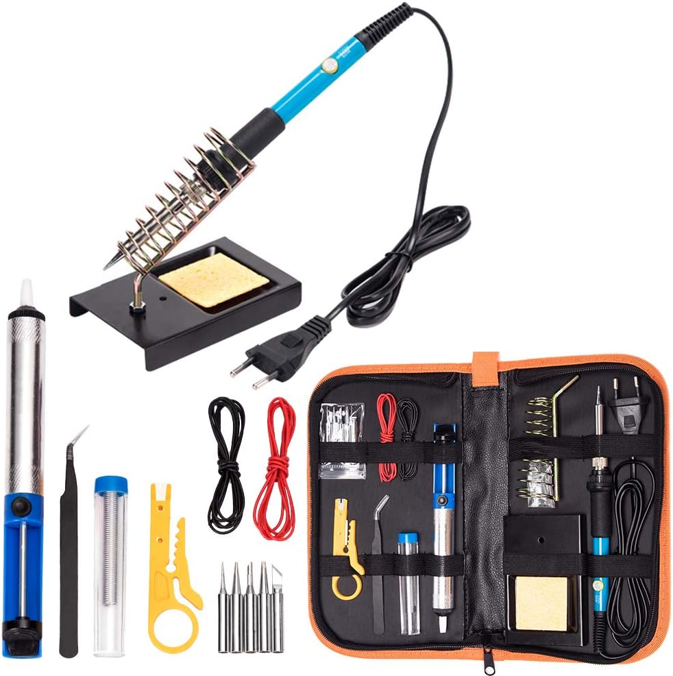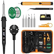 Happy-Fer à souder Kit complet Irons soudure électronique Outil 60W Fer à Souder électronique Sur Une Surface Blanche. Fer Utilisé Dans Les... Kit Fer à Souder 100W Fer à Souder Kit,100 W Temperature Réglable 180-520°C Poste A Souder Etain Il comprend un fer à souder, un fil à souder de 50 g, cinq pannes de fer à souder, un outil à dessouder bleu, une paire de fils de test rouge et noir, une paire de fils électriques rouge et noir, un multimètre, un petit couteau jaune, une pince à épiler, un sac à outils en PU et une table de refroidissement Chauffage Rapide 15s et Dissipation Thermique Efficace:La pointe du fer à souder chauffe rapidement en 15 secondes. Kit de fer à souder 80 W LCD Tepérature réglable 180–520 ℃ Kit de... Commutation ℃/℉ et mode veille automatique:Vous pouvez régler précisément la température de 180°C à 520°C (356°-968°℉) avec les boutons +/-, le contrôle précis de la température à 5℃ et l'écran LCD, et en même temps vous pouvez basculer entre °C et °F;De plus, il dispose d'une fonction de veille automatique qui s'active lorsqu'il n'est pas utilisé pour économiser de l'énergie et assurer la sécurité Les quatre trous de ventilation sur le fer à souder assurent une meilleure dissipation de la chaleur et une soudure plus sûre et peuvent permettre un refroidissement rapide. Kit de Fer à Souder Multi-électronique:Que ce soit pour souder des circuits imprimés, réparer des appareils électriques, fabriquer des bijoux et des objets artisanaux en métal ou divers projets de bricolage, il peut répondre à tous vos besoins. De plus, il peut compenser automatiquement les fluctuations de température pour obtenir une fonction de thermostat