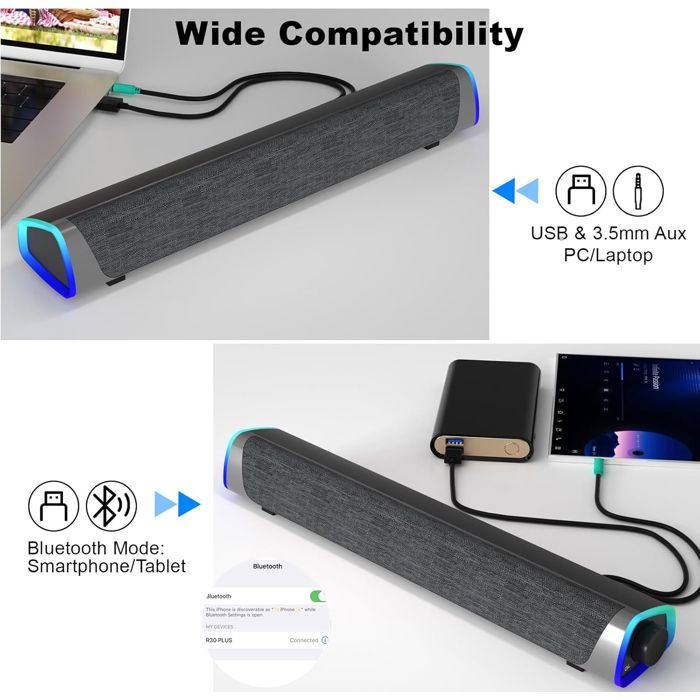 Choisisser le mode d'éclairage Vous pouvez sélectionner le mode d'éclairage souhaité en appuyant sur le bouton au-dessus du haut-parleur droit Caractéristiques des enceintes pc: Trois modes d'éclairage: Mode rythme, changement progressif, mode fixe; 8 changements de couleur. Haut-parleur PC alimenté par USB : Méthode 1: système stéréo équilibré 2., 0, veuillez utiliser un adaptateur 5 V/2 A (non inclus) pour de meilleures expériences. Design Compact et peu encombrante Avec son format mini 87 * 92 * 133mm, les petites enceintes gaming se placent parfaitement sous l’écran ou des deux côtés de l’ordinateur de bureau et n’occupe pas de sièges supplémentaires sur le bureau. Méthode 2: Branchez l'USB sur n'importe quel port USB, connectez le câble audio 3,5 mm au port audio. Compatibles avec presque tous vos appareils : PC fixe, portable, tablette, TV, MP3/MP4... Le processeur numérique intégré garantit un son clair et détaillé... Ainsi, vous pouvez contrôler le volume de son des enceintes pour pc rapidement et facilement. Le mode peut être modifié librement à votre guise, choisissez la couleur que vous aimez dans le deuxième mode étape par étape, appuyez sur le bouton et la lumière restera. Description du produit Giant-SR600 Haut Parleur PC pour Gaming et 3 Modes d'éclairage RGB Améliorés Système de haut-parleurs 2., 0, placez les deux haut-parleurs de chaque côté de l'écran de votre ordinateur de bureau afin de profiter d'un son stéréo. Enceintes Led Rythme Musique Haut-parleurs PC 10W RGB Enceinte PC Synchronise Avec Rythe De Usique Enceintes RGB 10W Stéréo Gaing Enceinte PC RGB ini Haut Parleur PC 10W Enceintes Stéréo 2.0... Veuillez utiliser un adaptateur 5 V/2 A (non inclus) pour de meilleures expériences. Mode rythme: les couleurs seront synchronisées selon le rythme de la musique; Mode de changement progressif: les 8 couleurs changeont naturellement au fil du temps; Mode fixe: vous choisissez la couleur de la lumière et gardez la couleur fixe. 【3 Modes RGB Magnifique】Avec le bouton sur le dessus du haut-parleur PC, vous pouvez directement allumer les lumières et changer les modes. Nous vous offrons des services optimales d’après vente de 18 mois. Enceinte Ordinateur De Bureau BLL Enceinte Barre De Son Gaming Sans Fil Bluetooth 5.0 Pour PC Portable - Son Stu00e9ru00e9o HiFi Barre De Son Abox 【Haut-parleurs Stéréo avec Son Clair】Les haut-parleurs d'ordinateur 2 * 5 watts, ils sont compacts mais puissants. La lumière change en fonction de la musique: le rythme de la musique est plus fort, la lumière clignote plus rapide et plus brillant., Changement Progressif Les 8 couleurs claires changent naturellement au fil du temps (rouge, orange, jaune, vert, bleu clair, bleu foncé, violet, rose)., Mode fixe Meilleure expérience : le haut-parleur SR600 PC vous offre une expérience immersive tout en regardant des vidéos et en jouant