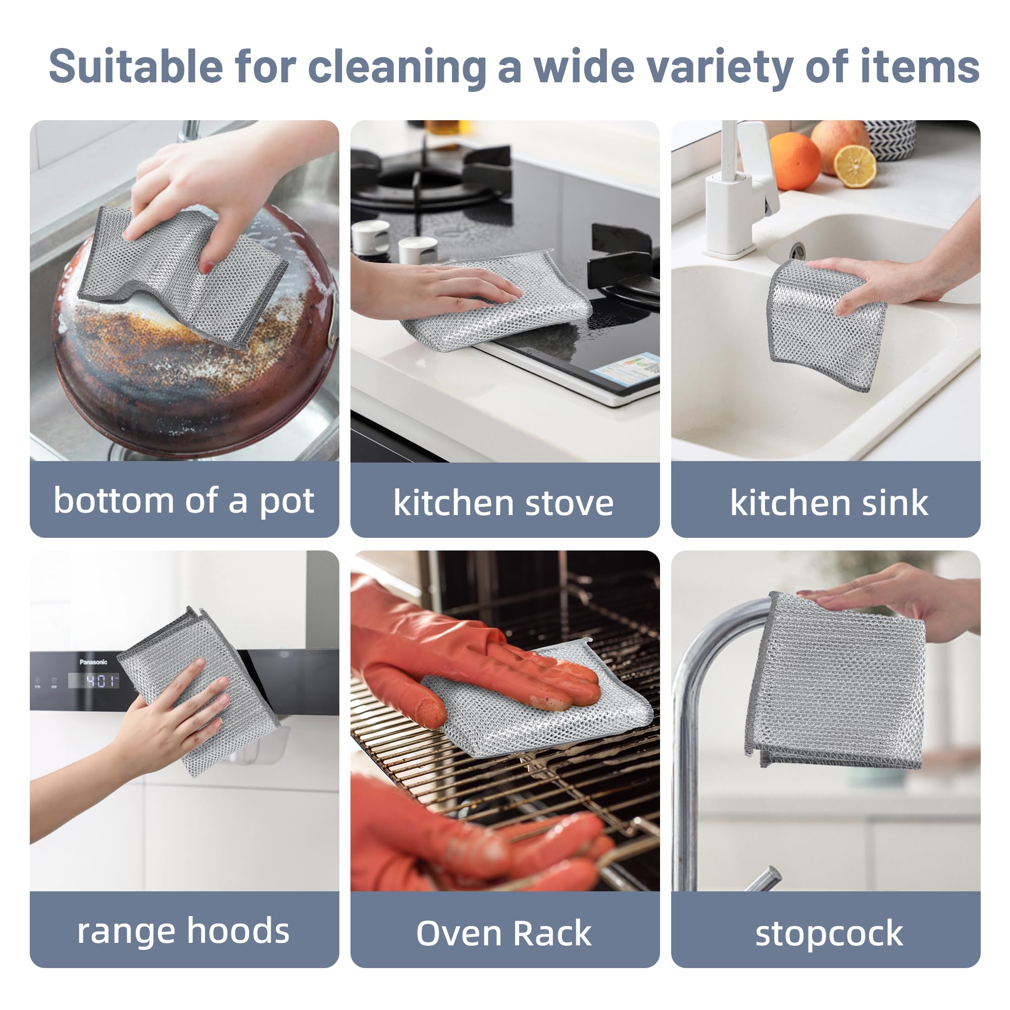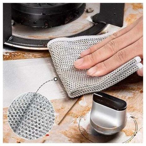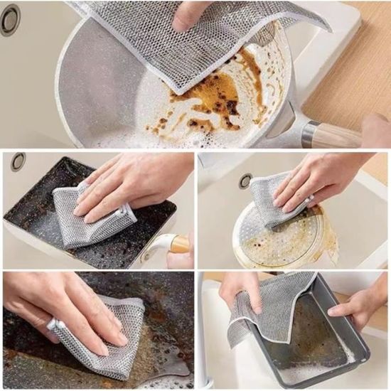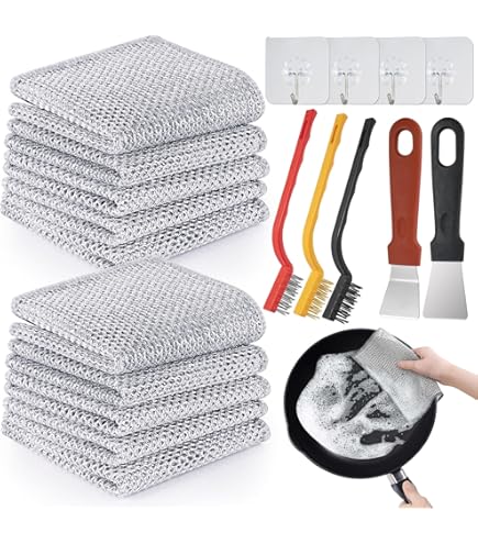 Chiffons à vaisselle en fil métallique anti-rayures, Torchon La lavette en fibre métallique vous apporte une nouvelle expérience de nettoyage: Ne raye pas, nettoie plus facilement les coins, est doux, ne colle pas et sèche facilement Grattoir Vaisselle Chiffons à Vaisselle, 12 Pièces Torchon Multifonctionnel En Fil Kit Nettoyage Casseroles Puissant Il est très doux et peut être plié à volonté. 🧽【20x20cm Chiffons à Vaisselle en Fil Métallique Polyvalents pour Humides et Secs】La taille de ce chiffons à vaisselle en fil métallique double couche est de 20x20cm, à peu près la taille de notre paume, nous pouvons facilement le tenir dans la main pour le lavage, peut également pénétrer profondément dans le récipient pour laver facilement la saleté, même le port du flacon peut être facilement nettoyé. Lntyq 15 Pièces Torchon en Fil Métallique, 20x20cm Torchon... 🧽【livré avec 4 Crochets Transparents, 3 Pinceaux Métalliques, Lame Courbe et Lame Droite】l'ensemble est également livré avec 3 pinceaux métalliques pour vous aider à nettoyer votre évier de vaisselle, une lame courbe et une lame droite pour vous aider à éliminer la rouille du fond de la casserole dans tous les sens, et 4 crochets transparents pour vous aider à ranger les pinceaux métalliques, la lame courbe et la lame droite. 🧽【Matériau doux Multifonctionnel en Fil Métallique Anti-Rayures】Ce torchon vaisselle est fait de matériau en nylon, a la force de nettoyage de la boule de fil d'acier et la flexibilité de l'éponge, peut fournir un effet de frottement puissant sans laisser de rayures sur la surface. Qu'il s'agisse d'ustensiles de cuisine, de voitures, d'acier inoxydable, de vaisselle ou même de grils et de réfrigérateurs, il rend tout brillant et brillant. Le matériau à récurer est doux et peut être utilisé sur n'importe quelle surface.