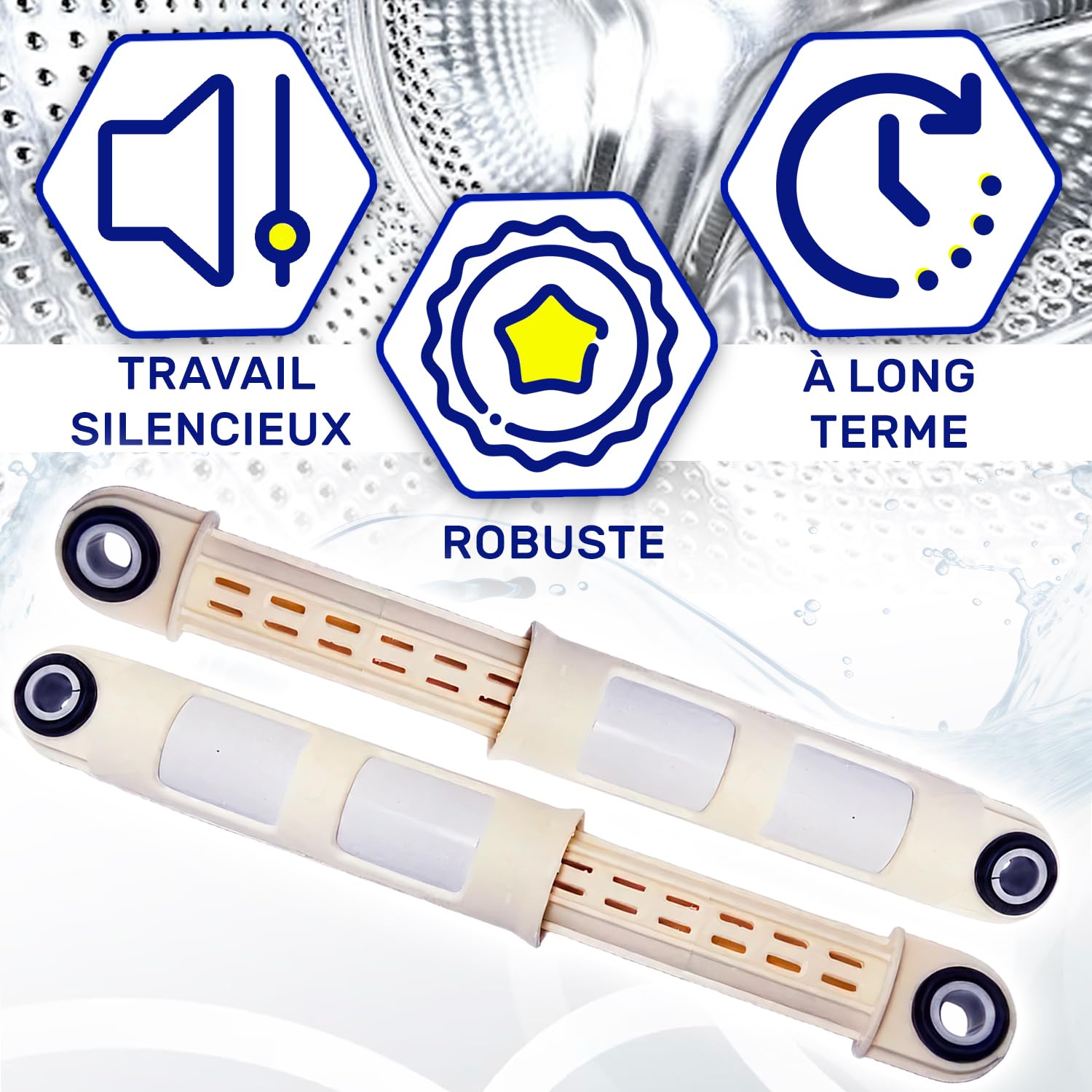 Machine A Laver Candy DL-pro Lot De 2 Amortisseurs 120N Pour Candy Hoover 49043541 41017168 - Avec Alu00e9sage De 11 Mm - Pour Machine U00e0 Laver, Su00e8che-linge Aube De Tambour Candy EN STOCK : Lot de 2 amortisseurs compatibles avec Bosch Miele 120N pour machine a laver, 9NFB09CHKN5QZ pas cher. Livraison rapide partout en France Amortisseurs Longueur 185/265 Mm Diamètre 11 Mm 2 Pièces Amortisseur Machine 120N 11 Mm 185/265 Mm Avec Amortisseurs Machine à Laver Diamètre des trous de fixation 11 mm, distance entre les trous en position repliée 185 mm, distance entre les trous en position déployée 265 mm. FONCTIONNALITÉ - Les amortisseurs pour machine à laver sont conçus pour réduire l'intensité des vibrations pendant la rotation du tambour. Amortisseur de chocs pour lave-linge de Brandt, Candy, Hoover et plus... Longueur totale 305 mm dépliée et 215 mm pliée Si votre lave-linge est installé sur une légère pente, de fortes vibrations peuvent se produire pendant le lavage et l'essorage Nos experts vous aideront à sélectionner une pièce SUPPLÉMENT - Si vous avez des questions concernant la sélection d'une pièce détachée, veuillez nous contacter.