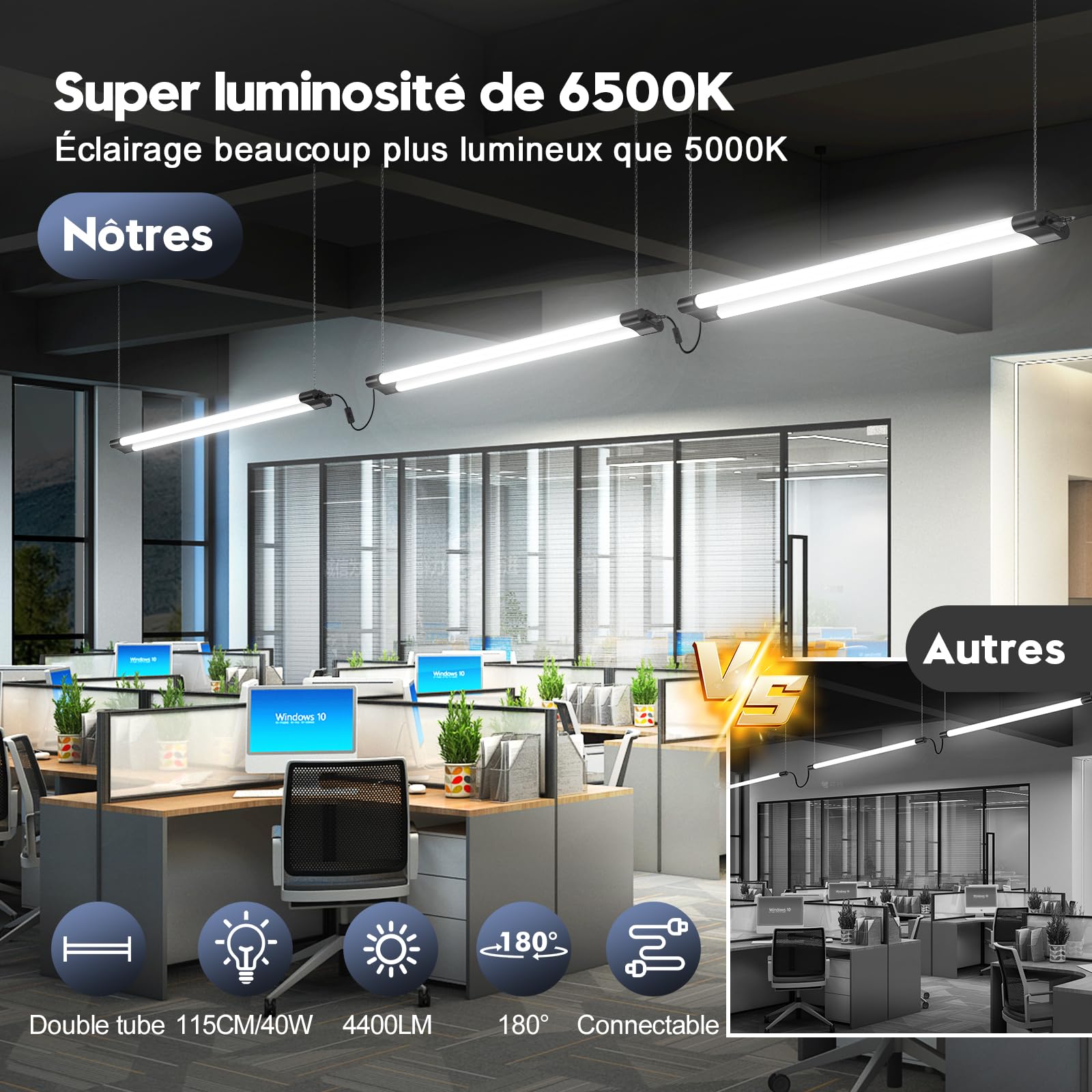 Kit éclairage Led économique Plug Play Sararoom 120cm Connectable Reglette LED, 4400LM, Blanc Froid éclairage Garage Atelier Led Viugreum 4 Paquets Tube Néon LED 115cm, Étanche IP65 Reglette 40W Réglette Led 150 Cm, 48W. Couleur Blanc Froid (6500K) 4800 Lúmens. Tube... Le processus d'installation est rapide et facile, aucun câblage compliqué ou outil professionnel n'est nécessaire, même pour les novices en bricolage. 【Raccordement flexible, connexion sans faille】L'un des points forts de cet barre lumineuse à LED est sa capacité de connexion, qui permet d'utiliser jusqu'à 4-6 lampes ensemble en les enchaînant sans avoir besoin d'acheter des accessoires supplémentaires. Cette conception vous permet d'ajuster de manière flexible la disposition de l'éclairage en fonction de vos besoins réels, en veillant à ce que l'ensemble de l'espace soit entièrement éclairé. 【Plug and play, installation facile】Ces plafonnier LED de 120cm sont de conception plug and play, peuvent être installées directement sur le plafond ou suspendues au plafond du garage, de l'atelier, du sous-sol et d'autres espaces. 【Haute qualité, durabilité】 Cette lampes d'éclairage LED est fabriquée à partir de matériaux de haute qualité pour une sécurité et une fiabilité supérieures. La conception robuste et durable garantit que l'éclairage fonctionnera de manière stable dans tous les environnements. 【Contrôle simple, utilisation pratique】Cet neon led garage est équipé d'un interrupteur marche/arrêt sur le cordon d'alimentation, qui est facile et intuitif à utiliser. Kit de Réglette LED IP65 Tube Néon LED 120cm T8 18W (Pack de 6...