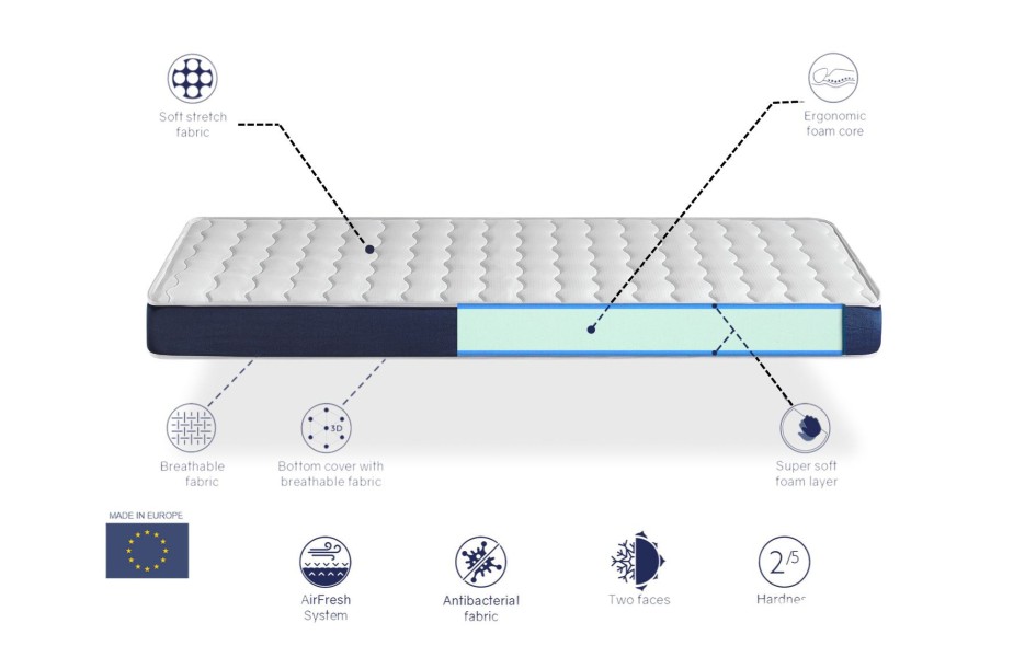 Le modèle SPRING est un matelas pour jeunes conçu pour s'adapter à chaque étape de leur croissance. Avec un système de ressorts ensachés, il permet une ergonomie unique pour qu'ils grandissent en bonne santé et en force. Les ressorts sont dotés d'un cadre périmétrique extra ferme qui confère sécurité et durabilité au matelas. Bébés Nous n'oublions pas nos bébés, dès leur naissance, ils ont besoin du meilleur des meilleurs et c'est ce que vous trouvez avec Dormissimo. Matelas ressorts ensachés 80x190 accueil mémoire de forme Sa fermeté est parfaite pour l'alignement correct de leur dos. Enfant@S Nous offrons à nos petits les matelas idéaux pour leur croissance., Méthode Montessori DORMISSIMO Matelas 80X200 LIT Enfants Épaisseur 18 CM AROA Ressorts - Ressorts ensachés, Mousse, Ergonomique et Respirant, idéal pour Les Lits gigognes et... les ressorts ensachés génèrent une chambre à air à l'intérieur du matelas, ce qui assure une grande respirabilité et permet le passage de l'air. Pour adultes Toute l'élégance et le confort que vous recherchez pour votre repos. Un matelas conçu pour les enfants et les jeunes. Matelas 80x180 DORMISSIMO Matelas Mousse 80X160 Orion Confort - Epaisseur 14 CM – Ideal Pour Les Lits Gigognes, Lit Enfant, Montesori Matelas Croissance DORMISSIMO Les dimensions du matelas, soit 80 x 180 x 18 cm, le rendent parfaitement adapté aux lits gigognes et aux lits cabanes. Ces caractéristiques lui permettent également de s’ajuster aux lits Montessori, favorisant une transition en douceur pour les tout-petits Grâce à ses couches hautement moussantes des deux côtés du noyau, elles assurent une posture correcte.