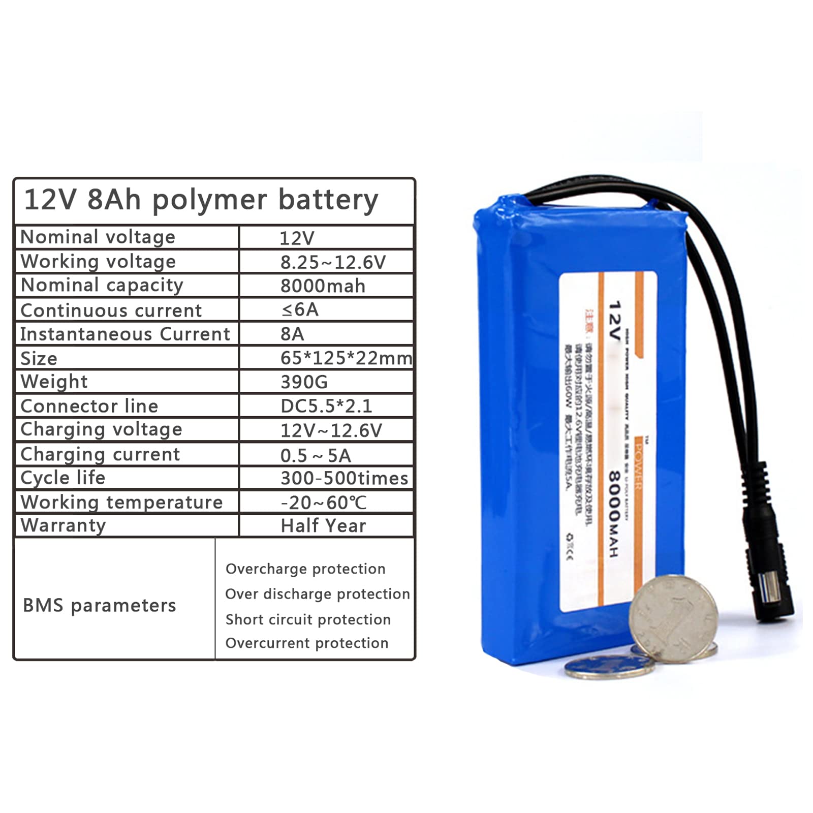 Batteries au lithium 12 V, 24 V, 36 V, 48 V : quelle est la différence Batterie au lithium 12 V : le cycle de charge et de décharge de la batterie est de 800 fois, notre batterie a des tests avant l'expédition, de sorte que vous pouvez l'utiliser en toute confiance Batterie Lithium 12v Batterie Lithium 150 Ah 12V LifePo4 ANTARION EASY + Pour Camping-car Et Alimentation Secours Portable Chargeur Type : Batterie lithium-ionTension : 12 VCapacité : 6800 mAhDimensions : 85 x 28 x 145 mmPoids : environ 1 kgNombre de cycles : 1000 cyclesCourant maximal : 12 V/3 A 5 V/2 ATension de sortie : 12 V 5 VTempérature d'utilisation : -20 °C à 60 °CListe de livraison :1 batterie lithium1 chargeur 12,6 V/1 A1 câble de conversion 5521 vers 55211 manuel d'utilisationConseil : Pour éviter que la batterie ne soit heurtée ou écrasée, ce qui réduirait sa durée de vie, il est recommandé de la ranger dans une boîte ou un sac d'emballage afin de prolonger sa durée d'utilisation normale. Cette alimentation de secours sans interruption 12 V 6800 mAh est conçue pour divers systèmes électroniques de caméras extérieures, assurant une alimentation continue à vos appareils. Batterie Lithium 12 V 150 A de chez SH Lithium - Peche et Poissons... Veuillez la charger immédiatement après réception. Compacte, dimensions 85 x 28 x 145 mm ; veuillez vérifier qu'elle correspond aux spécifications de votre appareil avant l'achat. Fonction de protection fiable : protection contre les surcharges, les décharges excessives, les surintensités et les courts-circuits, protégeant votre appareil contre tout dommage potentiel. Adaptée aux équipements médicaux, audio d'extérieur, équipements de surveillance, instruments industriels, éclairage, etc.