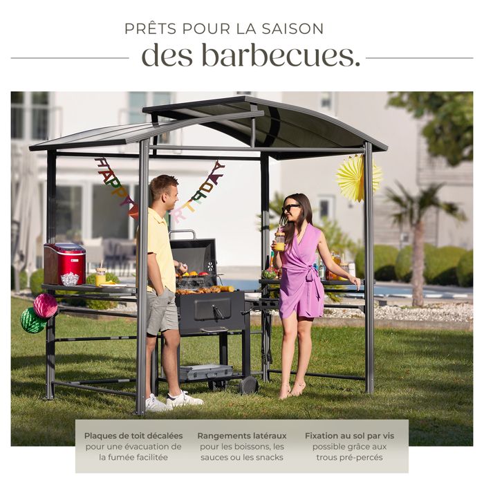 Des détails bien pensés pour les amateurs de barbecue Notre gazebo barbecue est doté d'un ouvre-bouteille intégré, d'étagères latérales pratiques pour la nourriture et les ustensiles et de crochets pour suspendre les outils, ce qui rend les grillades en plein air plus pratiques et organisées. Fabriqué en tissu pare-soleil de haute qualité. Tonnelle avec toit à persienne 3x4 m Taupe Tissu et aluminium - Abri... 4 x clips de fixation d'angle supérieurs, 1 x décapsuleur Conception robuste et sécurisée Équipé de piquets de sol et d'un cadre en acier renforcé, ce gazebo de patio reste fermement en place, même par temps venteux. Cet espace spacieux vous offre confort et tranquillité Son auvent souple à deux niveaux offre une excellente protection contre le vent et le soleil, tout en préservant la fraîcheur et l'ombre de la zone de cuisson. Installation rapide et facile Livré avec tout le matériel nécessaire pour une installation facile. Abri Barbecue Patio Acier Gazebo De Barbecue, 243 X 150 Cm, Tonnelle De BBQ Extérieur Avec Toit à 2 Tente De Toit Associé à des plaques de sol et des piquets de sécurité, l'abri de barbecue reste stable par vent fort Achetez VEVOR Gazebo de Barbecue, 243 x 150 cm, Tonnelle de BBQ Extérieur avec Toit à 2 Niveaux, Abri de Barbecue de Patio en Acier à Revêtement de Poudre... 4 x clips de fixation pour grille de barbecue Auvent à deux niveaux : La tonnelle bbq extérieur est dotée d'un toit souple à deux niveaux. 4 x tuyaux d'angle inclinés + tuyaux d'extension VEVOR Gazebo Barbecue Tonnelle BBQ Extérieur 243x150 cm avec Toit Il crée un espace extérieur rafraîchissant et confortable, rendant l'expérience barbecue plus agréable Abri toutes saisons Beau temps, mauvais temps, ce gazebo à barbecue est là pour vous. 2 x coussinets de pied Spacieux pour les barbecues : Ce gazebo de barbecue de 243 x 150 cm offre de l'espace pour accueillir de 2 à 4 personnes pour griller, discuter et savourer l'instant présent. Espace de fête par tous les temps : Des patios et terrasses aux bords de piscine et aux jardins, cet abri barbecue est idéal pour s'amuser dans le jardin. Matériau principal : Structure en métal Q235 + dessus en tissu d'abat-jour Spécification Numéro du modèle de l'article : SL-SW5422-1, Couleur : Gris foncé 1 x tuyau de fixation d'angle de toit Résistant aux UV et imperméable, il vous protège des rayons du soleil et des averses soudaines ; idéal pour des barbecues relaxants en toute saison. Conception astucieuse : La tonnelle de jardin comprend deux étagères latérales, ainsi que huit crochets de suspension pour ranger les ustensiles de barbecue.