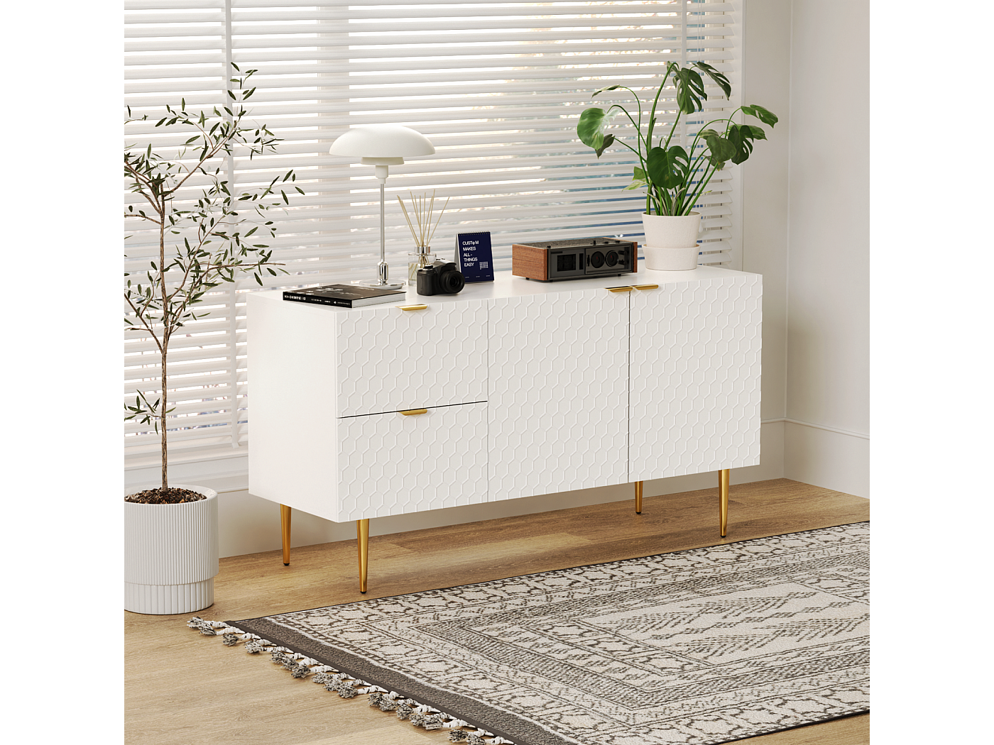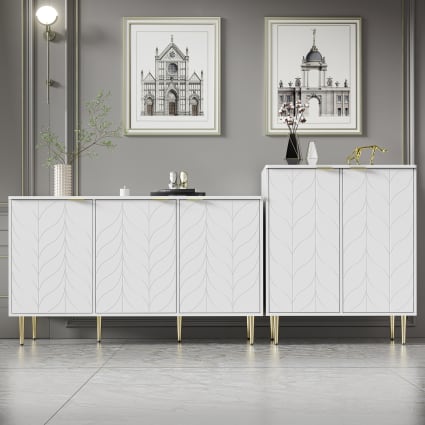 Buffet blanc (152 x 40 x 75 cm) avec design unique en forme de vague... 【Sécurité Optimale】:Système anti-basculement intégré pour une stabilité parfaite, idéal pour les familles avec enfants ou animaux. 【Entretien Facile】:Surface lisse résistante aux traces, nettoyable d’un simple coup de chiffon pour un meuble toujours impeccable. Meuble Salle à Manger Doré Buffet Noir (152 X 40 X 75 Cm), Design Unique En Forme De Vague, Poignées Et Pieds Dorés Meuble Buffet Blanc Dorures Vague arfait comme meuble salle a manger ou élément décoratif, il offrerobustesse et entretien facile pour sublimer votre intérieur avec élégance etfonctionnalité 1., Caractéristiques du produit : Matériau : MDF Couleur : Blanc Dimensions : 152 × 40 × 75cm Poids : 33., 15 kg Charge maximale : 60 kg Emballage : 2 paquets Assemblage requis : oui 2., Scénarios d'utilisation à domicile: Idéal en salle à manger ou salon, pour ranger vaisselle, vins ou exposer desobjets décoratifs tout en apportant une touche sophistiquée., 3., Design unique: Ses portes ondulées, ses finitions dorées et ses lignes courbes créent une pièceà la fois artistique et pratique. Buffet avec 4 portes profilées - 120 x 35 x 79.5 cm - Poignées et pieds... Description : Ce buffet salle a manger blanc allie design luxueux (portes ondulées, dorures),rangement spacieux (4 compartiments) et sécurité (anti-basculement). Presse agrume manuel avec un design unique en forme de citron deux modes d'utilisation pour