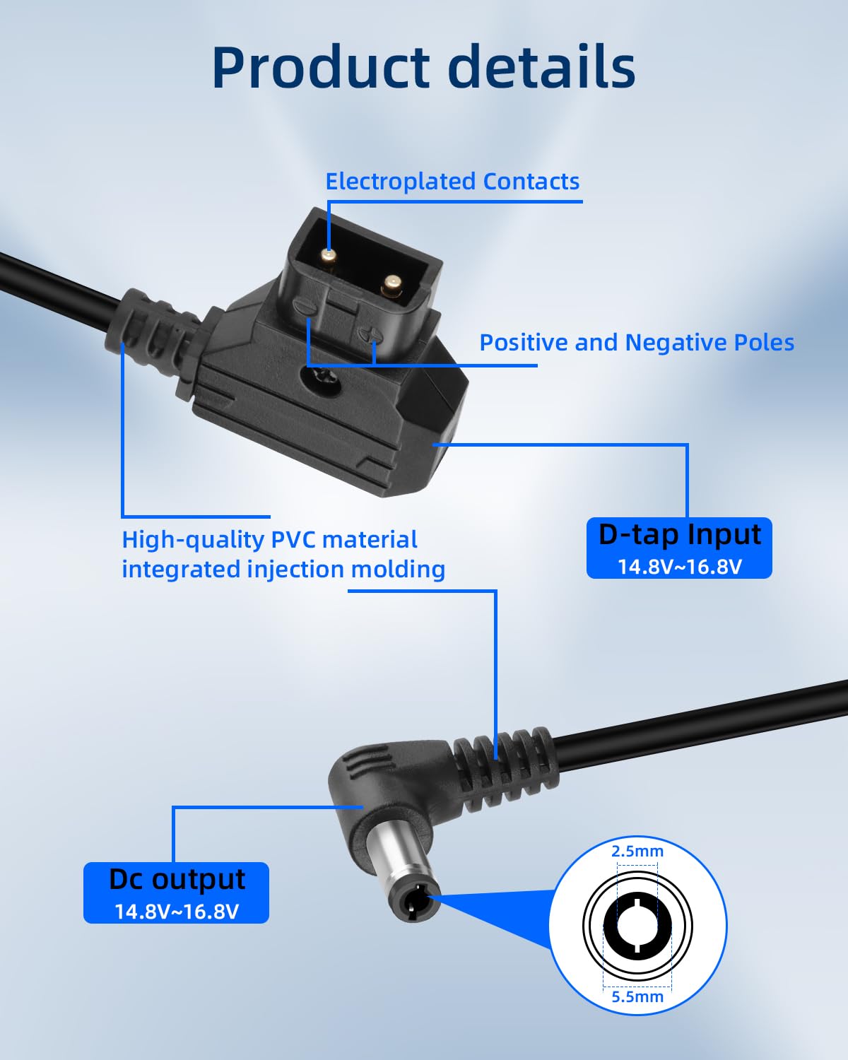 Prise B : connecteur mâle D-TAP standard. Câble Spiralé Micro Hdmi Vers Hdmi Angle Coudé À Gauche 90°Degré... Son design rétractable permet un rangement et une utilisation pratiques, avec une longueur de base d'environ 40 cm et une longueur étendue jusqu'à 1,5 m Assurez-vous que la tension fournie par votre batterie se situe dans la plage d'entrée acceptable de votre appareil connecté. Alimentation Caméra D-Tap XMSJSIY D-Tap To DC 5.5×2.1mm Gewickeltes Stromkabel 15V D-Tap Stecker Zu 5521 DC Stecker Right Angle Adapter Federkabel Für Video Kamera, DSLR-Monitor, DV Connector - 40CM / 1.57INCH Câble Ressort Portable Les connecteurs DC5521 et D-Tap à 90 degrés sont conçus pour résister au desserrage, assurant ainsi une transmission de courant stable et une durabilité à long terme Nom du produit : câble de connexion D-Tap B-Tap vers DC 5,5 x 2,1 mm. Le cordon d'alimentation à ressort D-Tap vers DC5521 à angle droit dispose d'un noyau robuste qui minimise la génération de chaleur pendant le fonctionnement. Le câble D-Tap mâle vers DC 5,5 x 2,1 mm à angle droit est compact, léger et très portable. Ses connecteurs à angle droit aux deux extrémités améliorent la flexibilité, ce qui le rend idéal pour une utilisation avec des appareils muraux et dans des espaces restreints Veuillez noter que ce câble ne comprend pas de régulateur de tension, les tensions d'entrée et de sortie sont donc identiques. Prise A : prise CC 5,5 x 2,1 mm (également compatible avec les ports CC 5,5 x 2,5 mm). Vhbw Adaptateur câble spiralé D-Tap Sony NP-FW50 pour Sony Alpha A6300... Caractéristiques du produit : Ce câble fournit une connexion d'alimentation d'une batterie D-TAP à un appareil avec un port d'entrée CC de 5,5 x 2,5 mm. Le câble de connexion circulaire D-Tap vers DC 5,5 x 2,5 mm dispose d'un connecteur mâle D-Tap standard à une extrémité, qui peut être connecté à des panneaux ou des batteries équipées d'un port D-Tap et est compatible avec l'entrée CC. Câble d'alimentation D-TAP 2 broches mâle vers DC 5,5 x 2,1