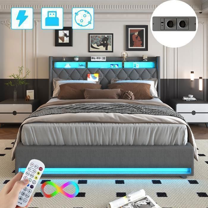 Lit Coffre 160x200 Sommier Chevet LED Et Prise Usb Inclus Romane Bois... Afin de réduire le risque d'endommagement, le cadre de lit est expédié dans 3 cartons et peut arriver à des dates différentes. Lit Avec éclairage RGB Lit Rembourré LED En PU 160x200 Avec Connexion USB Et Espace De Rangement, Lit Coffre Double Avec Sommier à Lattes,sans - Maison Lit Hydraulique Rangement LED 【Éclairage LED à 360°】 : une bande lumineuse LED périphérique contrôlée par une application ou une télécommande permet de choisir parmi des centaines de couleurs. L'éclairage réagit à la musique et aux sons et s'adapte au rythme, pour une expérience lumineuse et musicale exceptionnelle. 【Lit de rangement hydraulique】 : équipé de tiges hydrauliques de haute qualité pour une utilisation fluide et facile, rendant l'utilisation quotidienne de l'espace de rangement plus confortable. Poids de l'utilisateur:200 KG /440 LBS Boxspring requis:aucun Montage requis:Oui Type de charge:3 USB + 1 Type C Contenu du coffret:Sommier+fonction de charge+LED Matelas applicable(matelas non inclus):160x200 CM Poids brut/net(KG):74., 74/67 Quantité du paquet:3 【Choix de couleurs et options de taille variés 】: Disponible en trois couleurs élégantes (beige, gris et blanc) et deux tailles (160 cm et 180 cm). Fabriqué à partir de matériaux de haute qualité tels que le lin et le cuir PU, qui sont doux pour la peau et faciles à nettoyer - idéal pour différents styles d'intérieur. 【Remarque】 : ce produit ne contient pas de table de nuit ni de matelas. Lit coffre rembourré - Noir - 160x200 cm - Éclairage LED - Prise USB Type-C - Rangement intégré