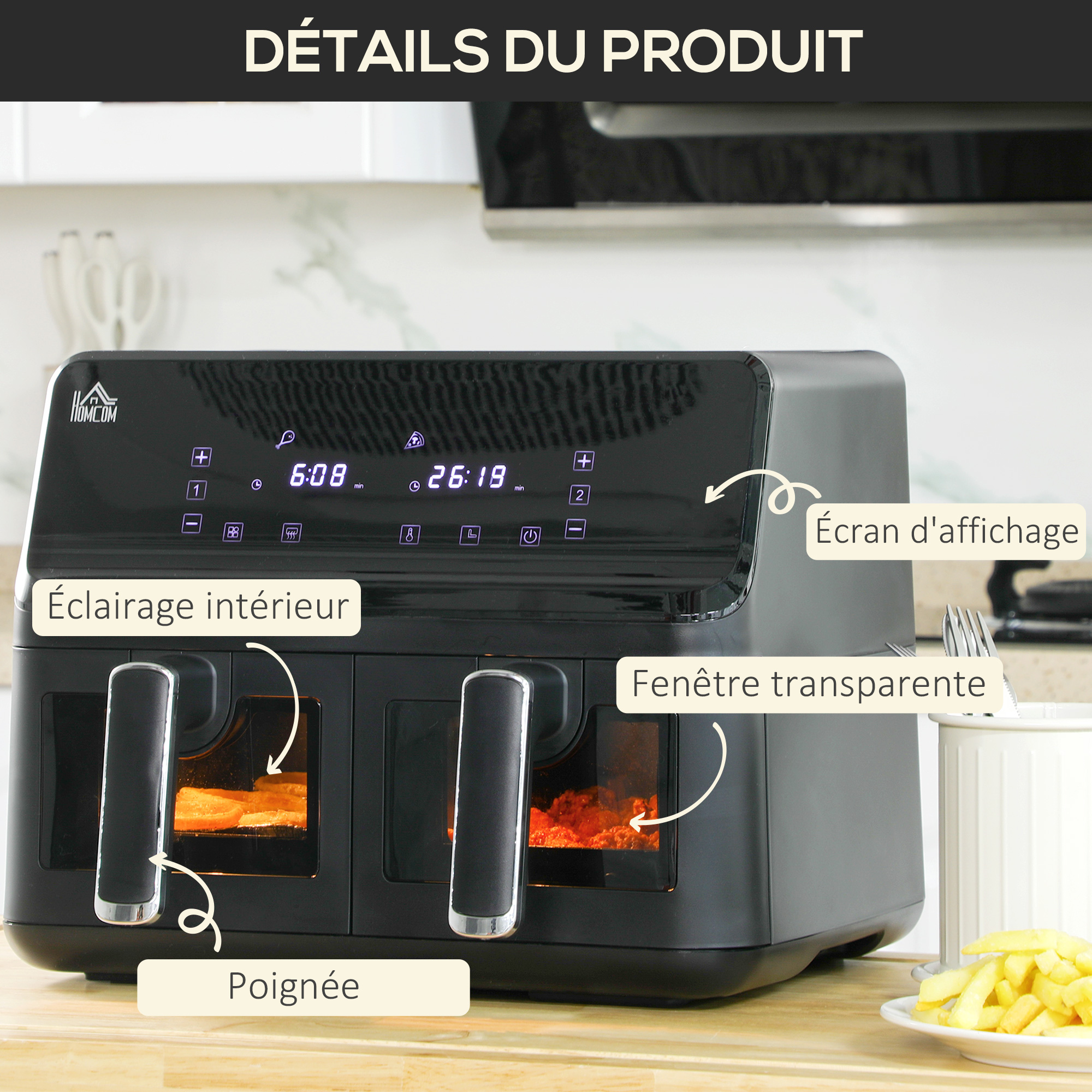 Fabriquée avec des matériaux exempts de PFOA et de BPA Friteuse sans Huile 9L, Double Zone Air Fryer avec Fenêtre Visible, Friteuse à Air Chaud avec 8... Une friteuse sans huile à air pour allier plaisir et alimentation équilibrée. Le système de circulation d'air chaud à 360° assure un chauffage uniforme et rapide Friteuse Electrique Friteuse Sans Huile à Air Chaud - HOMCOM - Air Fryer - 1700W 6,5L - 8 Programmes -température Réglable - Electroménager Friteuse Sans Huile Air Fryer 4L La température peut être réglée de 80 à 200 °C et dispose d'un minuteur de 60 minutes Package includes: 1 x Friteuse Sans Huile 1 x Panier Amovible 1 x Manuel Friteuse sans huile à la capacité de 4 litres, idéale pour cuisiner pour toute la famille SPÉCIFICATIONS DE LA AIR FRYER : Dim. totales : 34,2L x 25,6l x 31,8H cm. Friteuse à air multifonctionnelle qui combine les fonctions de cuisson au four, grill et friture dans un seul appareil de cuisine L'écran numérique LED de la friteuse électrique sans huile offre une utilisation facile et affiche la température et le temps HOCO Friteuse à air sans huile air fryer double copartient 8 L - 2400 W - 10 prograes... La friteuse sans huile HOMCOM de 4L avec panier détachable propose 12 programmes prédéfinis, offrant un mode de cuisson sain et savoureux. Astuce : secouez le panier à mi-cuisson pour une cuisson homogène, surtout pour les frites ou crevettes. HOMCOM Friteuse à air sans huile air fryer double compartiment 8 L