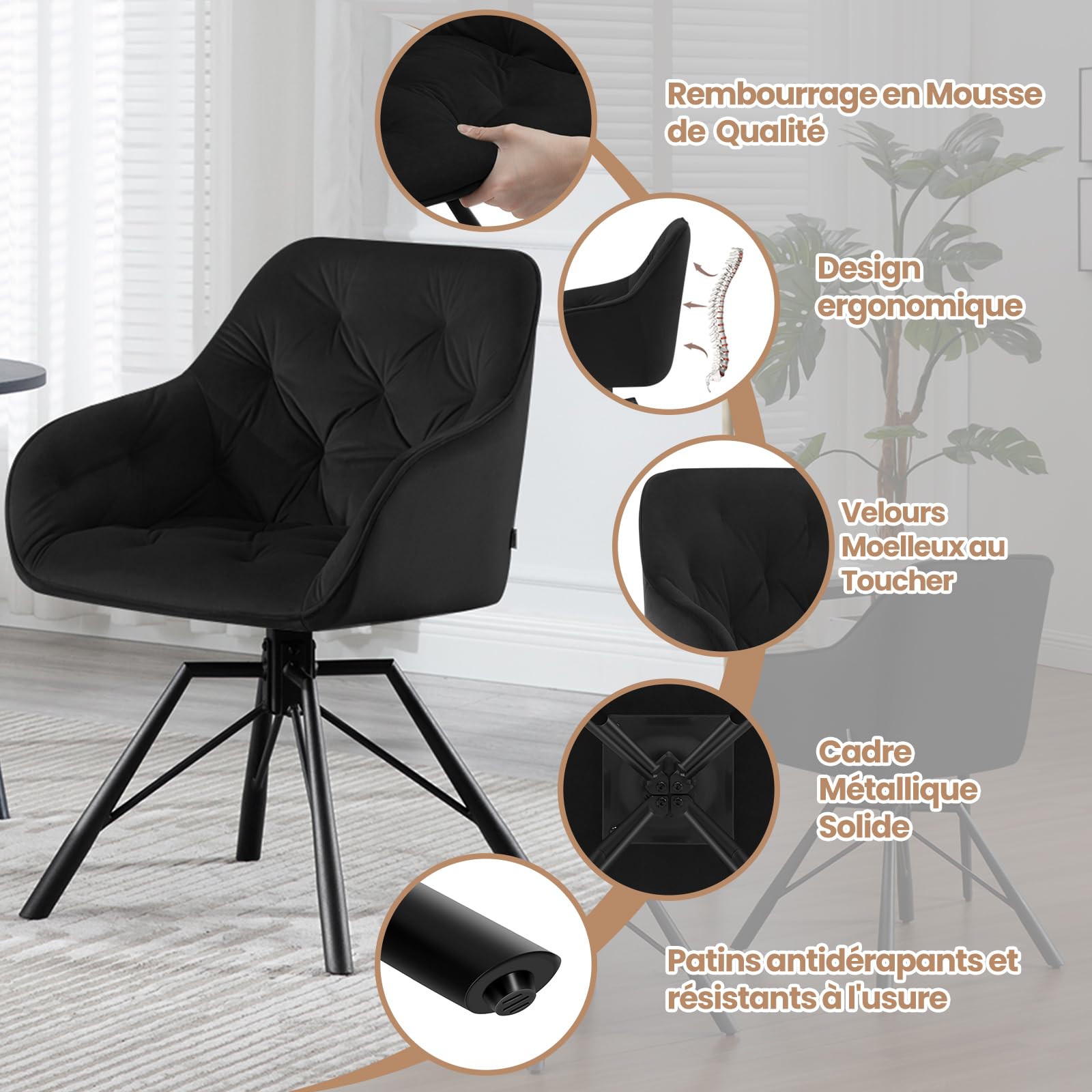 La chaise rembourrée de l'éponge élastique est recouverte de velours respirant Chaises Salle à Manger Pivotantes WOLTU Chaises De Salle à Manger Lot De 2, Chaise De Cuisine Assise Rembourrée En Velours épais Pieds En Métal, Gris Foncé Chaises Pivotantes MONTAGE FACILE : Avec l'aide du manuel illustré et du kit d'accessoires que nous offrons, il est facile à assembler cette chaise de salle à manger moderne. MULTIFONCTIONNEL : La chaise pivotante avec accoudoirs possède un dossier de 38 cm de haut et une assise de 40,5 cm de large. Elle peut être utilisée comme chaise de cuisine, chaise de salon, chaise de coiffeuse, chaise de bureau, chaise de chambre à coucher, chaise de lecture, etc. L'assemblage sera terminé en un rien de temps. 10 astuces de rangement géniales pour Noël, boite de rangement boules de noel Sur ce fauteuil pivotant à 360°, vous pouvez communiquer avec d'autres personnes ou de vous détendre en lisant. ERGONOMIQUE & CONFORTABLE : Le dossier de cette chaise de salle à manger ergonomique s'adapte parfaitement à la courbe de votre dos. Siège doux et confortable Donc, elle est spacieuse, confortable et polyvalente. Dimensions hors tout : 57,5x53x82,5 cm (LxPxH) CONFORT ERGONOMIQUE : Le siège large et le dossier haut de la chaise cuisine sont soigneusement rembourrés d'éponge de haute densité pour vous offrir un soutien relaxant. Le revêtement en velours est délicat, soyeux et respirant pour une assise confortable et un aspect attirant WOLTU Lot de 6 Chaises de Salle à Manger Pivotantes, Fauteuils Rembourrés en Chenille et Velours... Vous allez trouver votre chaise rêvée ! Avec son design simple et élégant et sa courbe douce du dossier, la chaise de salle à manger vous soutient bien pour soulager la fatigue. Le grand siègerembourré de l'éponge haute densité offre un bon soutien. Vous êtes toujours à la recherche d'une chaise idéale : confortable, robuste et adaptée à n'importe quelle pièce ?Chez WOLTU, il y a une vaste sélection de chaises, avec la couture raffinée et les détails réfléchis!