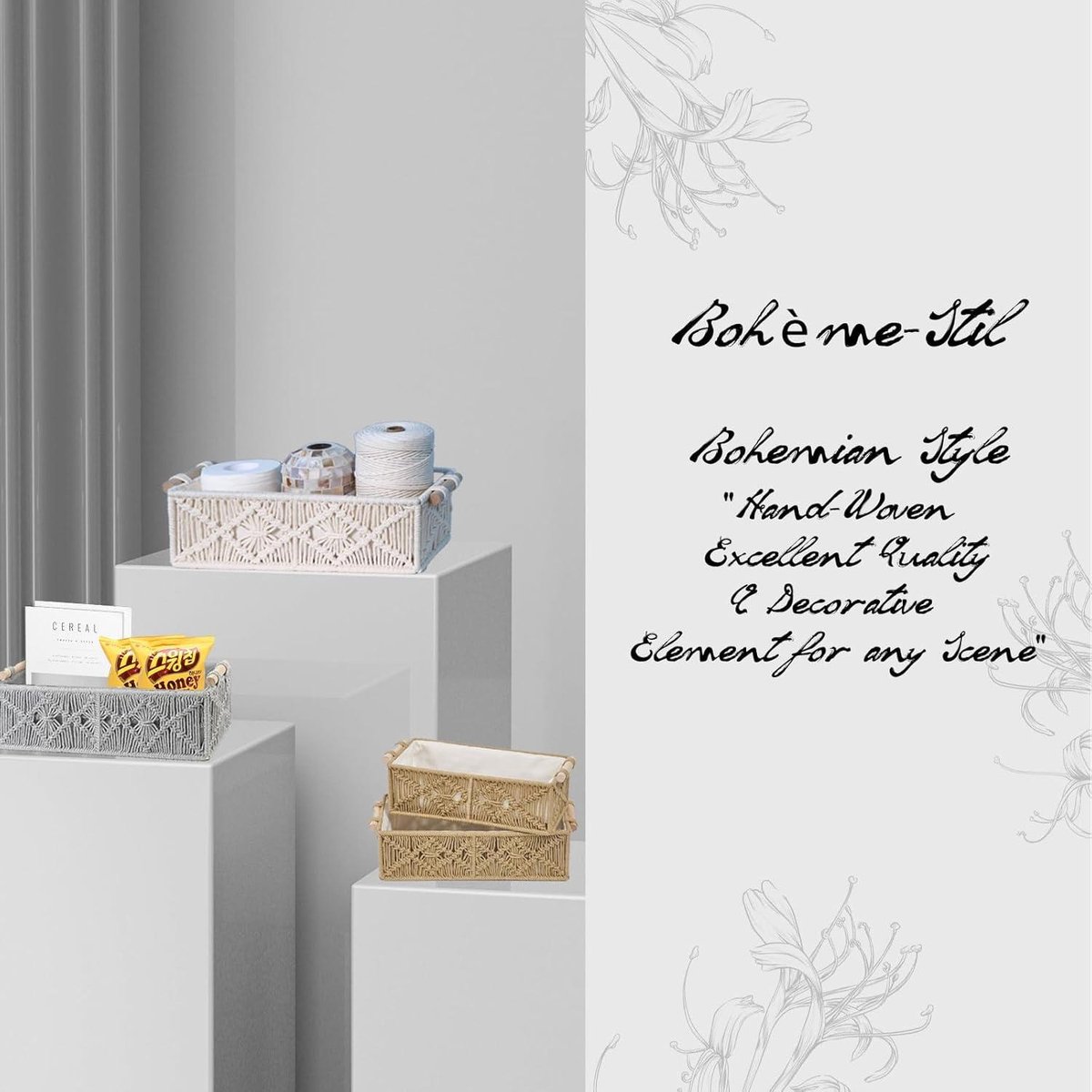 Les couleurs neutres et le design élégant garantissent qu'il s'intègre parfaitement dans n'importe quelle maison. Lot de paniers tressés. 3 tailles. Cache-pot. Avec poignées. Gris... Cela les rend toujours propres et bien rangés. Mettez de l'ordre dans votre chambre et gardez tout à portée de main. Paniers Style Ethnique Ensemble De 2 Paniers De Rangement En Jonc De Mer M-s Caty Couleur Beige Wanda Collection | La Decoration Salle De Bain Le tissu en coton tissé à la main avec structure métallique est doux mais robuste, de sorte que les paniers conservent leur forme et leur uniformité. Poignée robuste pour faciliter le mouvement et la décoration. Récipients de rangement multi-usages : ces conteneurs aident à ranger les objets du quotidien tels que le papier toilette, les serviettes, les cosmétiques, les accessoires sur la commode, les jouets pour bébé, les couches et autres petits objets. Cadeaux exquis : utilisez ces paniers comme paniers cadeaux et remplissez-les de surprises de Noël pour vos amis ou votre famille. Qu'il s'agisse de bougies parfumées, d'huiles essentielles ou d'articles de toilette, ces paniers sont parfaits comme idée cadeau. Cadeau bien pensé : utilisez-le comme panier cadeau pour un cadeau de Noël et remplissez-le de plusieurs cadeaux sur le thème de l'heure du bain, tels que des bougies, des sels, des bombes de bain, des huiles et des lotions pour vos amis ou votre famille. Complément parfait à la décoration de la salle de bain : ces jolis paniers évoquent un goût chaleureux et noble qui est à la fois harmonieux et esthétique. Idéal pour une utilisation dans la salle de bain, la chambre à coucher, la chambre d'enfant, la chambre, le salon, la chambre d'amis, la cuisine, le bureau,Panier de rangement avec poignée : chaque panier est équipé d'une poignée eois robuste qui facilite le déplacement et la décoration des paniers Le design de la doublure empêche le matériau en coton de jute de coller à l'objet, plus propre et plus sûr. Laissez le panier de présentation vide et faites de la surprise de votre cadeau de Noël quelque chose de spécial Panier à Bois Lot De 2 Paniers De Rangement Tressés En Macramé