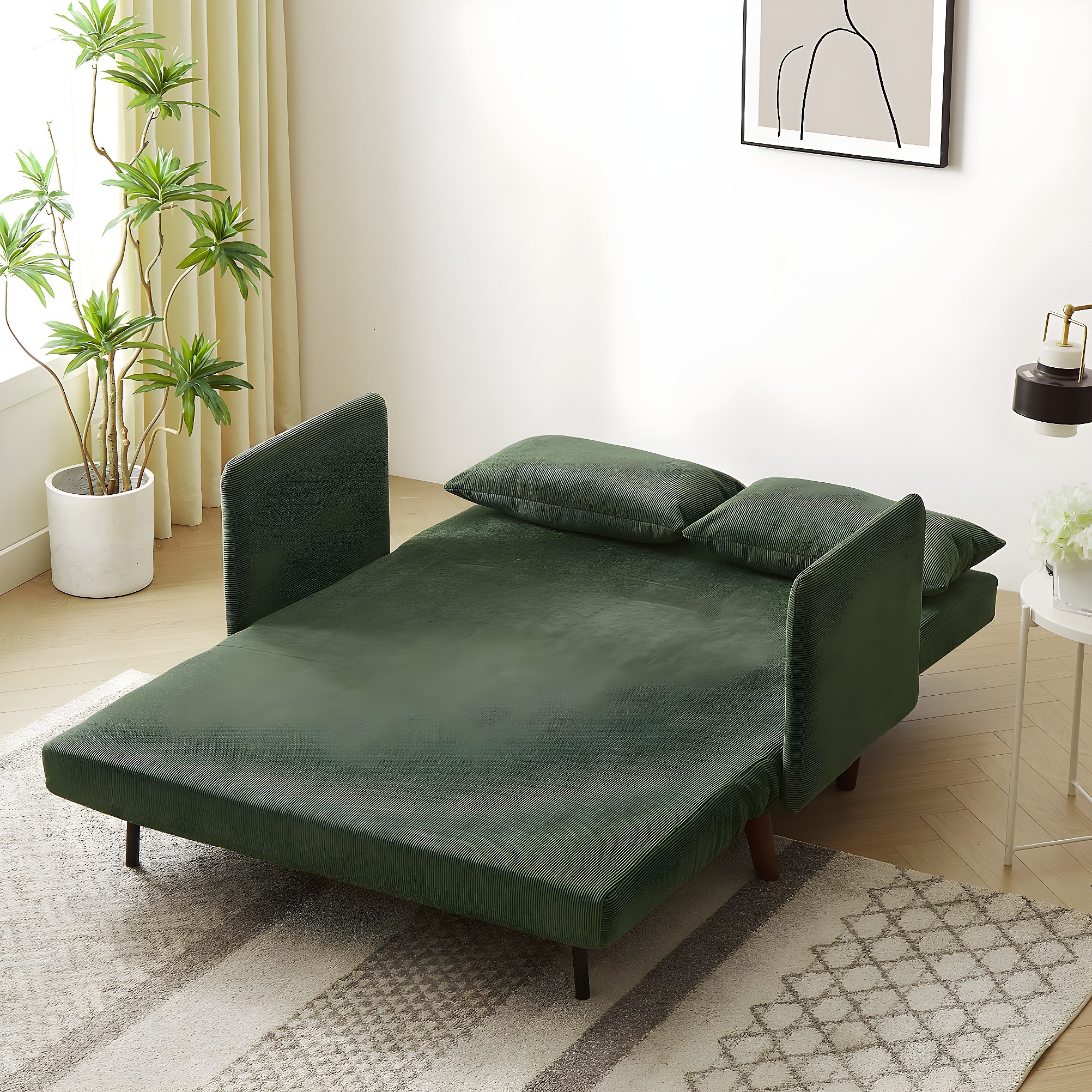 Cet élégant canapé-lit 2 places redéfinit l’art de vivre dans les petits espaces grâce à son design raffiné ! Pieds en métal plaqué or : Équipés de six pieds robustes en métal finition dorée, ils supportent une charge de plus de 150 kg, sont résistants aux rayures et particulièrement stables. Associés aux éléments décoratifs métalliques modernes, ils créent un design harmonieux. Transformez ainsi le canapé en un lit simple confortable en un clin d’œil, évitant ainsi les invités qui passent la nuit. Mousse ergonomique haute densité : Garnie de mousse haute résilience qui épouse parfaitement le dos et les lombaires. Associé à des détails métalliques modernes, ce design apporte une touche d'élégance à votre salon avec un style luxueux et subtil. Canapé Petit Espace Pieds Dorés Canapé Convertible 2 Places Zubaliya - Dossier Réglable 3 Canapé Lit 2 Places Velours Zubaliya Canapé Convertible en Forme de L,canape lit 2 Places Élégant velours de qualité supérieure : Fabriqué en velours haute densité, résistant à l'abrasion et au toucher soyeux, il est agréablement doux, anti-taches et ne se décolore pas. Le système innovant de réglage du dossier à 3 positions vous permet de basculer entre trois positions en quelques secondes : 110° pour une assise droite, 135° pour un film relaxant et 180° pour un sommeil à plat. Espace de rangement dissimulé : Grâce aux pieds de canapé de 24 cm de haut, un aspirateur robot peut facilement nettoyer en dessous. Dossier réglable]: Le dossier peut être réglé sur trois positions : 108°, 135° ou 180° à plat. Cette polyvalence le rend parfait pour écouter de la musique... Transformez ainsi le canapé en un instant, idéal pour travailler, se détendre ou recevoir des invités. Accoudoirs arrondis et courbés : Les accoudoirs élégamment courbés et légèrement incurvés réduisent le risque de blessures par impact ; une solution sophistiquée pour les espaces de vie élégants et sécurisés. Elle conserve sa forme, même en position assise ou allongée prolongée, pour une sensation de confort digne d'un matelas haut de gamme. Zubaliya Canapé Convertible en Fore de L,canape lit 2 Places... La hauteur sous plafond surélevée offre également un espace pratique pour ranger livres, pantoufles et autres objets du quotidien : la solution idéale pour les petits espaces. Lot de 2 coussins : L'ensemble comprend deux coussins moelleux séparés, au toucher « nuage », qui peuvent être utilisés comme coussins de canapé ou, si nécessaire, transformés en oreillers temporaires, pour un confort accru en position assise et au lit. Dossier double réglable indépendamment : Les deux dossiers peuvent être réglés séparément selon trois angles fixes : assis, penché en arrière ou complètement allongé.
