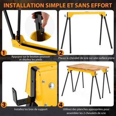 Caractéristiques : Structure en métal galvanisé pour une stabilité fiable 2 tréteaux peuvent supporter jusqu'à 375 kg ensemble Chacun pèse 9 lbs, simple à transporter avec poignée Taille pliable compacte pour un rangement peu encombrant Surface antidérapante protège les pièces de travail Avec des trous prépercés pour un placement ferme Pas besoin de montage, économisant temps et efforts Spécifications : Couleur : Noir + Orange Matériau : Métal Galvanisé Dimensions Totales : 100 x 38 x 78 cm (L x l x h) Dimensions Pliées : 100 x 4 x 8., 5 cm (L x l x h) Capacité de Charge de 2 Tréteaux : 375 kg Poids Net : 8 kg ; Contenu de l'emballage : 2 x Tréteaux Portables 1 x Instructions 【Design pliable et portable】Chaque tréteau pèse seulement 8 kg et comprend une poignée ergonomique. 【Placement sécurisé】Avec une praticité à l'esprit, les tréteaux sont dotés de trous prépercés pour des vis. De plus, les trous prépercés permettent d'utiliser des vis pour fixer fermement les pièces de travail en place. VINGO Lot de 2 Tréteaux Télescopiques, tréteau pliable métal Charge La charge maximale est de 375 kg par ensemble, garantissant stabilité et solidité pour les taches lourdes. Chaque tréteau dispose d'une surface de travail antidérapante pour maintenir les matériaux sécurisés et sans rayures. Construit en métal galvanisé robuste, les 2 tréteaux avec structure triangulaire peuvent soutenir jusqu'à 375kg ensemble, offrant un support solide pour le... 【Pas besoin d'assemblage】Prêts à l'emploi dès la sortie de la boîte, ces tréteaux ne nécessitent aucun assemblage. Description : Découvrez une commodité ultime avec ce lot de 2 tréteaux portables. Les pieds se replient facilement en relachant la charnière de métal, rendant ces tréteaux exceptionnellement pratiques pour le rangement et le transport. Lot 2 Tréteaux Costway Lot De 2 Tréteaux Portables En Métal Galvanisé, Surface Antidérapante, 100 X 38 X 78 Cm Treteaux Pliable SWANEW Lot de 2 Tréteaux d'échafaudage, Hauteur Réglable 80-130CM, jusqu'à 200kg, Bleu... Cette caractéristique permet la fixation ferme des matériaux durant le travail.