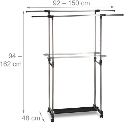 Avec 2 étagères pratiques pour chaussures et sacs Penderie Tissu Relaxdays Porte-manteaux à Roulettes Avec 2 étagères En Métal Et Penderie Roulante Couloir Rangements en non-tissé : penderie à roulettes avec 2 grandes étagères pour chaussures et chapeaux. Mobile grâce à 4 roulettes dont 2 avec freins de stationnement Sans plis : porte-vêtements noir pour suspendre sans plis vestes, chemises, blouses, etc. Mobile : porte-manteaux à 4 roulettes pour un déplacement facile - freins pour un maintien sûr. Relaxdays Portant, porte-manteaux, tringle à vêtements, 5 surfaces de Charge maximale par étagère : environ 10 kg Montage sans outil grâce à un système d'emboîtement simple Portant mobile avec étagères Pour accrocher des chemises, chemisiers, robes, etc. Les articles de décoration ne sont pas inclus dans la livraison Peu encombrant : ce portant compact est parfait pour les petits espaces ou les couloirs étroits. Dimensions (H x l x P) : environ environ 160 x 55 x 42 cm · Charge maximale de la tringle à vêtements : environ environ 15 kg · Charge maximale par étagère Descriptif technique ; RELAXDAYS · Porte-manteau Relaxdays, avec roulettes et 2 étagères, H x L x P : 160 x 55 x 42 cm, métal, tissu non tissé, noir · PENDERIE... La construction tubulaire robuste en fer garantit stabilité et durabilité. Matériau : alliage Fer, non-tissé, plastique , Couleurs assorties Pour couloir, bureau, chambre à coucher et dressing Design peu encombrant idéal pour les petits espaces L'aide pratique offre non seulement de la place pour vos vêtements, mais aussi pour les chaussures et accessoires grâce à 2 étagères solides en non-tissé.