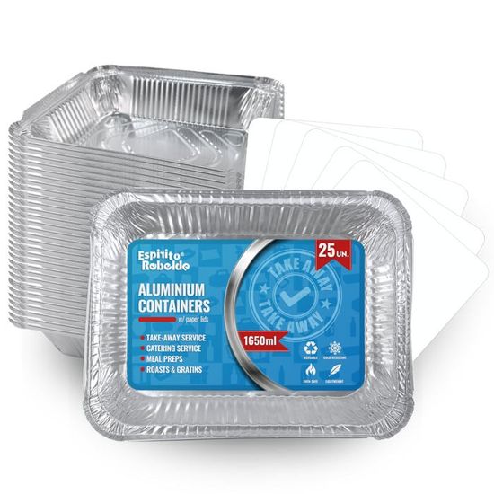 Peu encombrant et empilable : les bols jetables en aluminium sont empilables, de sorte qu'ils peuvent être rangés pour économiser de l'espace, de sorte que vous pouvez garder votre cuisine organisée et prête pour tout projet de cuisine ou de pâtisserie. Plat Congelation Alimentaire Lot De 20 Barquettes Jetables En Aluminium, Ovales Argentées Plat Aluminium Profitez d'un shopping confortable chez HEIYUET Autres caractéristiques du bol en aluminium de 3500 ml : Grands bols en aluminium d'une capacité de 3500 ml, parfaits pour portionner et conserver les repas au réfrigérateur ou au congélateur. Ces emballages jetables sont très appréciés par les métiers de bouche, car dans un même contenant on peut à la fois cuire, stocker et présentez les préparations Chaleur : Toutes les dimensions sont mesurées manuellement, ce qui peut entraîner de légères différences. Elles peuvent également être utilisées pour la préparation des aliments au four ou sur le barbecue. Barquette Aluminium Avec Couvercle 10 pièces,Plat aluminium jetable... Contenu de l'emballage : 20 coques en aluminium. Le kit comprend 20 récipients en aluminium de 32 x 26 x 6 cm, assez grands pour répondre à vos besoins quotidiens. Pratique à utiliser : ces bols jetables en aluminium pour four rendent le nettoyage après les repas un jeu d'enfant. barquette traiteur aluminium 3.5L grand volume économique petit prix Les grilles de barbecue en aluminium sont idéales pour la cuisson, la cuisson, la congélation et le service des aliments et sont parfaites pour les fêtes, les fêtes ou la préparation hebdomadaire des repas. Vous n'avez pas besoin d'être lavés, mais vous pouvez simplement les jeter après utilisation.
