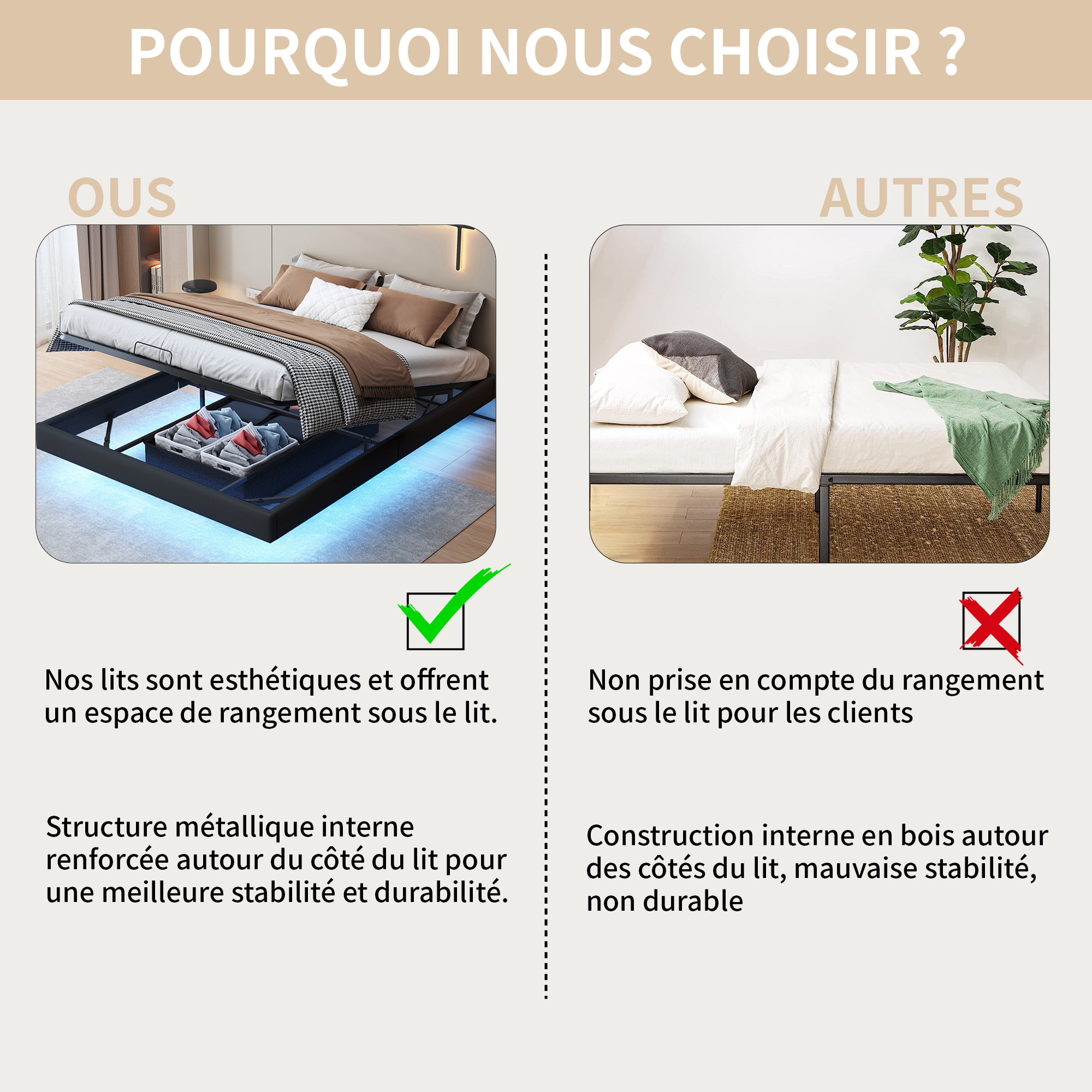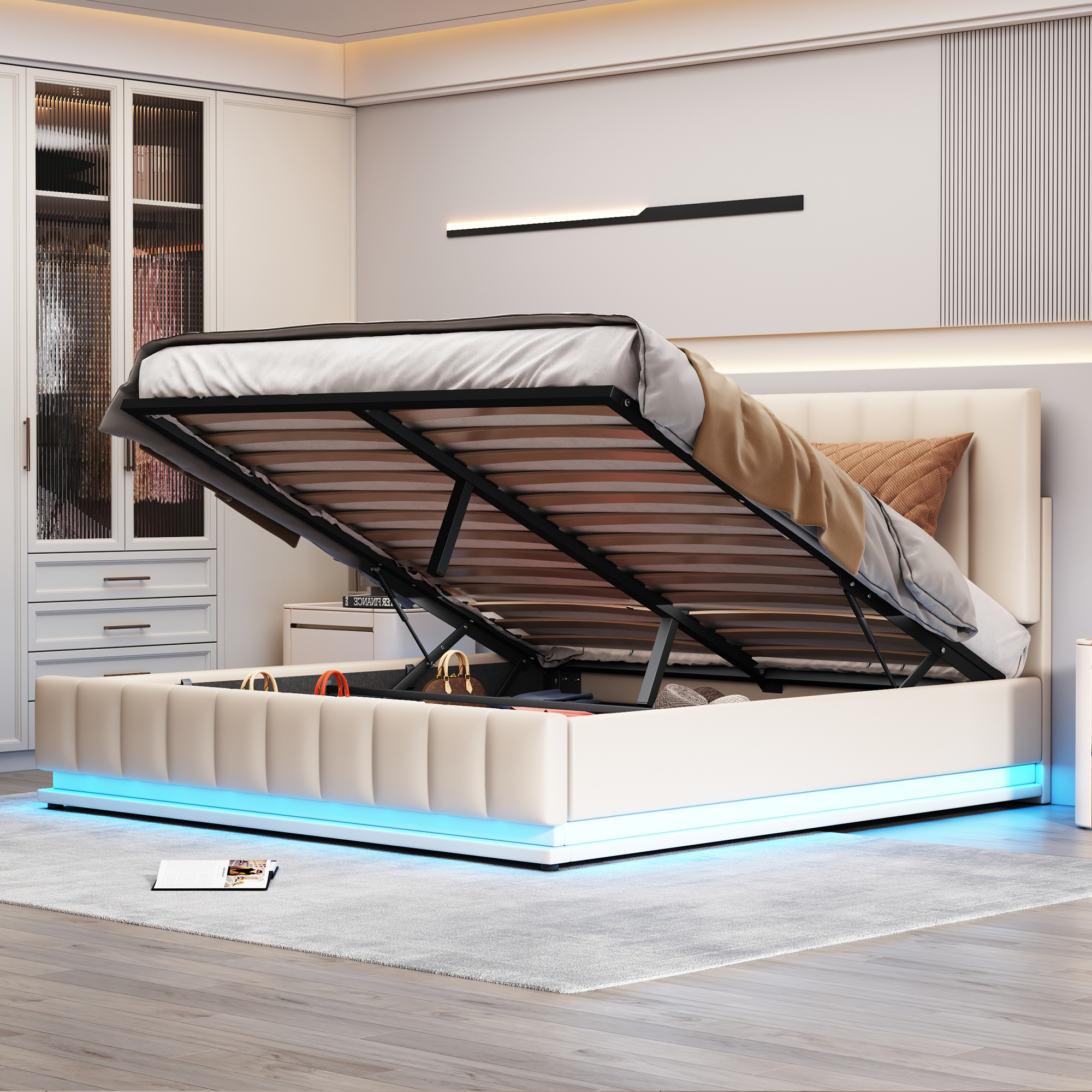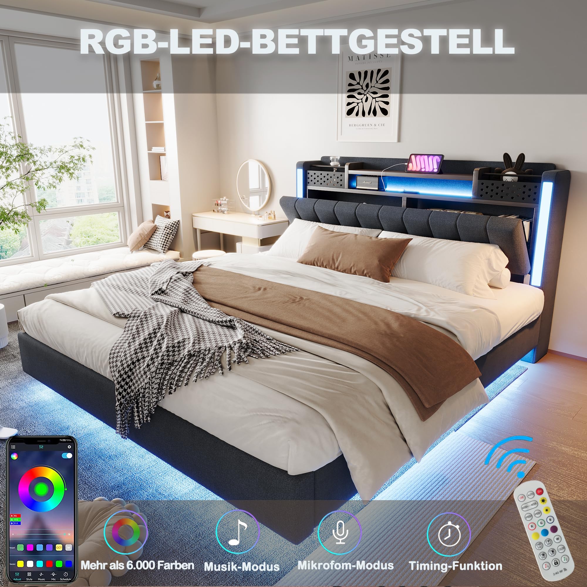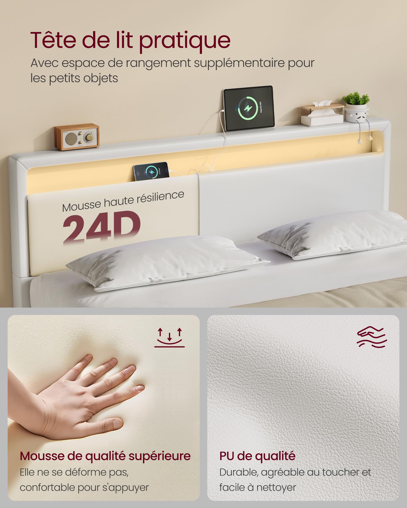 【Réglage Flexible】Ce lit double 160x200cm est doté d'une tête de lit réglable conçue pour répondre à différents besoins. 【Éclairage LED】 Les lumières LED du lit rembourré sont contrôlables via une application ou une télécommande. Le grand espace de rangement sous le matelas vous permet de gagner de la place et de l'argent dans votre garde-robe. Éclairage ajustable : Personnalisez l’ambiance de votre chambre avec l’éclairage réglables LED de ce cadre de lit. Lit coffre adulte 160x200cm avec éclairage LED et recharge USB, sommier Facilement interchangeable sans outils, elle offre un ajustement sûr, pratique et esthétique. L’effet de suspension crée une expérience visuelle exceptionnelle qui transforme votre chambre en une oasis de détente. Réglage Flexible]Ce lit double 160x200cm est doté d'une tête de lit réglable conçue pour répondre à différents besoins. Facilement interchangeable sans outils, elle offre un ajustement sûr, pratique et esthétique. [Effet Flottant]Par ses pieds dissimulés, ce lit 160x200 s... N'hésitez pas à nous contacter si vous avez des questions. Description: Effet flottant : Votre lit semble flotter au-dessus du sol ! Différentes couleurs, modes et luminosité réglables permettent de créer une ambiance chaleureuse. Lits Pour Adulte Lit Double 160 X 200 Cm Lit Flottant Tête De Lit Haute Blanc Nuage | Maisons Du Monde Lit Adulte 160x200 Avec Matelas Et Sommier Lit 160 x 200 cm avec éclairage LED pour adulte, cadre de lit flottant, cadre de lit avec lattes en bois, lit double, lit en polyuréthane, montage facile, beige (sans matelas 【Expédition en deux colis】Afin de réduire le risque de dommages, ce cadre de lit est expédié en 2 cartons et ils peuvent arriver à des jours différents.