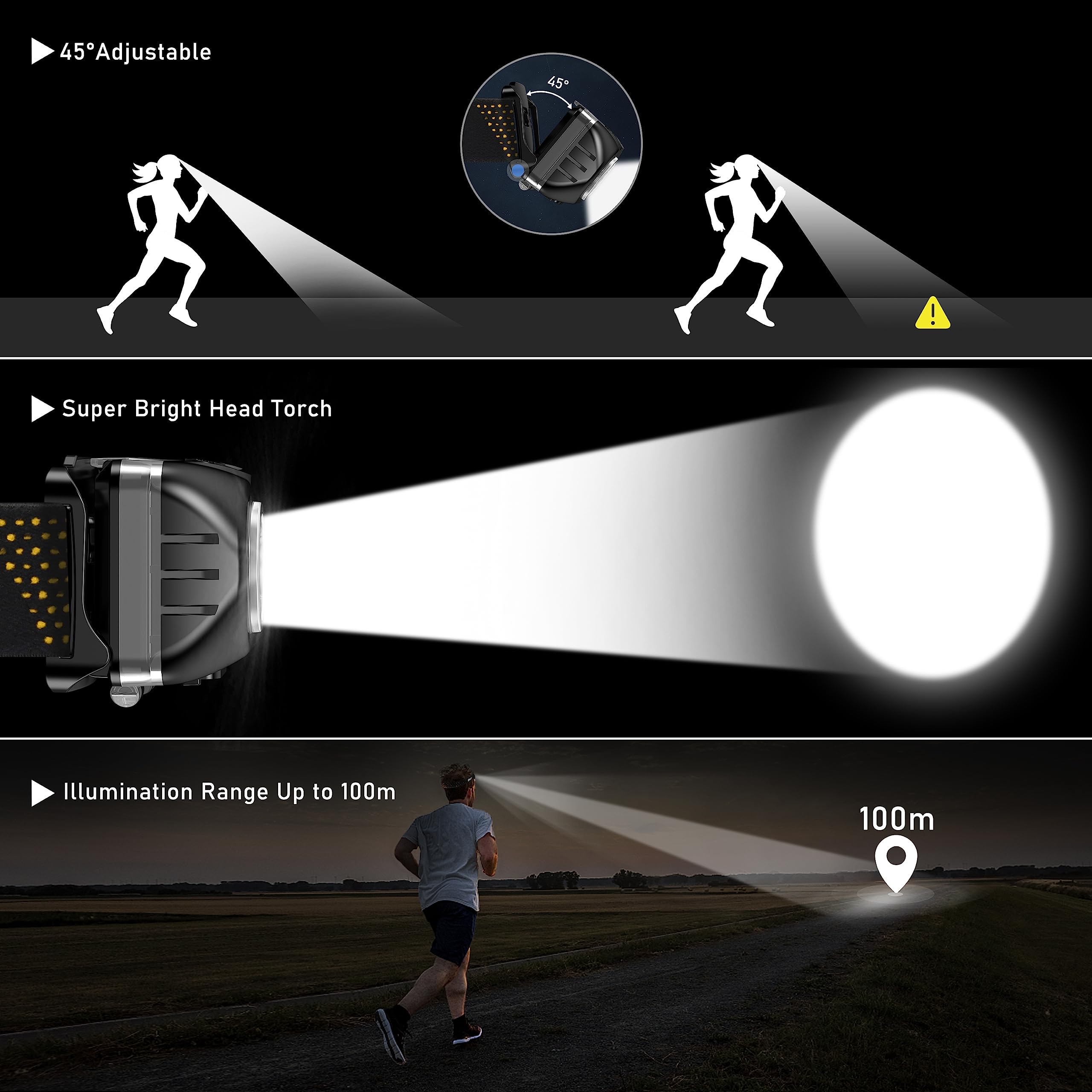 USB C Rechargeable et Longue Durée: Batterie intégrée de grande capacité (1200 mAh) pour une utilisation longue durée. 4 Indicateurs de batterie affichent l'autonomie restante, vous évitant ainsi la gêne d'une panne de batterie soudaine. CLa lampe frontale peut être réglée à 45° vers le haut ou vers le bas pour éclairer la route dans l'obscurité. Il suffit de l'éteindre. Lampe frontale ou lampe ventrale La lampe frontale se recharge complètement en seulement 2H à 3 H et offre jusqu'à 5 H d'autonomie en mode super lumineux et 30 H en mode lumière douce. Conseils: Si la lampe s'éteint inopinément, le mode détecteur réagit probablement au mouvement d'un objet. Lampe frontale rechargeable , [Lot de 2] Lampe frontale super lumineuse 2000 L avec 8 modes d'éclairage, combinaison projecteur, contrôle par capteur, étanche, longue durée de vie de la batterie pour la course à pied, le camping Où que vous soyez, elle dissipe l'obscurité et vous permet de profiter d'une nuit merveilleuse en toute sérénité. 3 boutons pour une utilisation intuitive: ON&OFF/mode standard/mode induction: appuyez sur le bouton induction (lumière verte allumée) et agitez-le à moins de 15cm pour allumer/éteindre la lumière. Confortable et Polyvalente: Dotée d'un bandeau élastique confortable et respirant, amovible et lavable, elle est réglable en longueur et livrée avec 4 clips pour casque pour un maintien parfait. Lampe étanche IPX5 Randonnée Blukar Lampe Frontale Rechargeable 2 Couleurs, 2000L Super Lumineux Torche Frontale LED Puissante, Gradation En Continu,Capteur Mouvement, 12 Modes, Étanche, 30H D'autonomie Pour Course/Urgence,Gris Lampe Frontale Détecteur De Mouvement Randonnée Lampe Torche - Blukar - Rechargeable - IPX6 Étanche - 5 Modes... Étanchéité IPX5 et Utilisation Multi-scènes: Cette lampe frontale est étanche IPX5 et résiste à la pluie et à la neige.