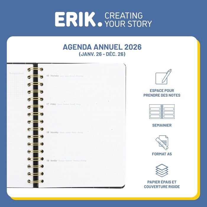 Chez Grupo Erik, nous sommes fiers de proposer des outils d’organisation qui mêlent praticité et créativité Agenda étudiant Professionnel Grupo Erik - Agenda Scolaire 2025 2026 One Piece, Semainier | Isleden Planner 2026 UN AGENDA COMPLET POUR UNE ORGANISATION STRUCTURÉE ET MOTIVANTE Parce qu’une bonne organisation fait toute la différence au quotidien, cet agenda A5 au format semainier est l’outil idéal pour planifier ses journées de manière claire et efficace. Achat en ligne de Agendas année civile, Agendas année scolaire, Agendas 16 mois, Agendas professionnels, Recharges agendas pour professionnels dans la boutique Agendas 2025 - 2026 sur Idéal pour les fans d’organisation et de la série culte ! VISION COMPLÈTE DE LA SEMAINE - Grâce à sa vision hebdomadaire, cet agenda permet de visualiser l’ensemble des tâches, cours, examens et activités en un seul coup d’œil. Grupo Erik - Agenda Annuel Semainier 2026 Friends | Agenda 2026 A5, Fournitures de Bureau : : Fournitures de bureauDemandez le retour de ce produit dans les 14 jours suivant la réception, pour quelque raison que ce soit, afin d'obtenir un remboursement complet (prix de l'article et frais de livraison) dans le cadre de votre droit de rétractation légal. Outre vos droits légaux... AGENDA ANNUEL – Un design coloré et du contenu bien pensé pour structurer chaque semaine avec style. Une solution parfaite pour structurer son emploi du temps tout en restant motivé. UN AGENDA COMPLET POUR SE MOTIVER - Planner annuel, emploi du temps, plannings mensuels et pages de notes, de quoi organiser son année, 2 marques-pages cartonnés, 2 feuilles de stickers et une pochette cartonnée : tout est prévu pour accompagner l’organisation avec méthode et originalité Agenda Professionnel 2025 2026 Grupo Erik - Agenda Les Simpson Chez Grupo Erik, nous créons des produits à la fois utiles, durables et inspirants pour vous accompagner au quotidien. PROFESSIONNELS OU ÉTUDIANTS - Destiné autant aux professionnels qu'aux étudiants, cet agenda est parfait pour suivre ses cours, projets ou rendez-vous semaine après semaine.