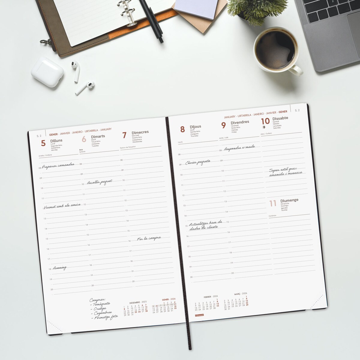 Intérieur : vue hebdomadaire verticale. Finocam Agenda 2022 semainier avec vue verticalede janvier 2022 à... Avec informations sur les jours fériés en Espagne. L'annualité contient des informations intéressantes et d'autres contenus supplémentaires. Rubans Marque-pages Pochette Finocam Impossible Agenda 2026 Avec Vue Hebdomadaire Verticale De Janvier à Décembre (12 Mois) Avec élastique Et 3 Bandes Pointues, Couverture Rigide, Design Minimal Planificateur Annuel Minimaliste Article en espagnol avec annualité multilingue : espagnol, anglais, portugais, galicien, catalan et basque. Le moment est venu. Affichage de la semaine complète à la verticale. Contenu : l'annualité de l'agenda comprend les informations relatives à l'onomastique et aux jours fériés. Matériau : couverture en carton doublé et imprimé., 80 g/m². Pour faciliter la localisation de chaque mois, l'annualité intègre un indicateur sur le côté droit des pages. Format mini, léger et léger. Agenda 2026 Seainier Coins micro-perforés pour localiser rapidement le jour/semaine en cours. Les articles Finocam sont conçus pour optimiser votre organisation personnelle, rendant votre vie plus pratique, confortable et plus belle. Agenda semainier vertical en cuir - Finocam - 12 mois - Janvier à