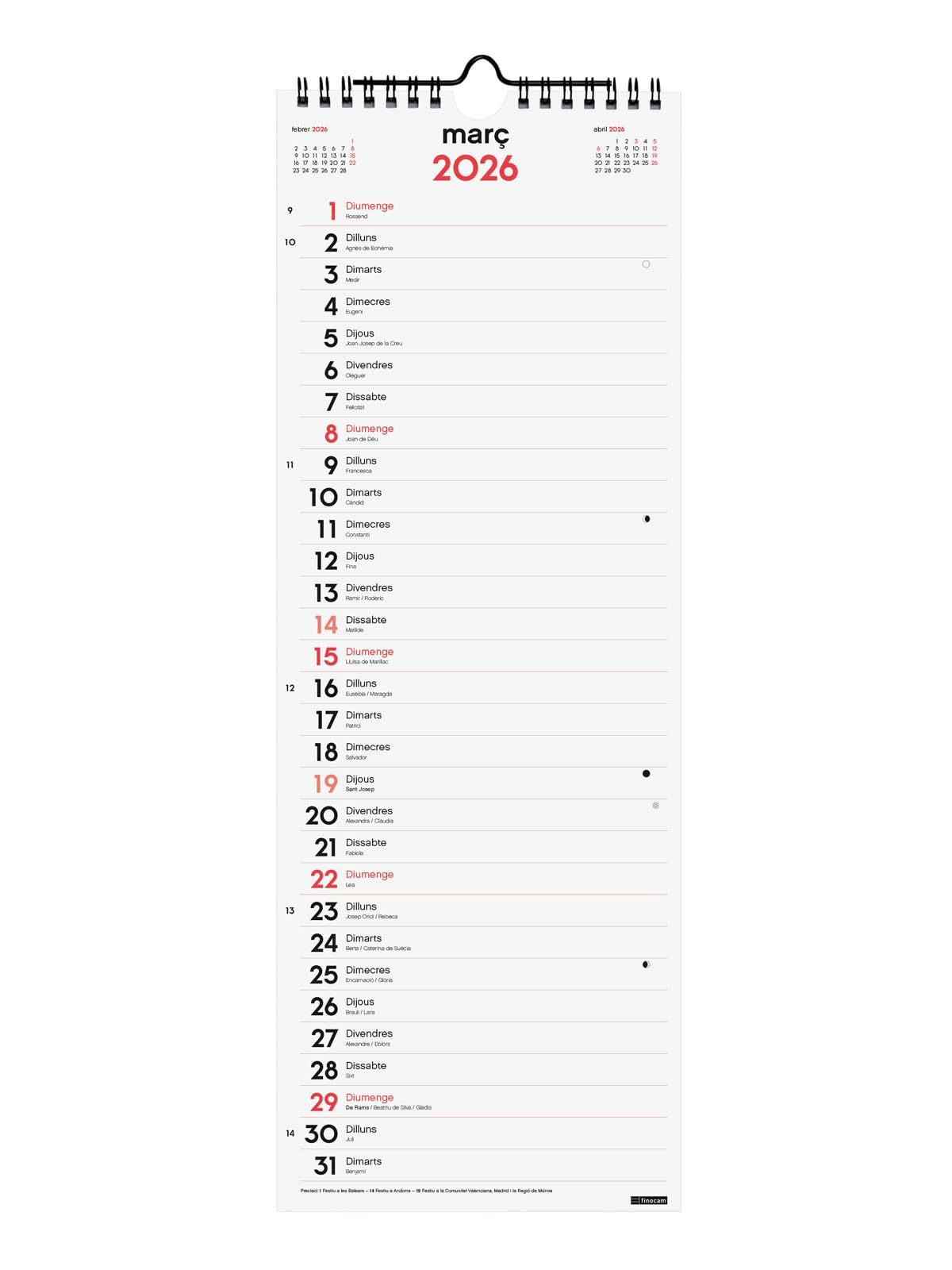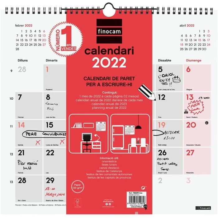 Matériau : spirale double métallique et papier 120 g/m². Calendrier 2026 Mural Finocam Calendrier Mural 2026 Avec Vue Janvier-décembre (12 Calendrier Spirale Métal Papier épais Les articles Finocam sont conçus pour optimiser votre organisation personnelle, vous rendant la vie plus pratique, confortable et plus belle. Intérieur : affichage du mois., Planification mensuelle. Finocam - Calendrier Aimanté Mois Vue Janvier - Décembre 2026 (12 Mois) | Calendrier Magnétique Réfrigérateur | Planificateur Mensuel Neutre Catalan. Finocam... Le calendrier dispose de contenus supplémentaires : calendriers réduits de septembre à décembre de l'année précédente, planning annuel, modèle horaire, calendrier annuel de l'année et de l'année suivante, liste des jours fériés internationaux et codes de pays. Contenu : l'annualité du calendrier comprend les informations relatives aux jours fériés internationaux, aux phases de la lune et aux changements de saison.
