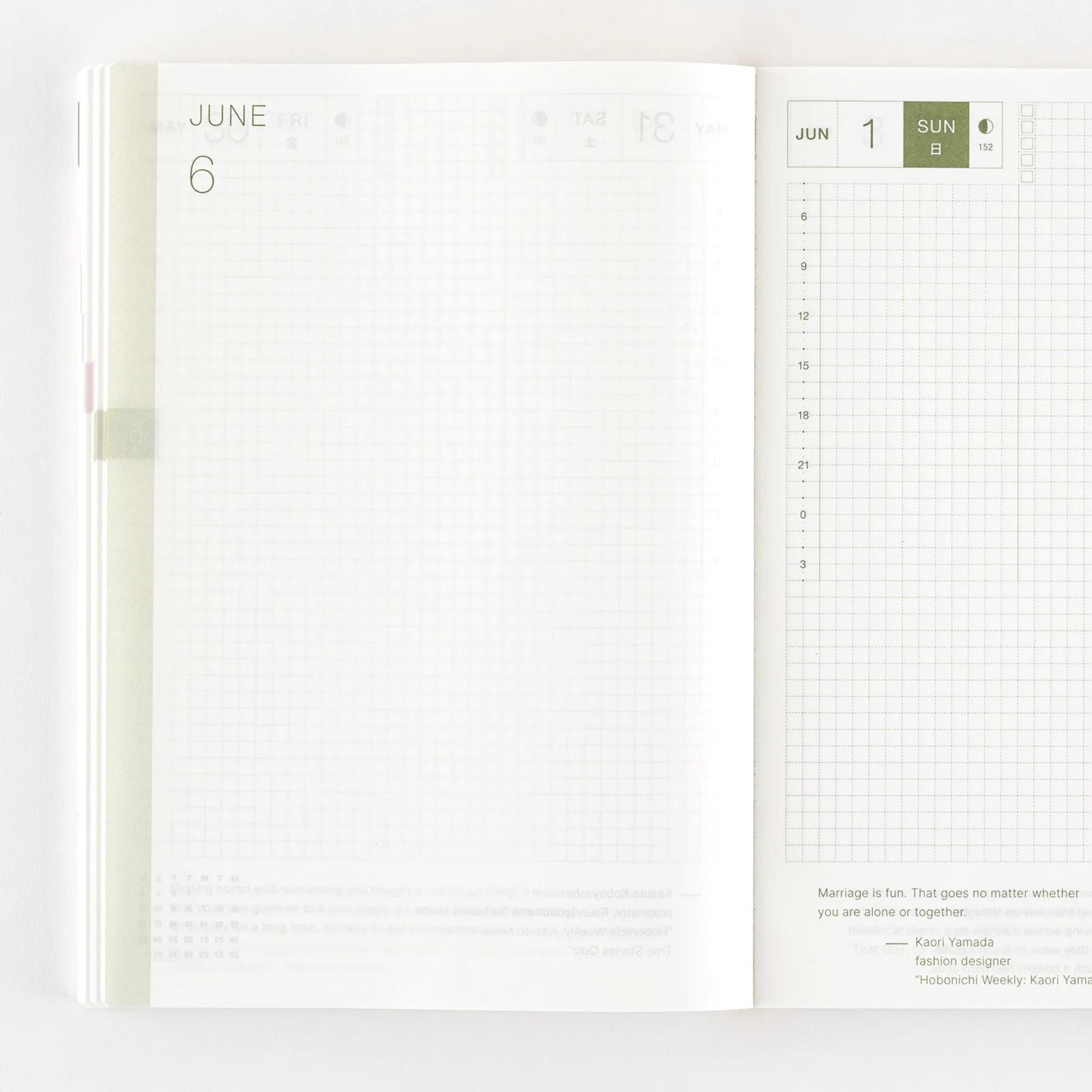 Compact et facile à transporter en format A5 (ou A6), c'est un planificateur polyvalent qui s'adapte à votre vie quotidienne. Hobonichi 2026 Agenda 2025 – Planificateur 2025 A7 En Anglais, Planificateur De Poche Hobonichi Cousin Comprend : calendriers annuels pour 2024, 2025 et 2026 ; index annuel (janvier à décembre 2025, 4 pages) ; calendriers mensuels (décembre 2024 à mars 2026, 32 pages) ; pages hebdomadaires (30 décembre 2024 – 4 janvier 2026, 106 pages). Hobonichi 2026 Weeks Hobonichi Techo 2026 - Carnet De Cousins Anglais/japonais A5 Yumi Kitagishi Cependant, selon le type et la quantité d'encre ou de stylo utilisé, ainsi que les conditions environnementales, certaines encres peuvent traverser ou mettre plus de temps à sécher. Utilisation à la fois domestique et portable : de nombreux utilisateurs gardent le Hobonichi Techo sur leur bureau ou leur table pour la planification quotidienne, tandis que d'autres le transportent pour plus de commodité. Version anglaise et japonaise du modèle Hobonichi Techo Cousin, format A5, au format page par jour *La taille réelle peut varier légèrement. Format A5 (210 x 148 x 18 mm) ; env. Le livre utilise du papier Tomoe River fin et léger mais résistant. Il se caractérise par sa capacité à bien retenir l'encre et à offrir une expérience d'écriture fluide. Le livre a la même reliure au point de fil qu'un dictionnaire, ce qui lui permet de rester à plat pour une écriture confortable Reliure plate à 180° / citations quotidiennes – Le livre s'ouvre à plat sans avoir besoin de maintenir les pages enfoncées, grâce à une reliure à point fileté, une méthode qui coud les pages ensemble avec du fil. Le papier graphique de 3,7 mm est conçu pour une écriture confortable et peut être personnalisé librement, avec des lignes de couleur claire qui ne distraient pas. 445 g ; 544 pages ; anglais Fabriqué avec du papier Tomoe River et reliure cousue. Le papier Tomoe River conçu pour les planificateurs est connu pour sa finesse et sa surface d'écriture lisse. ); Pages quotidiennes (janvier 1 au 31 décembre 2025, 377 pages).