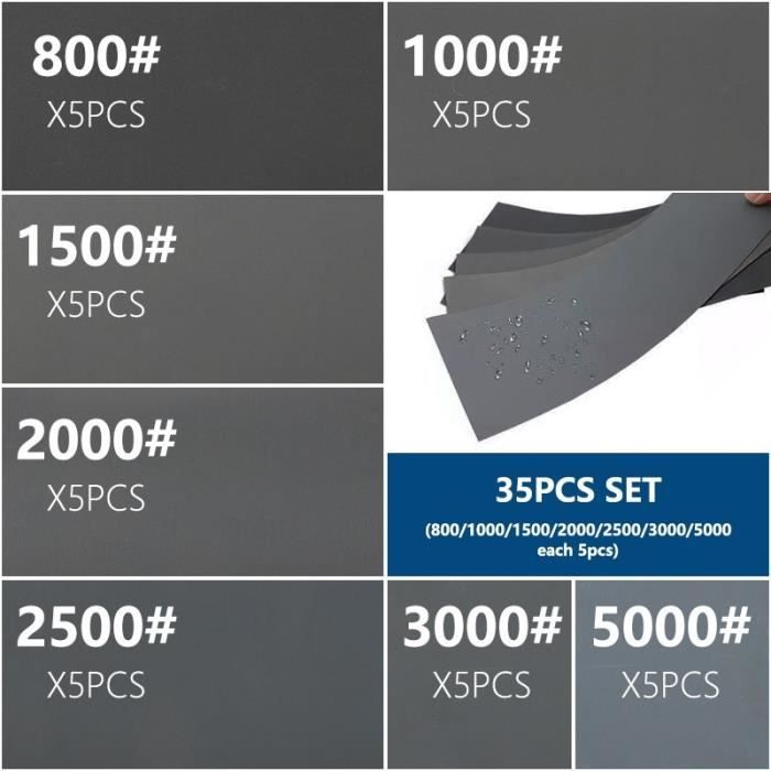 Lot complet de 42 feuilles de papier de verre : Inclus 7 grains différents (400, 600, 800, 1000, 1200, 1500, 2000), parfaits pour des finitions précises. Le grain 400 permet un ponçage plus abrasif pour enlever les imperfections, tandis que les grains supérieurs (jusqu’à 2000) assurent un rendu lisse et une finition parfaite. Utilisez les grains les plus fins pour polir des surfaces délicates, entre les couches de peinture ou de vernis, ou encore pour un rendu brillant sur métal ou plastique. Que ce soit pour un usage domestique ou professionnel, la qualité et la diversité des grains vous garantissent un résultat soigné et précis à chaque étape. Ce format est idéal pour une utilisation manuelle ou avec des blocs de ponçage. De grossier à fin, vous pouvez répondre à presque toutes les exigences de polissage. Il est léger, adapté pour les travaux de ponçage à long terme et peut... Il offre une finition lisse et uniforme. Elles sont parfaites pour la finition de meubles, la restauration d’objets anciens, la réparation de rayures ou encore le modélisme. 7 grains variés pour une polyvalence maximale, Le set comprend 7 grains différents : 400, 600, 800, 1000, 1200, 1500 et 2000, chacun en 6 exemplaires, soit 42 feuilles au total. Papier De Verre Pour Bois Métal Voiture Papier De Verre 120 220 320 400 600 800 1000 1200 1500 2000 2500 3000 Grain Papier Abrasif Humide Et Sèche, 36 Feuilles De Ponçage 9 X 3,6 Pouces Par Feuille Papier De Verre Fin 72 Pièces Papier de Verre Sec Humide 400 600 800 1000 1200 1500 2000... Spécial papier à poncer carrosserie : Ce papier à poncer carrosserie est adapté au ponçage humide ou à sec, parfait pour enlever les rayures, lisser la peinture ou rénover la surface d’un véhicule. Papier abrasif 9x3,6 pouces multi-grains : Le set comprend du papier abrasif 9x3,6 pouces décliné en 7 grains, permettant un travail progressif du ponçage grossier au polissage fin. Ce papier à poncer 9x3,6 pouces est parfait pour les coins et les petites surfaces, facile à découper et à manipuler. Papier abrasif carrosserie haute performance : Fabriqué en oxyde d’aluminium, ce papier poncer 9x3,6 pouces offre une abrasion régulière. KITEOAGE 14 Papier de Verre 9x3.6inch Papier a Poncer a l'eau 400 600 800 1000 1200 1500 2000 Idéal pour les finitions délicates sur divers matériaux. Idéal pour la carrosserie automobile, le polissage du métal ou le travail de précision sur bois verni. Large éventail d’applications, Ces feuilles conviennent à une variété de matériaux : bois, métal, plastique, cuir, verre, céramique, carrosserie de voiture, résine, etc. Faciles à découper, ces feuilles s’adaptent également aux coins et aux zones difficiles d’accès.