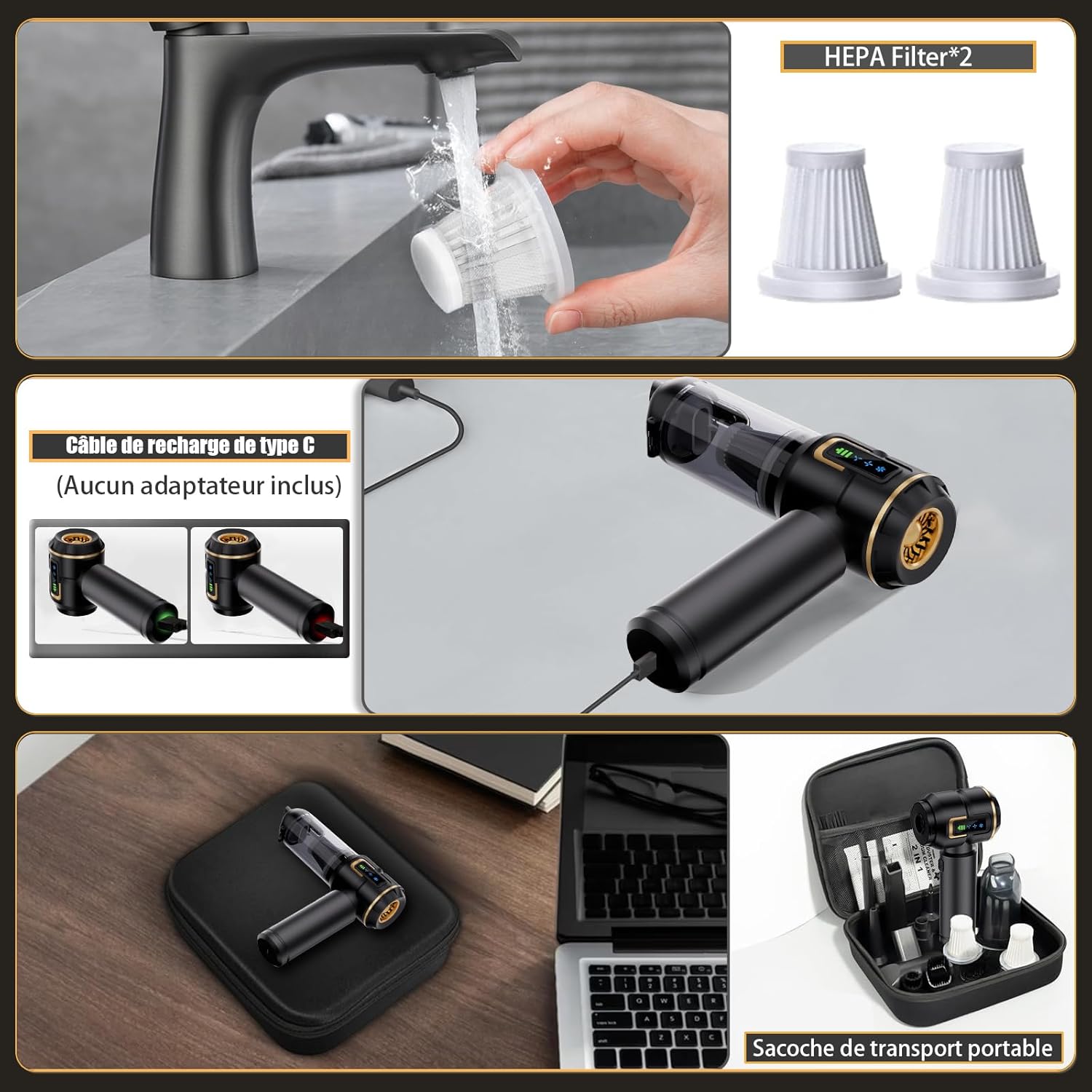 PUISSANTE|Nettoyage Sans Effort: Moteur sans balai 28 000Pa|Aspiration réglable (28 000 / 21 000Pa)|Convient à tous types de surfaces|Idéal pour : Siège Auto|Tapis|Poils Animaux|Poussière Maison Chargement de type C 9 Accessoires Multifonctions Aspirateur à Cendre,Aspirateur à Main Sans Fil Puissant Portable 120W 2200mAh Avec Fonction Huimide & Sèche Filtre HEPA Lavable Et 5 Buses Rechargeable Meilleur Aspirateur Pour Voiture Aspirateur à Main ACELIFE 18000Pa Aspirateur Voiture Puissant sans Fil 3 Vitesses 80,000U/min · Aspirateur à Main Sans Fil - USB Rechargeable - 100W/9500Pa... pour la voiture, les canapés, les claviers, et plus encore. 28000Pa Aspirateur Voiture Puissant sans Fil Vidéo de marchand Deux réglages de puissance d'aspiration : moyen (21 000 PA) et élevé (28 000 PA). CADEAU PRATIQUE|Compact & Élégant: Format mini, poids plume 0,99 lb|Design moderne|Parfait cadeau pour : Nouveaux conducteurs|Amis|Familles|Passionnés de voiture Combien de temps dure la charge ? Cet aspirateur de voiture a un temps de charge de 4 heures et peut fournir jusqu'à 20 à 30 minutes d'autonomie de batterie pour passer l'aspirateur. Stockez plus et plus grand 4 EN 1 MULTIFONCTION|Accessoires Inclus: Aspirer|Souffler|Gonfler|Pomper|9 embouts polyvalents|Parfait pour : Parents|Voyageurs|Conducteurs|Camping-Caristes Avec un traitement de réduction du bruit, le niveau de bruit est inférieur ou égal à 65 dB. Est-ce un aspirateur puissant ? La puissance d'aspiration est de 28 000 Pa, avec une batterie de 2 x 3 000 mAh et un poids de 449 g. Il nettoie efficacement les... Que dois-je faire en cas de problème avec le produit ? Veuillez contacter le centre des vendeurs et nous vous répondrons dans les plus brefs délais ! FILTRES HEPA|Air Plus Pur: Filtre HEPA lavable + filtre métallique|Capture 99 % allergènes et poussières fines|Bac à poussière 0,2 L|Vidage hygiénique en un clic Le grand bac à poussière de 200 ml réduit la fréquence de vidage, garantissant un nettoyage efficace. Aspirateur à Main Sans Fil 3 En 1, 120 W 12 000 Pa, Compatible Voiture Bureau Maison Aspirateur Eau Et Poussiere Souffleur Multifonction Gris 92391689