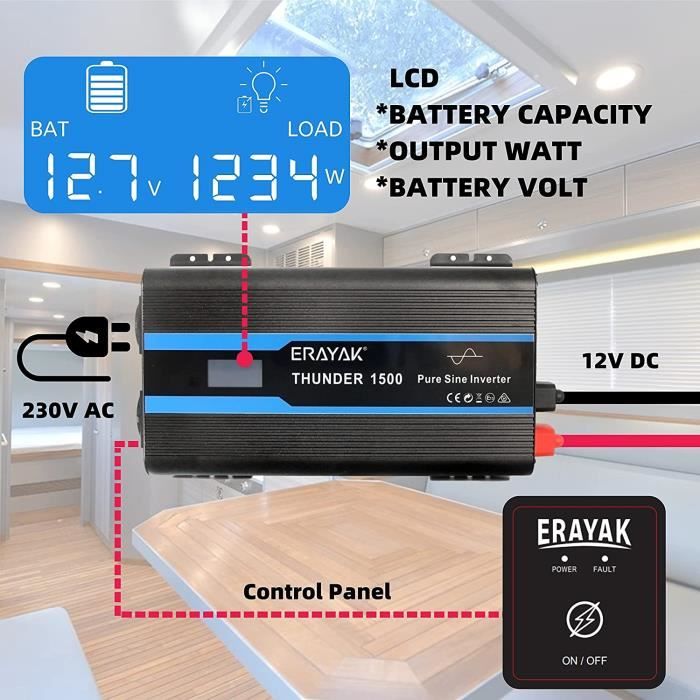 L'onduleur Erayak DSU produit une tension de haute qualité La qualité de la forme d'onde en sortie d'un onduleur à onde sinusoïdale pure détermine la qualité de l'alimentation électrique. Onduleur Avec Télécommande Convertisseur 12V-/230V Pur Sinus 1000W - Équipement Caravaning Convertisseur 12V 230V Pur Sinus 1000W ERAYAK 【Onde Sinusoïdale Pure Stable】 La série Erayak DSU utilise des composants électroniques de haute qualité, une conception de circuit avancée et un excellent système de dissipation thermique pour garantir que la forme d'onde DSU1000 n'est pas déformée et protège les appareils électriques sensibles. Si quelque chose se passe mal pendant la période de garantie, comment Erayak protège-t-il mes droits ? Si des problèmes surviennent pendant la période de garantie, nous avons des ingénieurs professionnels pour analyser la cause du problème pour vous, et des stations de réparation européennes fournissent des services. Qu'est-ce que cela signifie pour la série Erayak DSU de réussir l'examen EMC ? La série Erayak DSU a passé avec succès les tests EMC, ce qui signifie qu'elle exclut efficacement toutes les interférences électroniques, garantissant des performances fiables et une alimentation stable. Les économies d'énergie et le silence sont tous deux pris en compte pour garantir les performances. La série DSU dispose de 12 fonctions de protection, qui protègent non seulement l'intérieur du DSU1000, mais protègent également la batterie et les appareils électriques utilisés. L'écran d'affichage LCD et le panneau de commande à distance de 6 m sont pratiques. Les différentes marques d'onduleurs à onde sinusoïdale pure présentent des différences dans la qualité de leur forme d'onde. 1 Conversion 90 % 2 EMC Performance 3 Adaptabilité 4 Performances Stables 5 Compatibilité Pourquoi ne puis-je pas démarrer un appareil d'une puissance nominale de 1000 W ? Les équipements électriques peuvent nécessiter brièvement deux à trois fois leur puissance nominale. 【Télécommande 5 m & Protection】 La télécommande de 5 m vous permet de contrôler facilement l'interrupteur à distance, ce qui rend votre travail plus pratique. Convertisseur Pur-Sinus - 12V / 230V Eza - 679 3000W 12V 220V 50hz-Onduleur À Onde Sinusoïdale Pure Transformateur De... La forme d'onde de haute qualité d'Erayak le différencie des autres onduleurs. 12 fonctions de protection majeures pour protéger vos appareils électriques et vos batteries Que dois-je faire si je reçois un produit endommagé ou utilisé ? Erayak en assume la responsabilité et propose des solutions de remplacement satisfaisantes. Extrem niedrige Standby-Leistung (7 W), stabile reine Sinuswellen-Ausgabe, geeignet für alle empfindlichen Elektrogeräte.