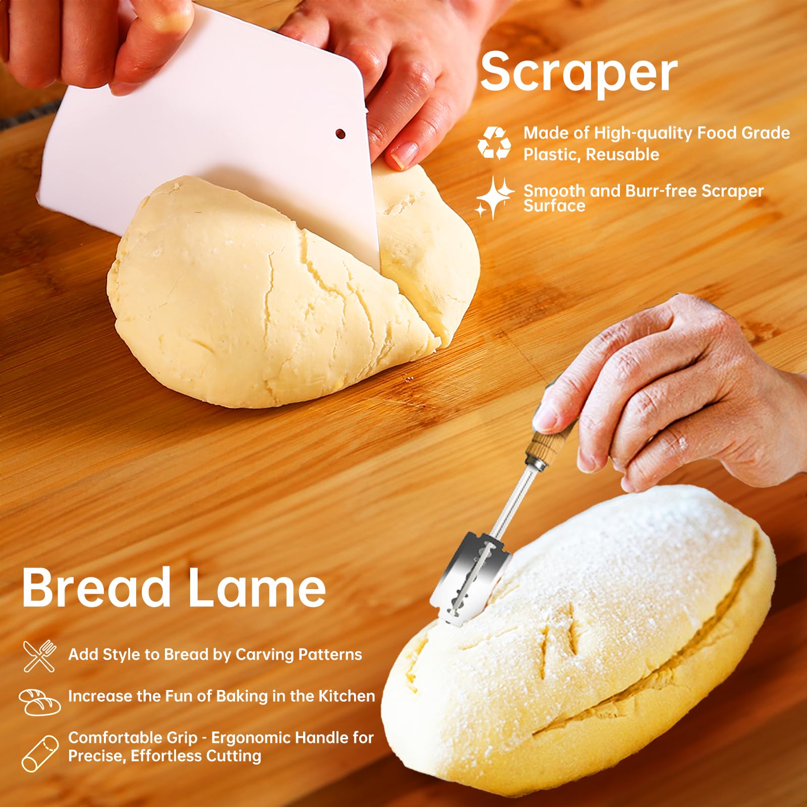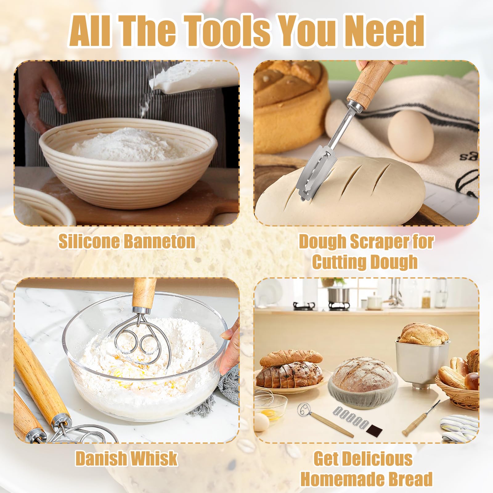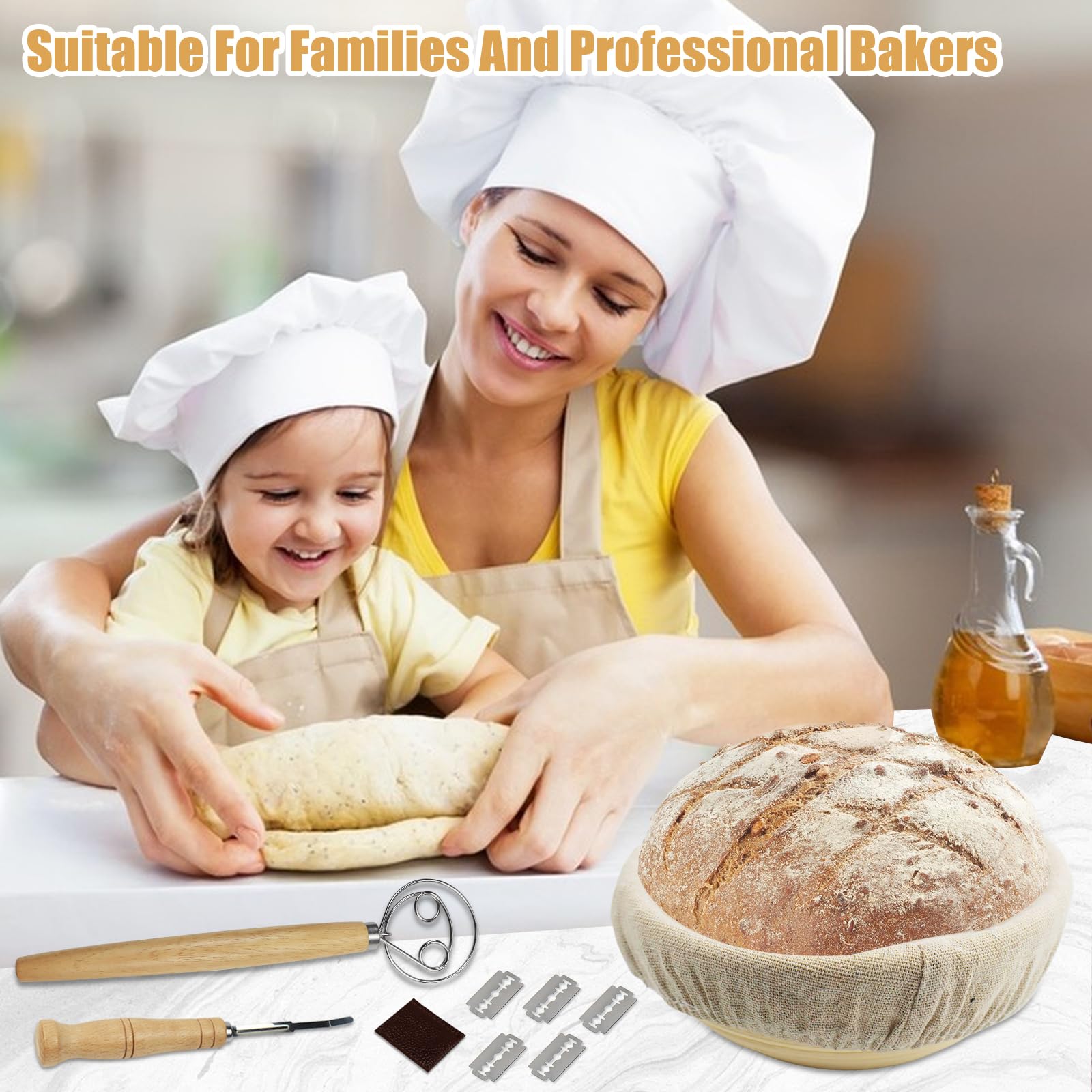 IDÉAL POUR ✔ Débutants en boulangerie et amateurs passionnés ✔ Boulangeries professionnelles et écoles de cuisine ✔ Tous ceux qui privilégient la slow fermentation et le fait main 【Excellente respirabilité】Ce banneton pour pain est tissé à partir d'une corde de coton enroulée pour une excellente respirabilité et une bonne absorption de l'humidité. 【Matériau de qualité alimentaire】Tissé à la main par des artisans qualifiés, ce panier de fermentation alimentaire est léger et pliable, grâce à sa poignée, ce qui permet de l'accrocher n'importe où dans la cuisine pour un rangement peu encombrant. Nettoyage facile : Lavable en machine et réutilisable (inclut 2 inserts remplaçables) Lame à Pain avec Manche en Bois,Lot de 2 paniers à pain ronds de 22 cm LE CADEAU PARFAIT Que ce soit pour un anniversaire, Noël – ce set de banneton pour pain haut de gamme ravira tous les amoureux de la pâte à pain et de l’artisanat traditionnel. Insert en lin respirant : Empêche la pâte de coller et est interchangeable astuces pour pétrir la pâte comme un pro : guide pour les débutants en... Polyvalent et joliment emballé, ce kit de cuisson du pain est un cadeau idéal pour la famille ou les amis, pour les anniversaires, les fêtes, les pendaisons de crémaillère, Noël et toute autre occasion. Description du produit Jukibole Banneton pour Pain 23cm, 27 Pièces Paniers à Pain Ronds Set pour Débutants, Passionnés de Pâtisserie 【Ensemble d'accessoires de pâtisserie professionnels 27 pièces】Comprend : 1 panier de fermentation rond (23 cm), 1 couteau à pain, 2 torchons de fermentation, 1 cornet à pâte, 1 fouet, 1 saupoudreuse à farine, 1 tapis de cuisson, 16 gabarits de cuisson, 1 brosse de nettoyage, 1 brosse en silicone et 1 spatule en plastique : tout le nécessaire pour la fabrication artisanale du pain ! Set Boulangerie 27 Pièces Banneton Pour Pain 23cm, 27 Pièces Paniers à Pain Ronds Set Banneton à Pain Ce banneton rond plaira aux amatrices et amateurs de pain fait maison ! En osier naturel et en toile de lin, il est idéal pour faire pousser la pâte à pain lors de l’apprêt (phase de pousse après le façonnage et avant la cuisson 【Facile à nettoyer et à entretenir】La doublure en lin doux et respirant absorbe l'humidité, empêchant la pâte de coller et garantissant un bon environnement de fermentation.