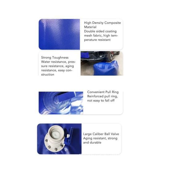 Conteneurs Portables Réfrigérateurs Avec Boîtes De Conserve Et Bouteilles Avec Unités De... Respectueux de l'environnement et réutilisable: ce conteneur d'eau pliable favorise la durabilité en réduisant le plastique à usage unique offrant une solution de stockage d'eau réutilisable facile à nettoyer, à stocker et à maintenir pour une utilisation répétée dans diverses situations extérieures et d'urgence Dispensage facile et conception portable: équipé d'un robinet convivial, ce sac d'eau permet une distribution sans effort sans déversements ni mess, et sa conception légère mais robuste permet un transport rapide et une configuration partout où vous avez besoin d'eau fraîche en déplacement Robinet Réservoir Eau Conteneurs De Stockage De La Vessie à Eau De 240 L, Réservoir D'eau Portable Pliable De Grande Capacité, Sac à Eau Souple, Résistance à La Sécheresse, Prévention Des Incendies, Eau D'urgence Sac Eau Potable Avec Robinet Matière résistante à la fuite: fabriquée à partir de PVC robuste, de PVC de qualité alimentaire et de tissu renforcé, cette vessie d'eau résiste aux perforations, aux rayons UV et aux fuites, assurant une fiabilité à long terme et un stockage d'eau potable sûr pour les VR, les camions et l'utilisation en plein air Répond aux besoins quotidiens : avec une capacité allant jusqu'à 330 L, cette vessie à eau répond facilement à vos besoins quotidiens en eau. Idéal pour un usage domestique, le camping ou l'irrigation du jardin. Léger et portable, il vous offre une expérience aquatique pratique Un design léger et pliable qui simplifie le transport et le stockage tout en favorisant la durabilité grâce à sa construction réutilisable et respectueuse de l'environnement adapté aux aventures en plein air, à la préparation aux urgences et aux besoins polyvalents de confinement de l'eau., ., Fonctionnalités:., ., -Color: ., ., -Material: PVC., ., -Size: 80x43x34 cm / 31., 50x16., 93x13., 39 pouces., ., -Capacité: 110L., ., Remarque: Mesure manuelle, veuillez laisser de légères erreurs sur la taille., ., Les couleurs peuvent exister une légère différence en raison de différents écrans., ., Package comprenant 1 * Vessie de stockage d'eau GRAND RÉSERVOIR D'EAU Conteneurs De Stockage Seau Pliant Manquer EUR 14