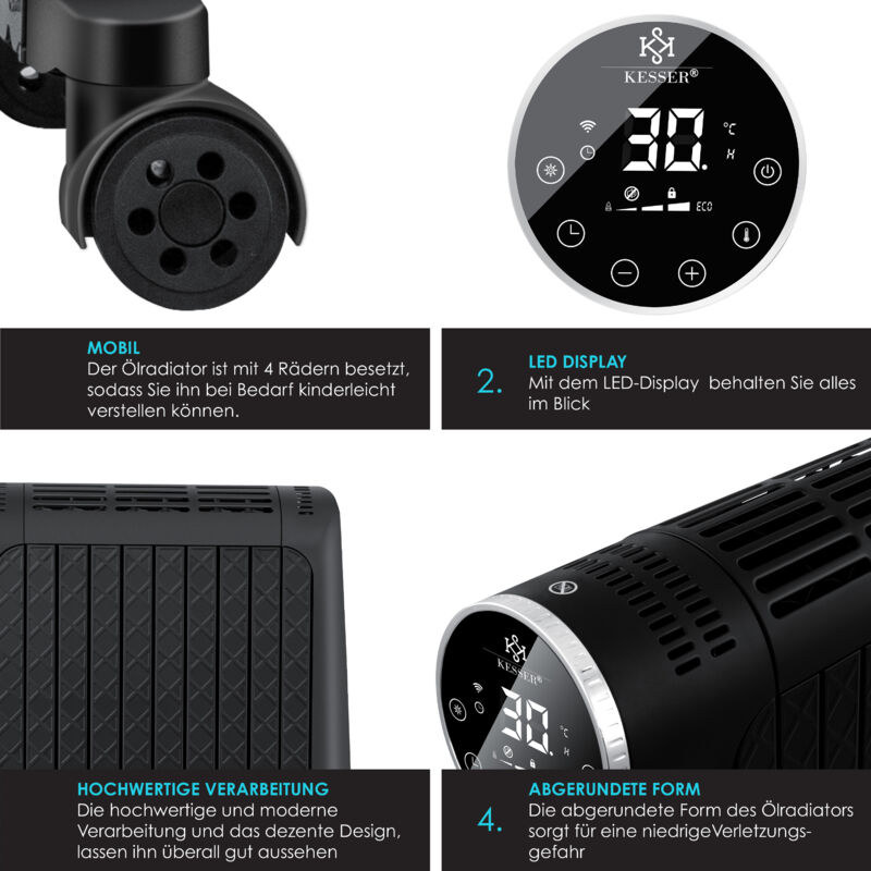 Grâce à la technologie d'huile thermique intégrée, la chaleur générée est répartie uniformément dans la pièce et reste agréablement diffusée même après l'arrêt. Le remplissage d'huile thermique conserve la chaleur et la restitue longtemps après l'arrêt. Pas de ventilateur : chauffage sans poussière, idéal pour les personnes allergiques Avec boîtier de protection, sûr pour les enfants et visuellement attrayant. Fonctionnement silencieux : parfait pour les zones de couchage ou de travail. Facile à utiliser : avec des roulettes pivotantes à 360°, un design compact (23 × 50,6 × 63 cm) et une longueur de câble de 1,7 m, le radiateur à huile peut être facilement installé dans n'importe quelle pièce. Ainsi, la pièce reste agréablement chaude plus longtemps et la consommation d'énergie est réduite. Radiateur Sécurité Enfant Radiateur à Huile Orbegozo RH 2500 2500W 11 Éléments Blanc Roues Pivotantes Radiateur Huile Avec Roulettes Radiatr à huile 2500 W avec affichage numérique - 10 ailettes, minuterie, 4 réglages de chalr et télécommande | Livraison gratuite | Brise Pro La technologie d'huile thermique assure une dissipation durable de la chaleur. Roulettes pivotantes à 360° Protection contre la surchauffe et arrêt automatique pour une sécurité maximale Compact et peu encombrant, convient également pour les petits espaces. Idéal pour les solutions de chauffage temporaires, les petits appartements ou les utilisations mobiles si nécessaire. Équipé de huit ailettes de chauffage efficaces, ce radiateur à huile offre une chaleur rapide et homogène pour les pièces mal chauffées ou pour des séjours... Taille de la pièce : convient pour jusqu'à 25 m² Technologie : système de chauffage à huile thermique Dimensions : 23 × 50,6 × 63 cm (L × l × H) Longueur du câble : 1,7 m Mobilité : roulettes à 360° Fonctions de sécurité : arrêt automatique, protection contre la surchauffe Volume sonore : très silencieux en fonctionnement Lieu d'utilisation : intérieur Contenu de l'emballage : 1 radiateur à huile électrique KESSER 1 boîtier de protection pré-monté 1 manuel d'utilisation (français non garanti). Le radiateur assure une chaleur constante sans dessécher l'air ni faire tourner la poussière. L'emplacement peut être modifié de manière flexible à tout moment, sans effort. KESSER Radiateur à huile 2500 w, avec application WiFi Smart Home et télécommande, écran LED, avec Minuterie et thermostat, protection... Utilisation : la régulation de la chaleur en continu offre trois niveaux de puissance (faible, moyen, élevé) et s'adapte de manière optimale à vos besoins en chaleur. Sans entretien et durable : idéal pour une utilisation quotidienne à la maison. Détails techniques : Puissance de chauffage : 2500 W 3 niveaux de chauffage.