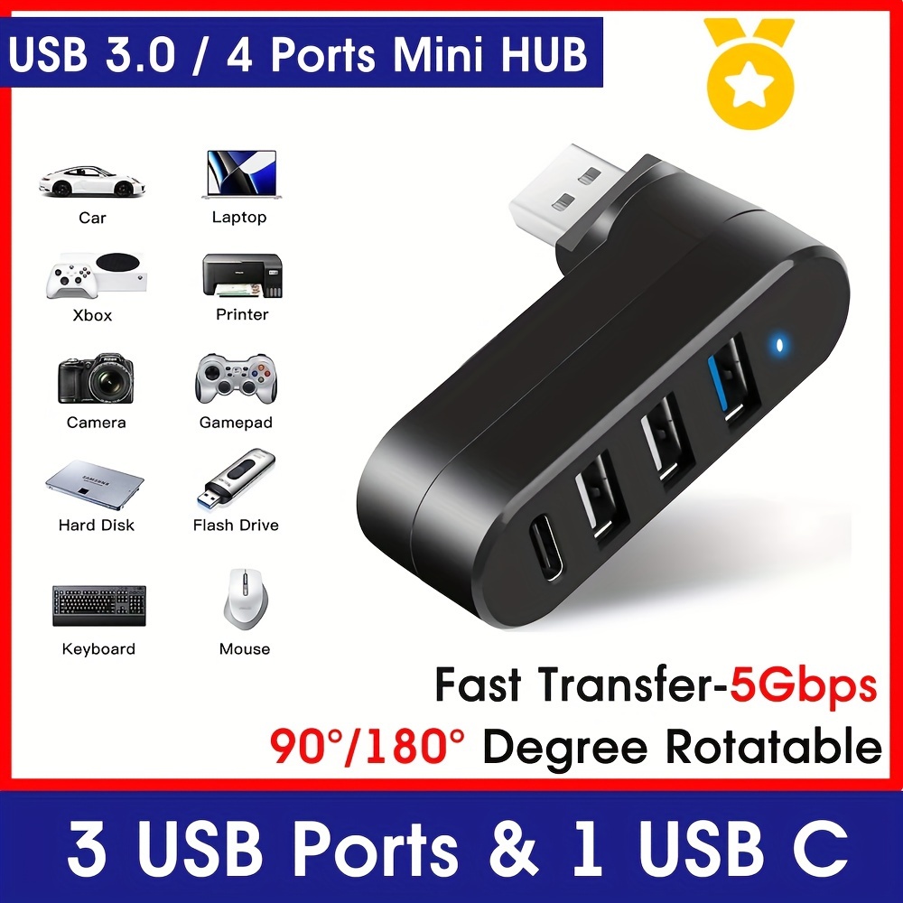 Hub Avec Port Type-C Hub USB 3.0 à 4 Ports Avec Port C (Splitter USB Avec 3 Ports Multi Port Usb Hub Usb-c À 4 Ports Avec Power Delivery - Usb-c Vers 4x Usb A Usb 3 0 5gbps 0065030867702 Le mini hub multiport ultra fin en aluminium à 4 ports étend instantanément un seul port de type C en un appareil multiport avec un transfert de données haut... Prend en charge jusqu'à 4 appareils indépendants fonctionnant en même temps. Vous pouvez connecter différents appareils à différents ports USB. Aucun pilote requis, plug and play, pratique et pratique. 【Fiable et durable】Structure Robuste et Portable Conçu en plastique ABS de haute qualité, ce hub 4 port USB multiple pour PC 90°/180° rotatif résiste aux chocs et à l'usure. 【Compact et Portable】De petite taille et léger, ce hub USB est facile à transporter dans une poche ou un sac. Idéal pour les voyages, le travail nomade ou une utilisation quotidienne à domicile. Et il est également très adapté pour une utilisation dans la voiture pour étendre les ports USB. Ce que vous obtenez]Vous pouvez obtenir ce hub USB avec une large compatibilité pour une large gamme d'appareils à port USB 3.0, ainsi que notre service convivial 24 heures et une garantie de 12 mois. Soyez assuré que nous soutenons nos produits et clients