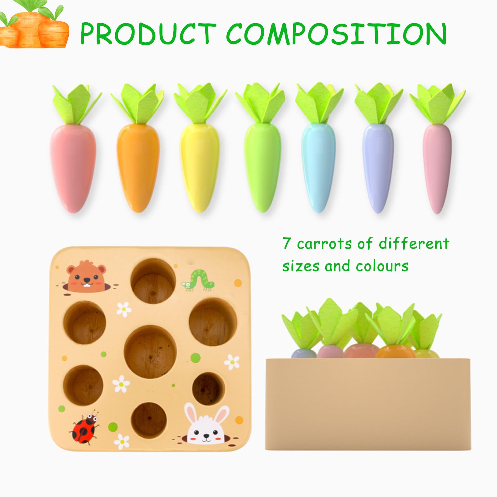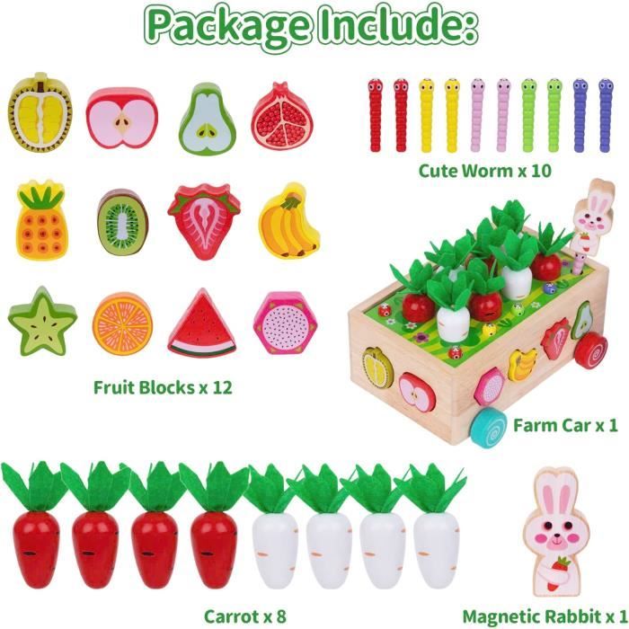 Ce jeu de tri et d'association est un excellent complément à l'apprentissage préscolaire, offrant un divertissement stimulant et éducatif. Jouet en Bois pour Bébé Montessori - Cadeau Enfant 1 an - Jeux... Associer des motifs colorés est idéal pour initier les enfants aux concepts mathématiques géométriques de base et stimuler leurs capacités sensorielles et motrices C'est également l'un des meilleurs jouets éducatifs pour les bébés de 1, 2 et 3 ans. Jouet Motricité Fine Jouets Montessori De 1 2 3 Ans Récolte De Carottes 5 En 1 Jouet En Jeu Tri Carottes Enfants [Jouets Montessori pour l'éveil précoce] - Ce jouet Montessori pour les enfants de 1, 2 et 3 ans est idéal pour développer la force de préhension, la motricité fine et la coordination œil-main. Ce jouet de tri en bois est idéal pour développer la motricité fine des enfants et améliorer leur reconnaissance des formes et des couleurs. [Matériau sûr et durable] - Ce jeu éducatif de tri de formes en bois est fabriqué en bois durable de haute qualité, avec une surface lisse, des bords et des coins soigneusement polis et des couleurs vives. [Contenu de l'emballage] - Le jouet de tri de formes Vingahouse comprend une base en bois et sept carottes en bois de différentes tailles. Parents et enfants peuvent jouer ensemble à la récolte des carottes ; cueillez les carottes récoltées et associez-les à la bonne position ; compléter un jeu d'association favorise l'interaction et le plaisir entre parents et enfants Ce jouet Montessori pour enfants de 1, 2 et 3 ans est idéal pour développer la force de préhension, la motricité fine et la coordination œil-main. Meilleurs cadeaux pour les tout-petits Les jouets Montessori Vingahouse sont le choix idéal pour les enfants de 1, 2 et 3 ans, comme cadeau d'anniversaire, de Pâques ou de Noël. Goujfol Jouets éveil ontessori Bois, 2 en 1 Pédagogique Epilable... Puzzle de tri en bois Couleurs et Formes pour 12 mois C'est également l'un des meilleurs jouets éducatifs pour les bébés de 1, 2 ou 3 ans Jeu Montessori 2 Ans Jouets éducatifs En Bois Pour ToutPetits Jouets Carottes Récolte Jeu De Jeu Enfant Croque Carotte