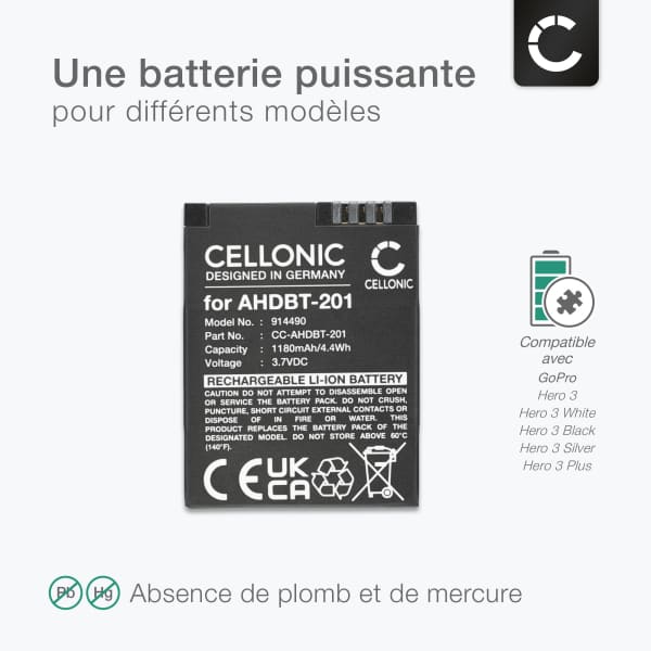 Des offres de produits similaires pourraient vous intéresser Vhbw Batterie Pour Gopro Hd Hero 4 Black Edition Surf 4 Silver 1160mah 11,49 € Livraison gratuite Vhbw Batterie Pour Gopro Hero 3 Iii White Edition 3 Iii Silver Edition 1180mah 12,79 € Livraison gratuite Vhbw 2x Batterie Pour Gopro Hd Hero 4 Black Edition Music 4 Plus 4 Black 1160mah 17,79 € Livraison... Batterie performante | Capacité : 1180 mAh | Tension : 3,7 Volt | Énergie : 4., 37 Wh | Type : Li-polymère Conforme aux normes légales | Finition de haute qualité | Utilisation durable Batterie Remplacement CHDHX-301 AHDBT-301 Li-Po Batterie Pour GoPro Hero 3 III 3 III CHDHX-301 3 III Black Batterie Rechargeable 1180mAh 3.7V REMPLACEMENT POUR : - 1ICP7/26/33-2, 601-00724-00ACHDHN-301, AHDBT-201, AHDBT-301, AHDBT-302 vhbw - Accessoires et pièces de rechange de haute qualité pour prolonger la durée de vie de vos appareils électriques. 183 résultats trouvés pour votre recherche Batterie Hero3 sur le comparateur de prix vhbw - the clever way - Batterie de rechange de haute qualité avec une grande autonomie et compatible avec votre caméra vidéo (vous trouverez ci-dessous tous les modèles correspondants) - La batterie peut être chargée avec le chargeur standard ou un chargeur compatible - Nos batteries répondent à toutes les normes de sécurité actuellesCONTENU DE LIVRAISON : - 1x batterieDONNÉES TECHNIQUES : - Technologie : Li-polymère - Capacité : 1180 mAh - Tension : 3,7 V - Énergie : 4., 37 Wh - Nombre de cellules : 1 - Hauteur : environ 1,5 mm - Poids : 24 g COMPATIBLE AVECGoPro Hero 3 III, 3 III CHDHX-301, 3 III Black EditionPour garantir la compatibilité, veuillez vérifier si votre batterie utilisée actuellement est répertoriée. Batteries et Chargeurs pas cher - Achat / Vente Accessoires Photo
