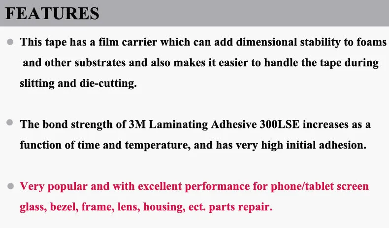 Beskikber yn diktes fan 0,06 en 0,13 mm mei ienkele of dûbele liner. Hiel goede UV- en waarsbestinding Ruban 5mm X 10m écran Tactile Ruban Adhésif 3 M 9495LE 300LSE - Transparent - Extra Scotch Fuite Eau Le support intermédiaire en PET renforce les surfaces flexibles, minimise les fuites de colle et simplifie les processus de découpe et facilite la manipulation grâce au papier de protection solide Koarte-termyn temperatuerresistinsje oant 175 °C., Kontinu oant 90 °C. Film adhésif transparent très fin : 0,07 mm d'épaisseur pour un collage presque invisible, durable et ajusté, ruban adhésif de transfert siliconé des deux côtés et revêtu de polyéthylène / adhésif acrylique sans solvant de la série 200 LSE / résistant au climat Lijmrige - Foar hege temperatueren en oerflakken mei lege enerzjy Hiel geskikt foar in protte oerflakken mei hege en lege enerzjy, Uitstekende skuorsterkte De kleur fan 'e kleefstof is transparant mei in hiel lichte giele tint, dy't normaal net sichtber is yn ien laach kleefstof. Hege kleefsterkte mei lege kleefdikte, Leech geur, Minimalisearre lijmlekkage (lijmbleeding) Uitstekende direkte hechting oan skom, stof, filt, nylon, tapyt, lear, glêstried en hout Koarte termyn temperatuerresistinsje oant 200 °C., Permanint oant 150 °C Hege transparânsje en goede UV-resistinsje Goede skuorsterkte en goede gemyske wjerstân Koarte-termyn temperatuerresistinsje oant 230 °C., Permanint oant 150 °C Peel-off ferset en goede duorsumens op bûgde oerflakken Lijmrige spesjaal ûntworpen foar skuim en oare strukturearre materialen Hege skuorsterkte op tekstuerde of rûge oerflakken en in protte oare materialen Goede wjerstân tsjin weekmakers Film adhésif transparent très fin : 0,07 mm d'épaisseur pour un collage presque invisible, durable et ajusté, ruban adhésif de transfert siliconé des deux côtés et revêtu de polyéthylène / adhésif acrylique sans solvant de la série 200 LSE / résistant au climat Goede wearde foar jild Lijmrige foar grafyske tapassingen Goede hechting oan hege-enerzjy oerflakken Pour des applications professionnelles - Convient pour le collage ou l'équipement autocollant d'inscriptions, d'emblèmes, de panneaux et de moulures, écrans tactiles, écrans de téléphone portable, derrière les panneaux avant enfoncés, étiquettes - Idéal pour la pose graphique et les applications de commutation à membrane Ruban adhésif double face 10 mm x 15 m 9495LE Adhésif puissant 300LSE Transparent pour Fiberfersterke lijm makket ferwurking en ôfhanneling makliker Produktfunksjes Koarte termyn temperatuerresistinsje oant 205 °C. Earsteklasse prestaasjes op licht oaljeftige en poeiercoate oerflakken 12 M Ruban Adhésif Double Face Extra Fort Transparent, 4 Pièces Double Face Puissant Double... Koarte termyn temperatuerresistinsje oant 120 °C., Kontinu oant 70 °C. Dimensjoneel stabyl en ferbettere handling Gjin lijmstream yn waarme omjouwings, kin op koarte termyn opnij pleatst wurde ★★ Sur différents matériaux ★★★ Convient pour le métal, le bois, le verre, les plastiques à haute énergie et les surfaces peintes, les panneaux, les emblèmes, les moulures et les décorations