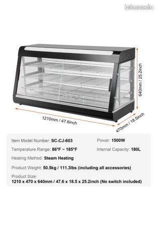 Elle est idéale pour contenir et conserver des pizzas, des tartes aux œufs, du poulet frit ou des hamburgers, assurant ainsi que les aliments restent frais pendant longtemps. Découvrez Vitrine chauffante commerciale à 3 niveaux, 800 W, avec éclairage LED, étagère réglable et structure en acier inoxydable, chauffage par air de 30 °C à 85 °C, capacité de 34 L pour hamburgers, pizzas, pains et poulet frit., Lumière chaude LED et Pieds antidérapants au prix le plus bas, livraison en 2 jours, retours en 30 jours Haute durabilité : la structure robuste en acier inoxydable résiste à la rouille et à la corrosion, ce qui lui permet de conserver sa forme lors de la conservation de grandes quantités de nourriture sur de longues périodes. L'extérieur de l'armoire chauffante est doté d'un écran d'affichage de la température et d'une sonde de capteur de température interne vous permettant de surveiller la température en temps réel, assurant ainsi une rétention de chaleur plus précise. Chauffage Vevor 2kw VEVOR Vitrine Chauffante Commerciale 3 Niveaux, Presentoir A Chaud 1500 W Avec Lumiere Etagere Reglable Et Affichage De La Temperature Chauffage A Vapeur 30 85 130 L Pour Hamburger Pizza Pain 85056899 équipement Restauration Rapide 80l Les lumières LED tricolores intégrées à l'intérieur de la vitrine rendent vos aliments lumineux et attrayants. Choisissez le présentoir chauffant pour aliments de VEVOR pour faire passer votre entreprise au niveau supérieur. Conservation de la chaleur : équipé d'un bac à eau intégré de 0,5 L, l'ajout d'eau fournit une humidité parfaite pour les aliments, évitant ainsi un dessèchement excessif causé par le chauffage et préservant la meilleure texture des ingrédients. Les pieds antidérapants au bas assurent la stabilité. Les bords lisses évitent les rayures pendant l'utilisation. Le mode thermostat maintient les aliments à la température sélectionnée pour éviter la surchauffe, ce qui le rend idéal pour la restauration commerciale. Notre vitrine de comptoir est dotée de 3 étagères spacieuses de qualité alimentaire, vous permettant de placer librement différentes tailles d'aliments. VEVOR Vtrne Réfrgérée Commercale 901L, Vtrne à Pâtssere 4... CaractéristiquesContrôle de la températureLe régulateur de température ajuste les températures de chauffage entre 30℃ et 85℃. Idéal pour les cafétérias, les boulangeries, les cafés, les fast-foods et les supérettes. Comptoir vitrine panoramique chauffante 4 niveaux sans réserve noir