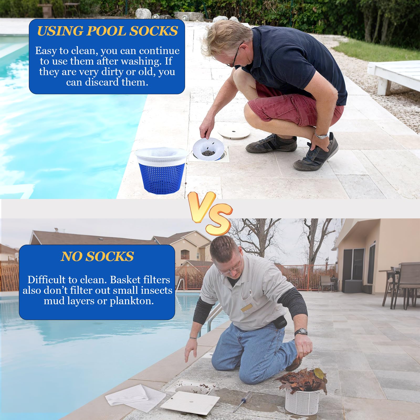 Diamètre adapté : 7 à 19 cm (extensible) Avantages : Économique + résistante + compatible universel + filtration efficace Plus de stress pour manquer de filtres – vous disposez d’un stock suffisant pour profiter pleinement de l’été, qu’il s’agisse d’une piscine privée, d’un spa ou d’un bain à remous. Les chaussettes skimmer piscine résistent aux lavages (à l’eau, à la main ou en machine) et ne se déforment pas facilement, contrairement aux modèles fragiles. Elles fonctionnent comme un filet skimmer piscine efficace, mais attention : évitez le contact avec les pastilles de chlore pour préserver le nylon. En tant que filtre skimmer piscine panier essentiel, elles réduisent l’usure de votre filtre, économisent les coûts d’entretien et maintiennent l’eau cristalline. 🌊 Filtration Efficace – Évitez les Verstopfages Elles piègent efficacement tous les débris : feuilles, herbe, cheveux, pollen, insectes et petites particules, avant qu’ils n’atteignent votre système de filtration. Elles résistent aux lavages (à l’eau, à la main ou en machine) sans se déformer ni se déchirer – contrairement aux modèles fragiles. Chaussette Skimmer Piscine - Non spécifié - 20 Pièces - Élastique... Ces chaussette skimmer piscine sont aussi pratiques à entretenir : rincez-la avec un pistolet à eau ou remplacez-la si elle est trop sale. Ces chaussettes pour skimmer idéales pour l’été évitent le stress du manque de filtres, permettant de profiter pleinement de votre piscine avec des chaussette de skimmer fiables. 🔥 Pack de 15 Chaussettes Réutilisables – Votre Solution Efficace pour une Piscine Cristalline ! Chaussette Skimmer Piscine, 15 Pièces Pool Skimmer Socks Chaussette Skimmer Piscine Filtres En Tissu Skimmer De Surface Pour Piscine Pour Panier 48967 B Conseil : évitez le contact direct avec les pastilles de chlore pour préserver sa durée de vie. Elles conviennent aux piscines en béton, en liner, aux marques comme Intex, ainsi qu’aux spas et bains à remous. Pas de recherche de modèle spécifique – elles fonctionnent partout ! Elles sont parfaits comme chaussette filtre piscine robuste pour tous les usages., 3., Large Compatibilité🔄:Conçues pour s’adapter à la plupart des paniers de skimmer, pompes de piscine et filtre skimmer, ces chaussettes pour skimmer ont un diamètre extensible permettant une installation rapide sur tous les modèles standard. Matériau : Nylon ultrafine et élastique Ce pack de 15 chaussettes skimmer réutilisables est conçu pour alléger votre routine d’entretien : remplacez-les facilement toutes les 4 à 8 semaines (ou plus souvent si votre piscine est très polluée). KGC Chaussette Skimmer Piscine 20 Pièce, Chaussette Skimmer... Netskim Chaussettes Skimmer 30 Pièces Chaussette Skimmer Piscine, Réutilisable Chaussettes Filtre Chaussette Skimmer Piscine Panier Tech-Snapshot pour les Pressés : Quantité : 15 chaussettes réutilisables Que ce soit avec des chaussettes skimmer ou chaussettes piscine skimmer, l’efficacité est garantie., 5., Installation Simples⏱️:Faciles à installer en quelques secondes : glissez simplement la chaussette pour skimmer sur le panier de skimmer. 🔄 Large Compatibilité – S’Adapte à la Plupart des Modèles Conçues pour être universelles, ces chaussettes s’installent en quelques secondes sur la plupart des paniers de skimmer, pompes de piscine et filtres standard.
