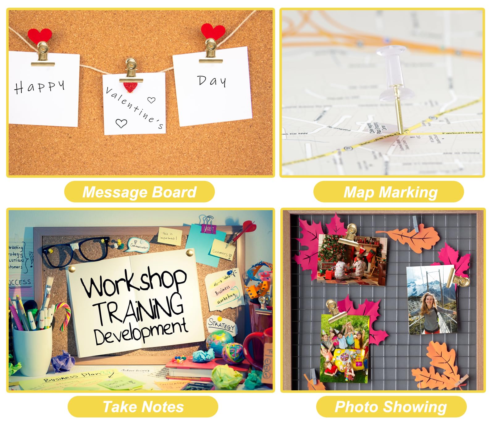 Matériaux : métal, plastique. Lot de 100 pièces en métal de qualité, longueur 23mm. La couleur dorée donne un look élégant à votre tableau en liège. Super pratiques pour organiser votre... Que ce soit pour sécuriser des notes, des photos ou des décorations légères, elles restent fermement en place, conçues pour une utilisation à long terme Quatre options de couleur : disponibles en or, or rose, argent et noir, ces punaises répondent à divers besoins de décoration, complétant facilement le style visuel des bureaux, des maisons ou des écoles tout en combinant fonctionnalité et esthétique. Lot Punaises Tableau Liège Lot De 310 Punaises Dorées En Métal Pour Tableau En Liège, Carte Lot Punaises Métal Bureau Ce lot abondant de punaises est plus que suffisant pour répondre aux besoins de votre bureau Que ce soit pour sécuriser des notes, des photos ou des décorations légères, elles restent fermement en place, conçues pour une utilisation à long terme. Contenu de l'emballage : 310 punaises La boîte légère est portable, vous aidant à maintenir un espace bien rangé et organisé, que ce soit dans un tiroir de bureau, un poste de travail à domicile ou un bureau de classe Facile à utiliser : la punaise décorative dorée peut facilement attacher le produit au tableau en liège et peut être insérée directement, la punaise avec clip peut maintenir le papier ensemble sans glisser, et le crochet à punaises peut également facilement accrocher 9 kg de produits, ce qui est facile à utiliser La boîte légère est portable, vous aidant à maintenir un espace bien rangé et organisé, que ce soit dans un tiroir de bureau, un poste de travail à domicile ou un bureau de classe. Ces punaises maintiennent en toute sécurité des articles légers tels que des notes, des photos et des papiers, ce qui les rend idéales pour l'organisation quotidienne, les affichages ou l'étiquetage temporaire. Applications polyvalentes : adaptées pour les maisons, les bureaux, les écoles, etc. Ces punaises maintiennent en toute sécurité des articles légers tels que des notes, des photos et des papiers, ce qui les rend idéales pour l'organisation quotidienne, les affichages ou l'étiquetage temporaire Voir plus de détails Rangement facile : notre lot de punaises est livré avec un étui en plastique transparent à 5 compartiments, gardant chaque type d'épingle soigneusement séparé pour un accès facile et éviter les déversements. Ces punaises maintiennent en toute sécurité des articles légers tels que des notes, des photos et des papiers, ce qui les rend idéales pour l'organisation quotidienne, les affichages ou l'étiquetage temporaire 6 stickers en liège Etiquettes + 150 punaises dorées - Youdoit | Leroy