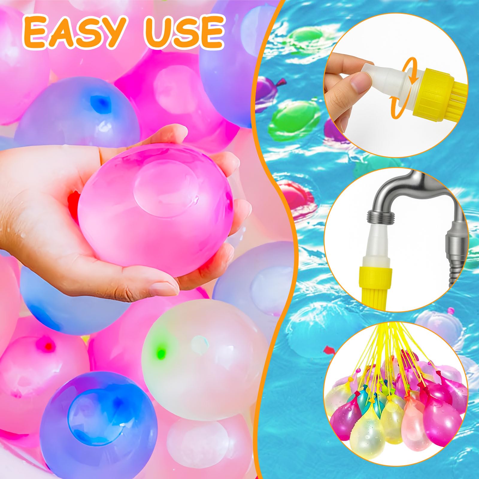 YUZHEDM Ballon d'eau Lot de 944 bombes à eau Bombe a eau Ballon avec Support de Remplissage pour Robinet Bombes à Eau Rapides à Remplir D'eau Bombes à Eau Avec Fermeture Automatique Une fois le ballon rempli d'eau, il suffit de déconnecter le tube pour commencer à jouer Kit Bombes à Eau 500 Pièces Bouquet De 37 Bombes à Eau Ballon Jeu D'été Avec Remplissage Facile Au Robinet - Jeux Jeux Eau été Plage Une fois le ballon rempli d'eau, il suffit de déconnecter le tube pour commencer à jouer Remplissage ultra-rapide: Grâce aux tubes et outils réutilisables, remplissez un sac entier de bombes à eau en seulement 60 secondes. Kit 250 bombes à eau PISTOLET_A_EAU_ - Jeux - Jouets YANSION 10PCS Bombes à eau à fermeture automatique 1 seconde Ensemble de bombes à eau à... Couleurs variées pour plus de fun: Les ballons sont disponibles dans une variété de couleurs éclatantes, ajoutant une touche de gaieté et de dynamisme à vos fêtes d'été, que ce soit à la piscine, dans le jardin ou à la plage Remplissage ultra-rapide: Grâce aux tubes et outils réutilisables, remplissez un sac entier de bombes à eau en seulement 60 secondes. Parfait pour l'été: Idéal pour les adultes et les enfants, ce kit est un incontournable pour les jeux d'eau en été. Insérez le tube dans le ballon, fixez-le avec un élastique, puis connectez l'outil de remplissage. Une fois rempli, le ballon se scelle automatiquement, vous permettant de passer plus de temps à jouer et moins de temps à préparer vos activités aquatiques Kit complet pour remplissage rapide: Comprend 500 ballons, 500 élastiques, 74 tubes de remplissage et 2 outils de remplissage.