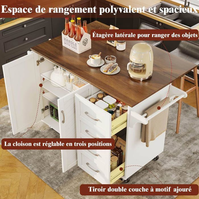 Il est doté d'une table pliable qui peut être dépliée pour servir d'espace de table supplémentaire, offrant ainsi une longueur totale de 71 cm lorsqu'elle est ouverte. La table pliable permet d'économiser de l'espace, tandis que le cadre métallique robuste garantit durabilité et élégance. Description du produit Ce Desserte cuisine avec roulettes, mesurant 128 cm de long, 46 cm de large et 92,5 cm de haut, est doté d'une table pliable offrant une longueur totale de 71 cm lorsqu'elle est dépliée, idéal pour optimiser l'espace dans les petites cuisines ou pour des repas occasionnels. Il dispose d'une grande tiroir, deux portes de placard, deux étagères ouvertes, un étagère à épices et un porte-serviettes intégrés, fournissant ainsi un espace de rangement abondant pour vos ustensiles et accessoires. Buffet Rangement Table Pliante Desserte De Cuisine Avec Roulette Universelles 67 X 37 X 82,5 CM Et Plateau En Bois Blanc/Noir/Gris Desserte Cuisine Roulettes Grâce à ses cloisons réglables et ses cinq roues (deux bloquantes et trois non bloquantes), il assure stabilité et mobilité. Si vous avez des questions ou des problèmes, veuillez nous contacter immédiatement. C'est la solution idéale pour garder votre cuisine organisée et ordonnée. Encombrement minimal : La table de ce desserte cuisine est spacieuse et parfaite pour la préparation des repas et les moments de convivialité. Desserte de cuisine 128x40x92,5cm, meuble de cuisine, étagères Informations sur le produit : Couleur principale :Blanc Matériau principal :Metal,MDF Style du produit : moderne Type de produit : meuble cuisine Pays d'origine : Chine Poids supporté : 60kg Taille du produit : Chariot de cuisine :128 x 46-71 x 92., 5 cm 41kg Remarque : ✅Toutes les dimensions sont approximatives,Des erreurs de 2 à 3 cm peuvent se produire. Veuillez faire preuve de patience et vérifier que tous les accessoires sont complets avant de procéder à l'assemblage. La table pliable permet d'économiser de l'espace lorsque cela est nécessaire, tandis que le cadre métallique robuste garantit durabilité et stabilité. Dimensions pratiques et polyvalence : Ce buffet cuisine mesure 128 cm de long, 46 cm de large et 92,5 cm de haut. SOLDES Découvrez le rayon DESSERTE en promotion avec des nouveautés toute l'année sur . Explorez nos modèles tendance, profitez des promos et trouvez facilement le produit idéal pour sublimer votre intérieur Montage facile : Livré avec notice détaillée, pièces numérotées et outils inclus pour un montage sans prise de tête. ... Dimensions pratiques : 129x46(71)x91,5cm... Pour réduire le risque de dommages pendant le transport, nous expédions ce chariot de rangement de cuisine en deux colis, qui peuvent ne pas arriver en même temps le même jour. Utiliser avec précaution près de sources de chaleur ou de liquides chauds. Faire preuve de prudence lors de l'utilisation de la table pliante pour éviter les blessures par pincement. Vérifier que tous les accessoires sont complets avant l'utilisation. Espace de rangement bien pensé : Ce desserte à roulettes dispose d'une grande tiroir, deux portes de placard et deux étagères ouvertes. Avertissement De Sûreté Ne pas dépasser la capacité de poids de 60 kg.