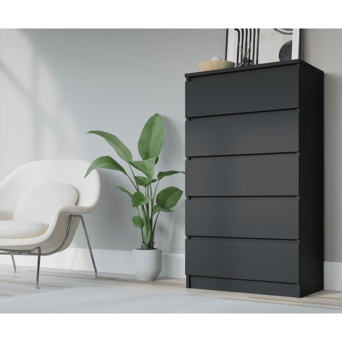 Assemblage facile et construction sûre - L'ensemble comprend des instructions détaillées et des accessoires de montage certifiés, et la possibilité de fixer la commode au mur augmente sa stabilité et sa sécurité. Commode En Bois 3E 3xE Commode Avec 3 Tiroirs, Couleur Meuble Rangement Contemporain 70x124cm Bords renforcés – recouverts d'un matériau PVC durable, résistant aux dommages mécaniques et chimiques. Rangement spacieux et fonctionnel - Une commode avec 5 tiroirs spacieux vous permet d'organiser facilement les vêtements, documents et autres objets, en leur offrant un accès facile à tout moment Les réclamations ne couvrent pas les dommages causés lors de l'installation. Rangement spacieux et fonctionnel - Une commode avec 5 tiroirs spacieux vous permet d'organiser facilement les vêtements, documents et autres objets, en leur offrant un accès facile à tout moment. Commode moderne étroite avec façade cannelée, Cette commode de 104 cm de long est un meuble fonctionnel pour le salon, la chambre à coucher ou l'entrée. Grâce à... La commode est livrée en deux colis : 1 x commode (éléments d'assemblage) 1 x jeu d'accessoires de montage + manuel Informations importantes Il est recommandé de fixer la commode au mur pour plus de sécurité. Données techniques Dimensions : Largeur : 70 cm Profondeur : 39 cm Hauteur : 125 cm Couleur : TOFFI Nombre de tiroirs : 5 Matériel : Corps et façades – panneaux de particules de 16 mm Le dos et le fond des tiroirs sont en panneaux de fibres Livraison et installation Le produit est destiné à l'auto-assemblage. Un design moderne qui s'adapte à tous les intérieurs - La couleur élégante TOFFI et la forme minimaliste permettent à la commode de s'intégrer parfaitement dans un décor scandinave et moderne, ajoutant un caractère esthétique à la pièce. Commode verticale Sésame 5 tiroirs Meq 5757 C5 L'ensemble comprend des instructions claires et un ensemble d'accessoires de montage certifiés. Ouverture douce et silencieuse des tiroirs - Grâce à l'utilisation de guides à rouleaux, chaque tiroir s'ouvre facilement et sans bruit, ce qui augmente le confort d'utilisation et garantit une commodité pendant de nombreuses années.